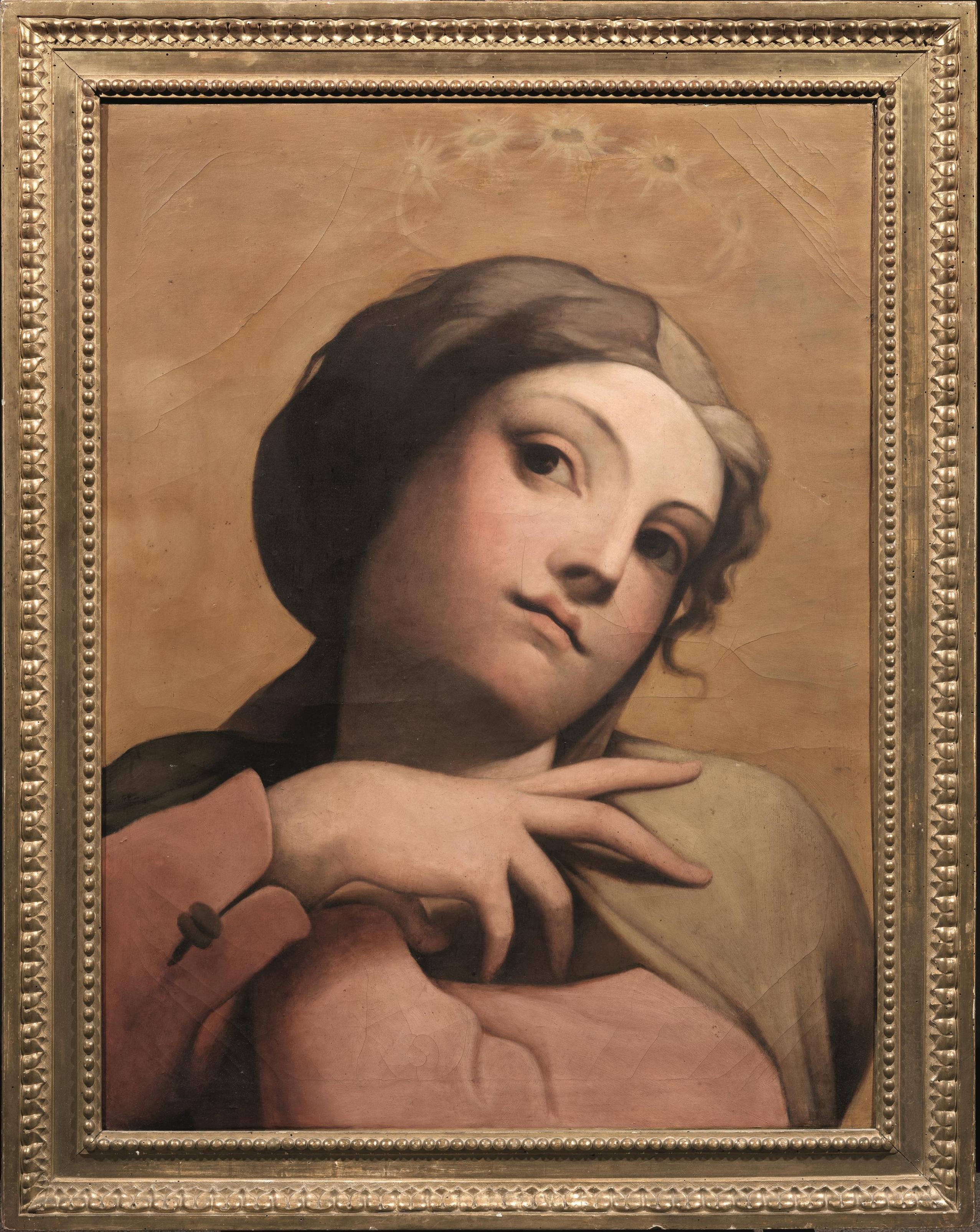 Il dipinto riprende il particolare della figura della Vergine dall’affresco staccato di Correggio raffigurante l’Incoronazione della Vergine, Galleria Nazionale, Parma