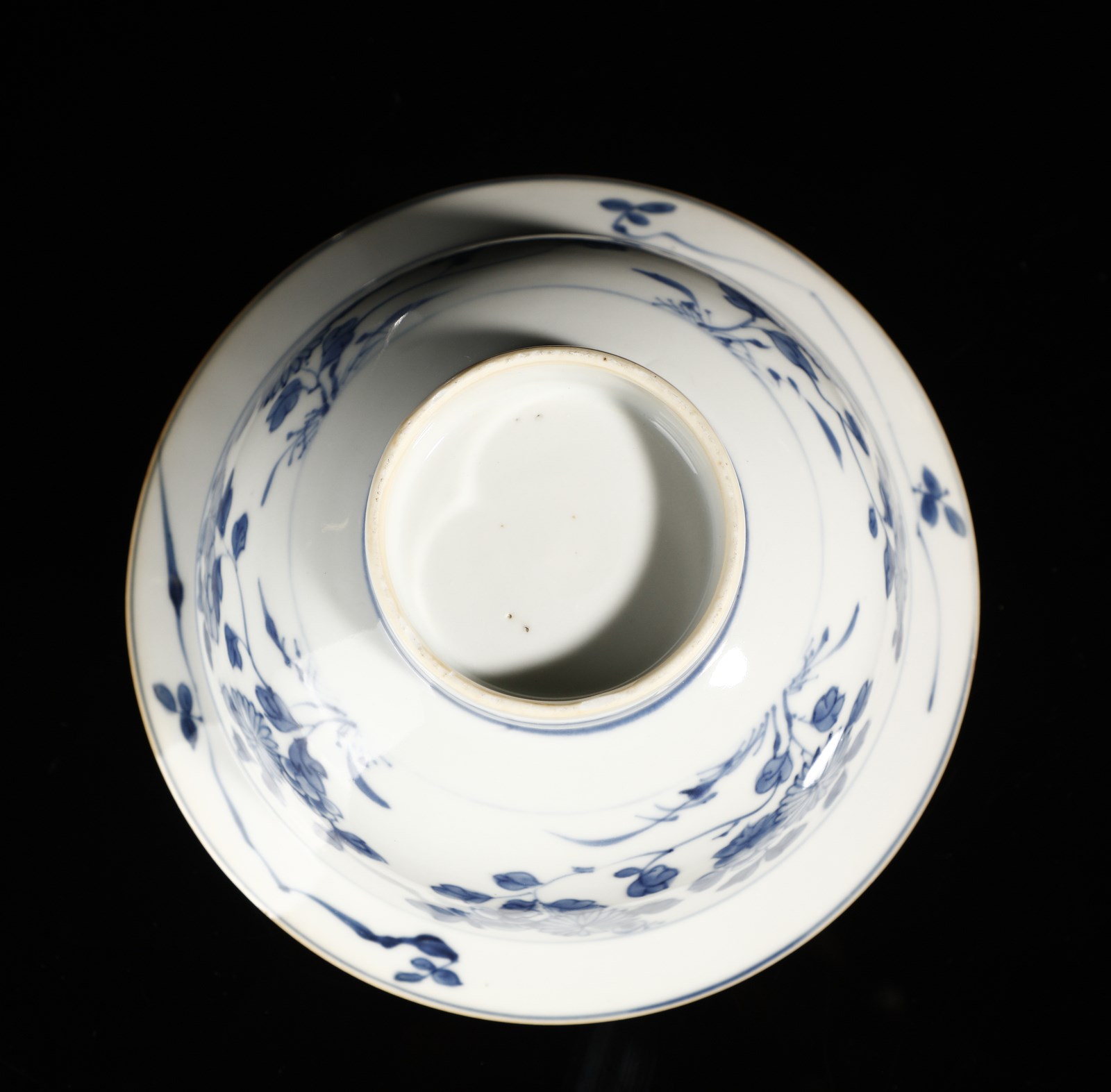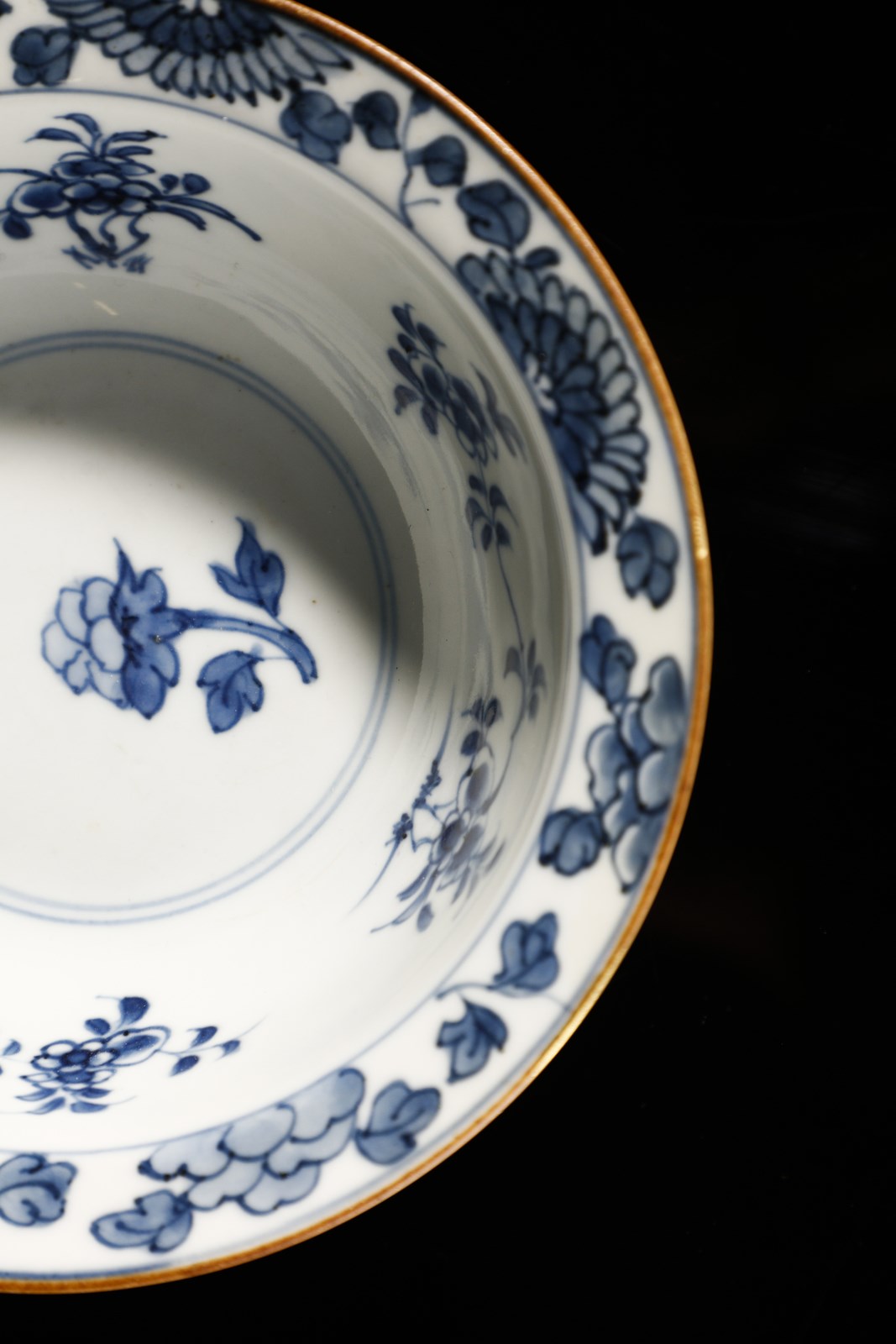 Cina, dinastia Qing, XVII secolo. . Cm 7,50 x 19,00. Tazza a tesa breve con bordo dorato, realizzata in porcellana bianca con decoro blu sottocoperta a motivi floreali. Questa forma, tipicamente cinese, caratterizzata dal cavetto profondo e stondato, è all'origine di una vasta produzione in gran parte destinata all'esportazione. Il tipo di decoro, rarefatto ed elegante risente dell'influenza dei canoni estetici in voga in Giappone in quegli anni ed è possibile che questo oggetto fosse destinato proprio a quel mercato.
