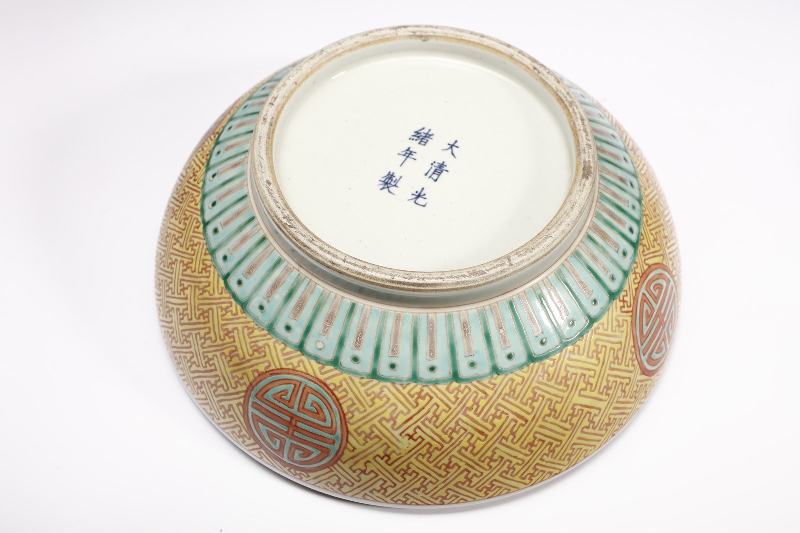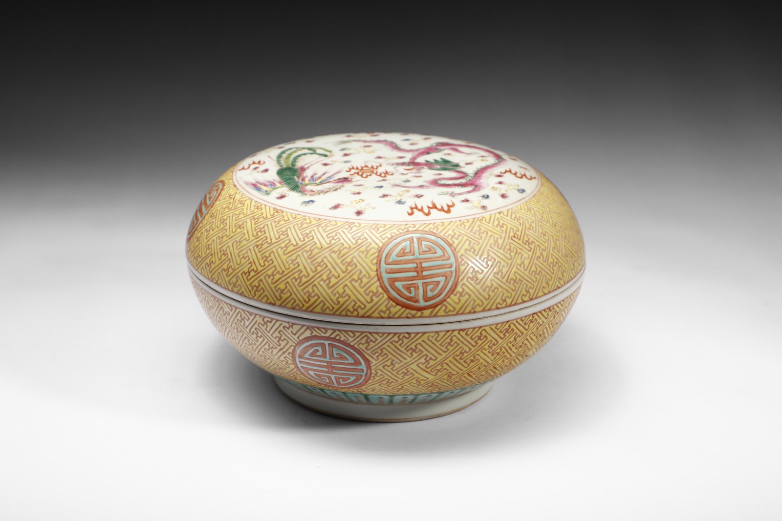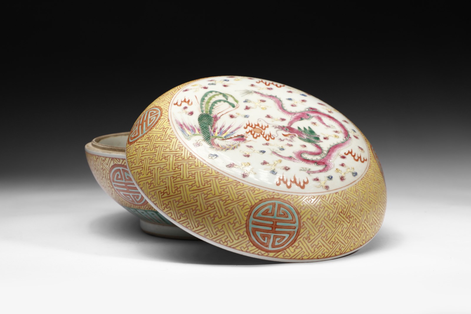 Cina, dinastia Qing, periodo Guangzu (1871-1908). . Cm 26,00 x 15,00. Bella scatola circolare in porcellana decorata nei vivaci contrasti cromatici della “famiglia rosa”. Il corpo ceramico, ornato da un prezioso decoro intrecciato su fondo giallo, presenta quattro riserve circolari poste sulla fascia mediana all'interno delle quali è inscritto il carattere shou della longevità ed un grosso medaglione centrale con l'immagine della Fenice e del Dragone tra nuvole e perle fiammeggianti, secondo la consueta iconografia allusiva alla coppia imperiale. Sul fondo, in blu sottocoperta è presente il marchio a sei caratteri corsivi di Guangzu (1871-1908).