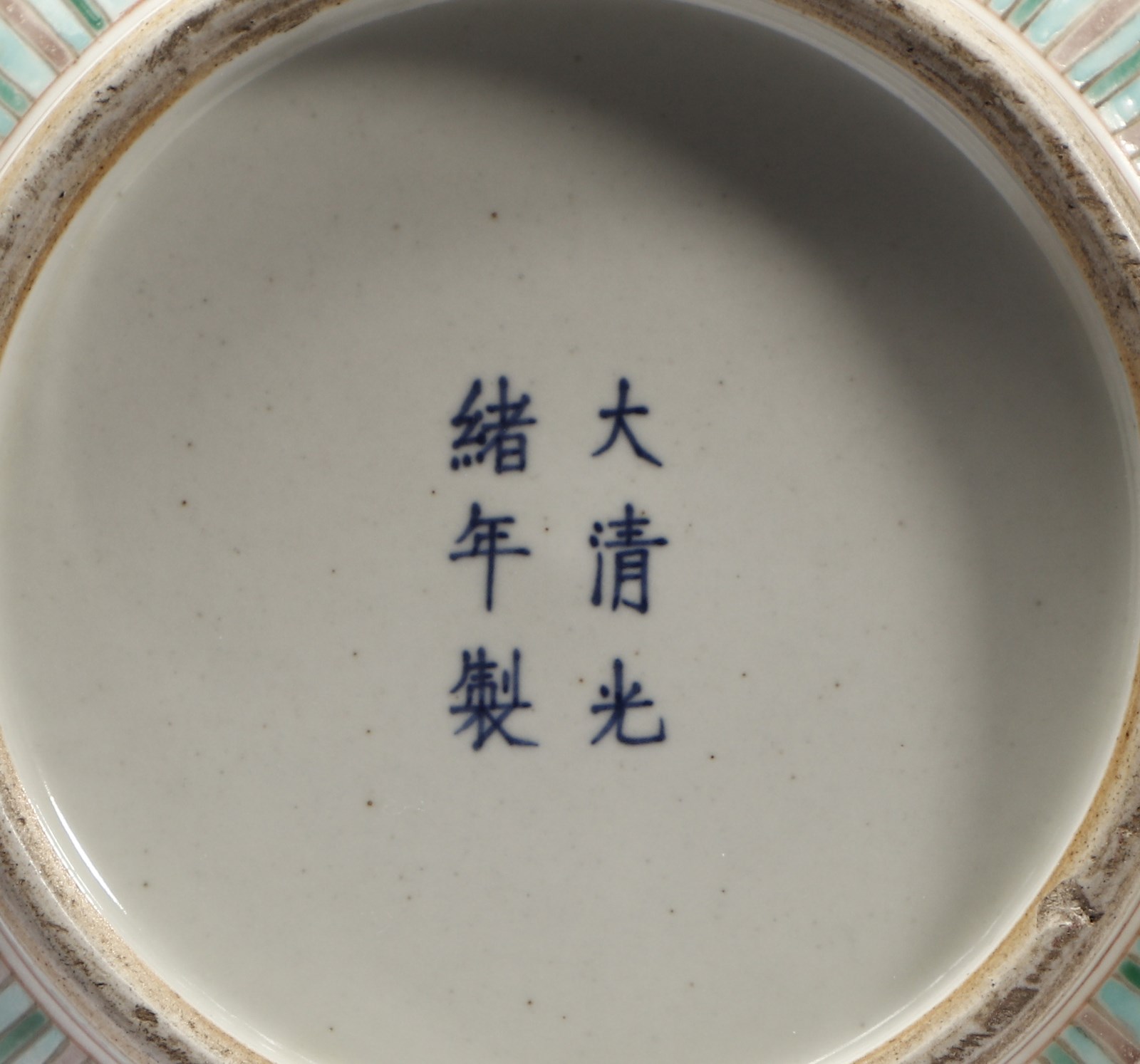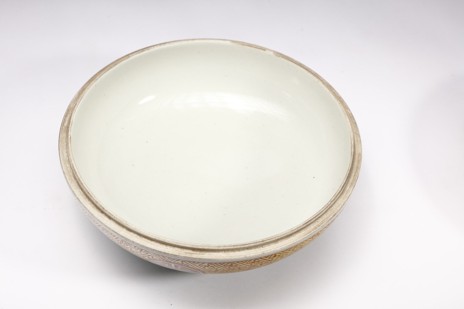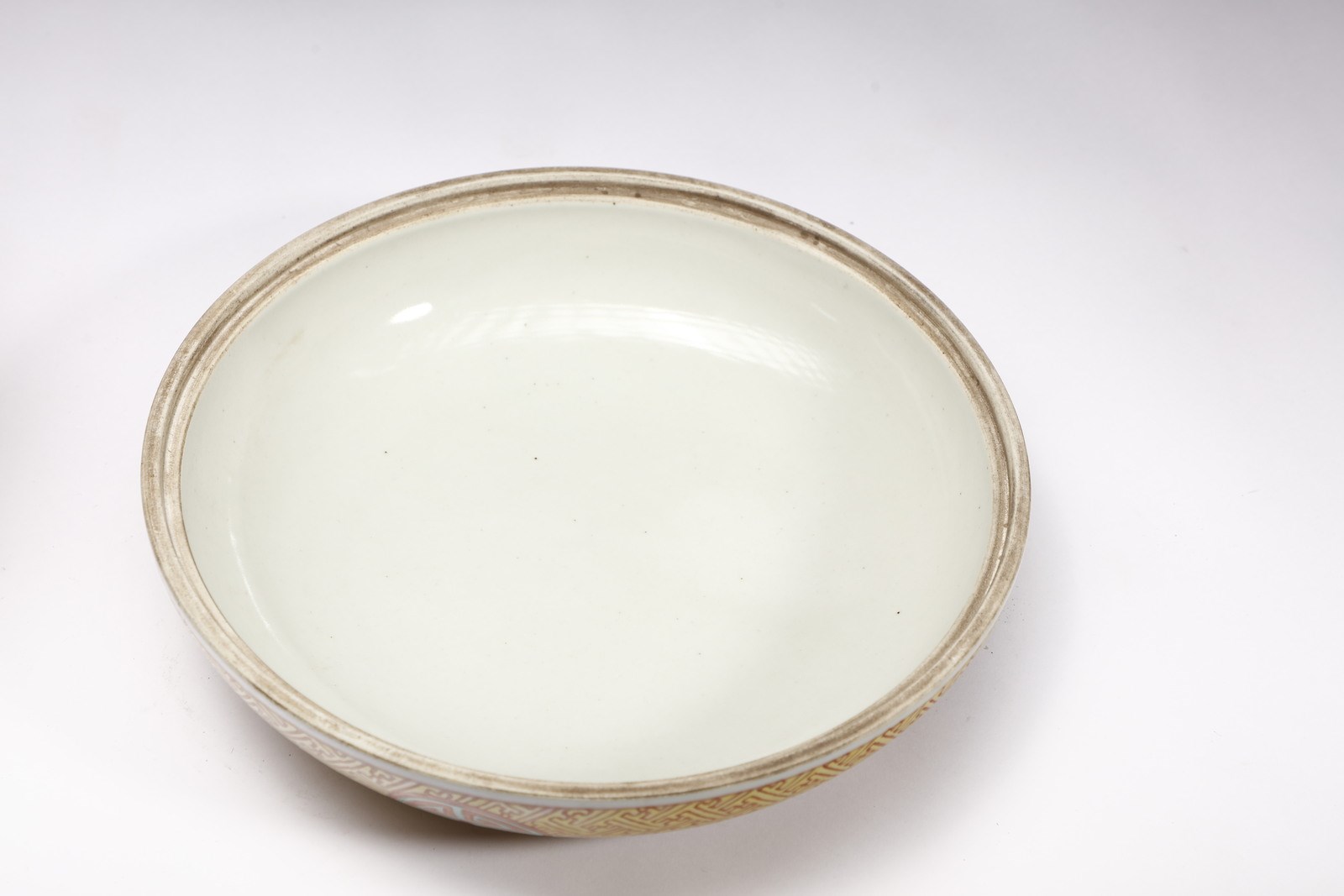 Cina, dinastia Qing, periodo Guangzu (1871-1908). . Cm 26,00 x 15,00. Bella scatola circolare in porcellana decorata nei vivaci contrasti cromatici della “famiglia rosa”. Il corpo ceramico, ornato da un prezioso decoro intrecciato su fondo giallo, presenta quattro riserve circolari poste sulla fascia mediana all'interno delle quali è inscritto il carattere shou della longevità ed un grosso medaglione centrale con l'immagine della Fenice e del Dragone tra nuvole e perle fiammeggianti, secondo la consueta iconografia allusiva alla coppia imperiale. Sul fondo, in blu sottocoperta è presente il marchio a sei caratteri corsivi di Guangzu (1871-1908).