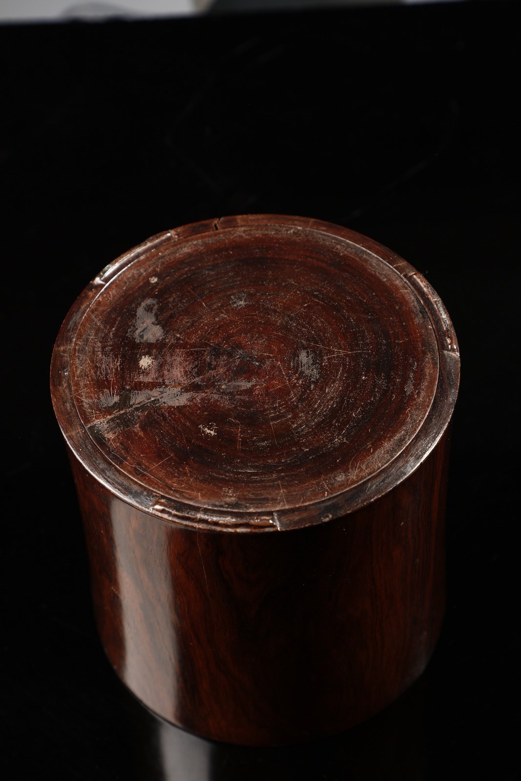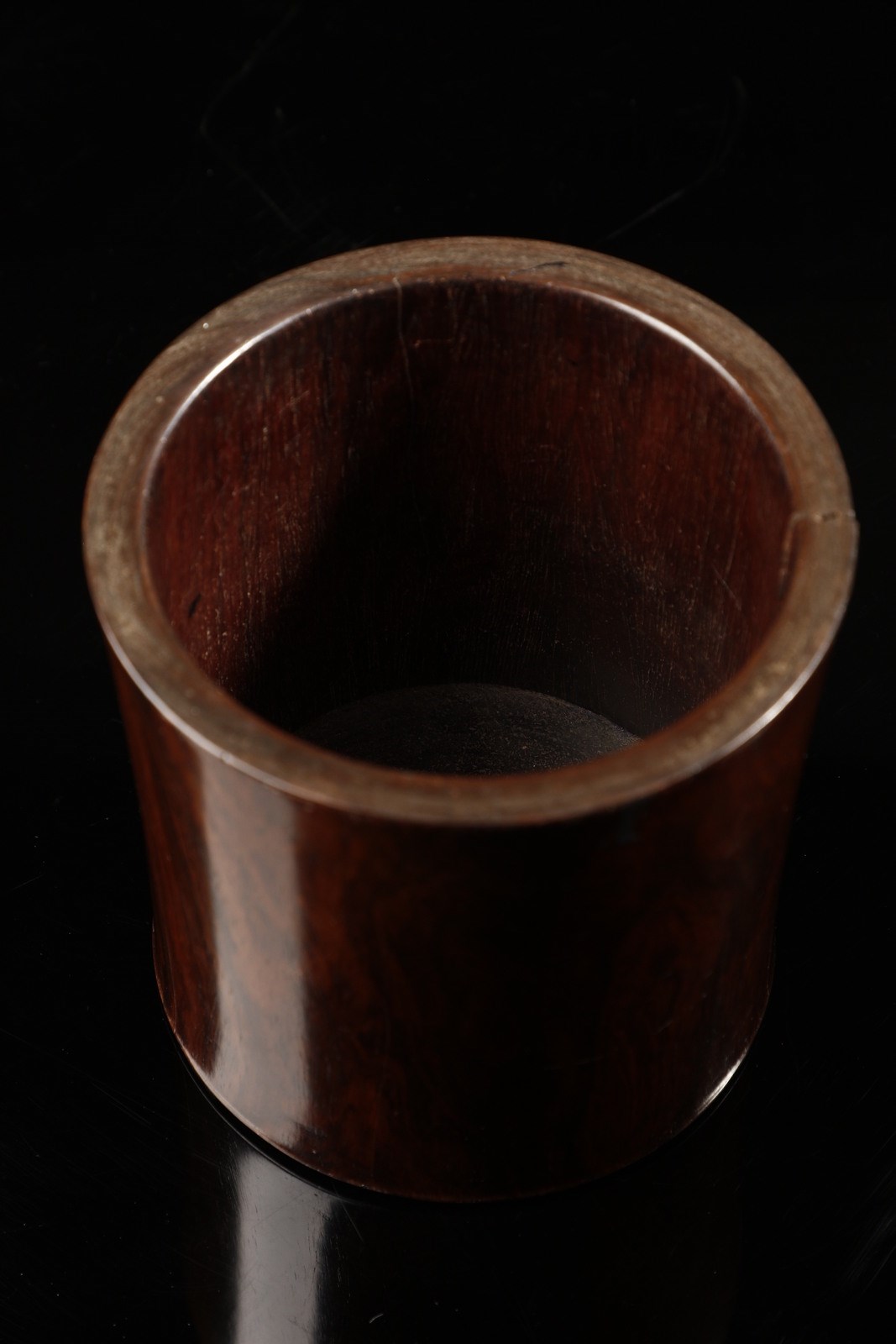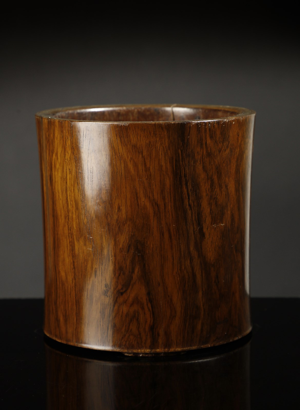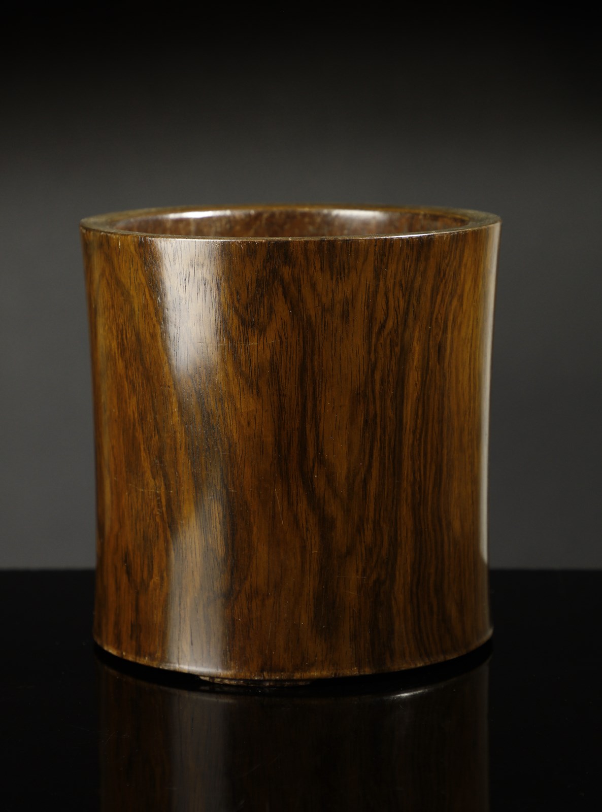 Cina, dinastia Qing, XVIII secolo. . Cm 14,50 x 15,00. Contenitore per pennelli di forma cilindrica realizzato in pregiato legno di dalbergia odorifera conosciuto in cina come huali o huanghuali, termine quest'ultimo preferito dai collezionisti da usarsi quando il colore del legno schiarisce per la lunga esposizione alla luce e vira verso una calda tonalità di giallo. Apprezzatissimo fin dall'antichità il huali, insieme a pochi altri tipi di essenza, sta ai vertici del mobile classico cinese, impiegato da sempre dalla classi più abbienti anche per la realizzazione di pregiati manufatti destinati agli arredi delle abitazioni o, come in questo caso, per i preziosi strumenti destinati agli studi dei nobili Letterati.