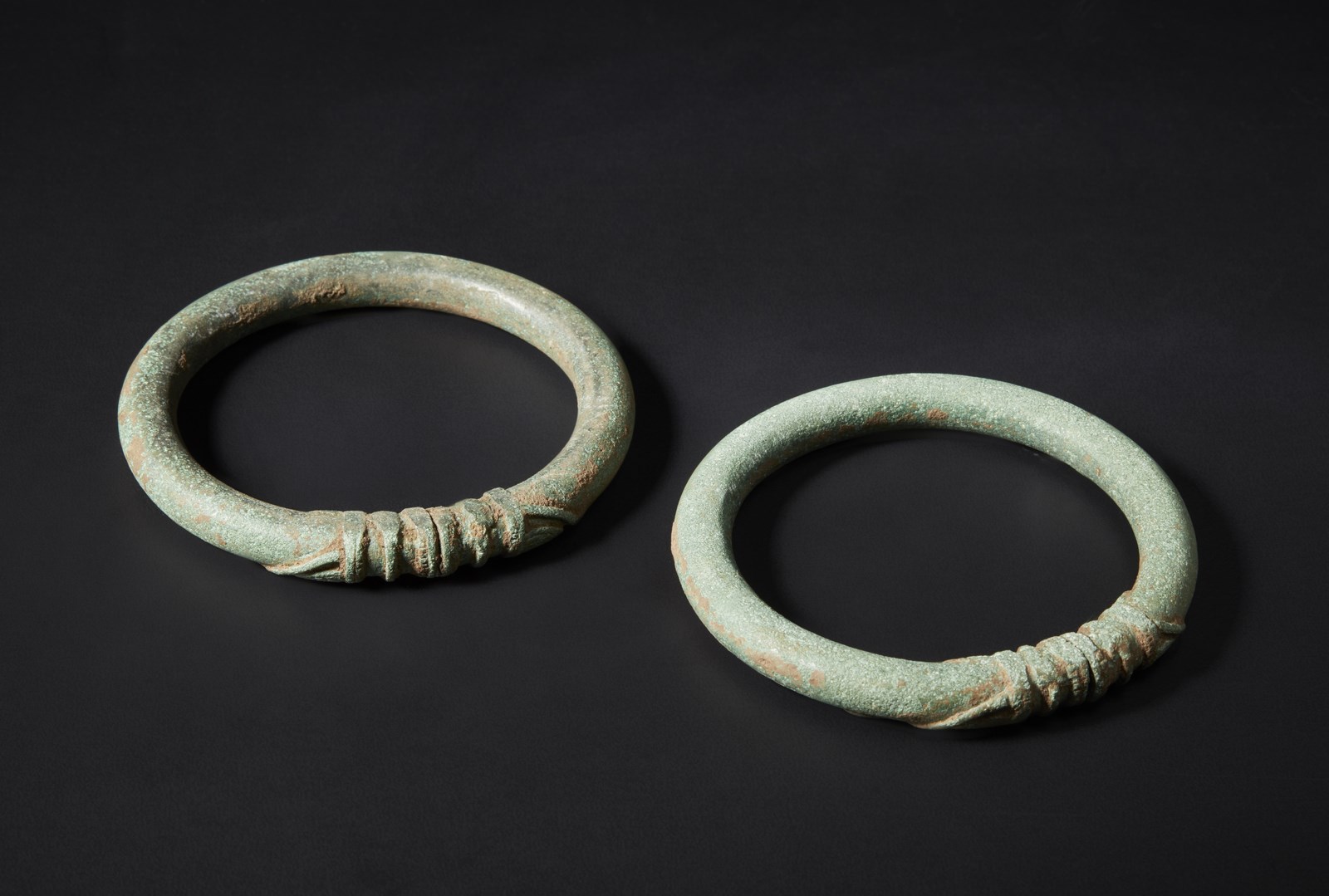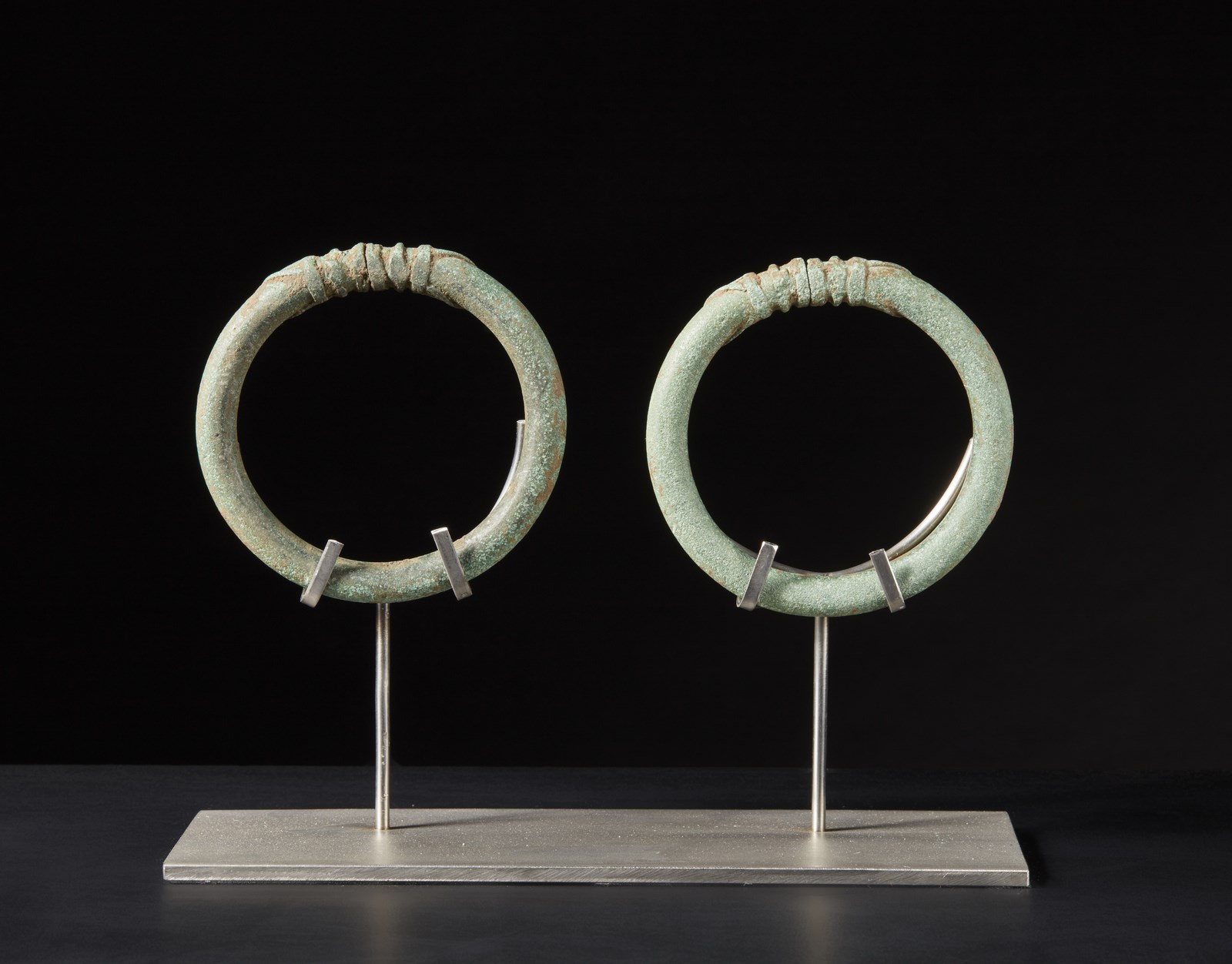 Originariamente lucidi, i due bracciali appaiono oggi rivestiti da una bella patina verde smeraldo.