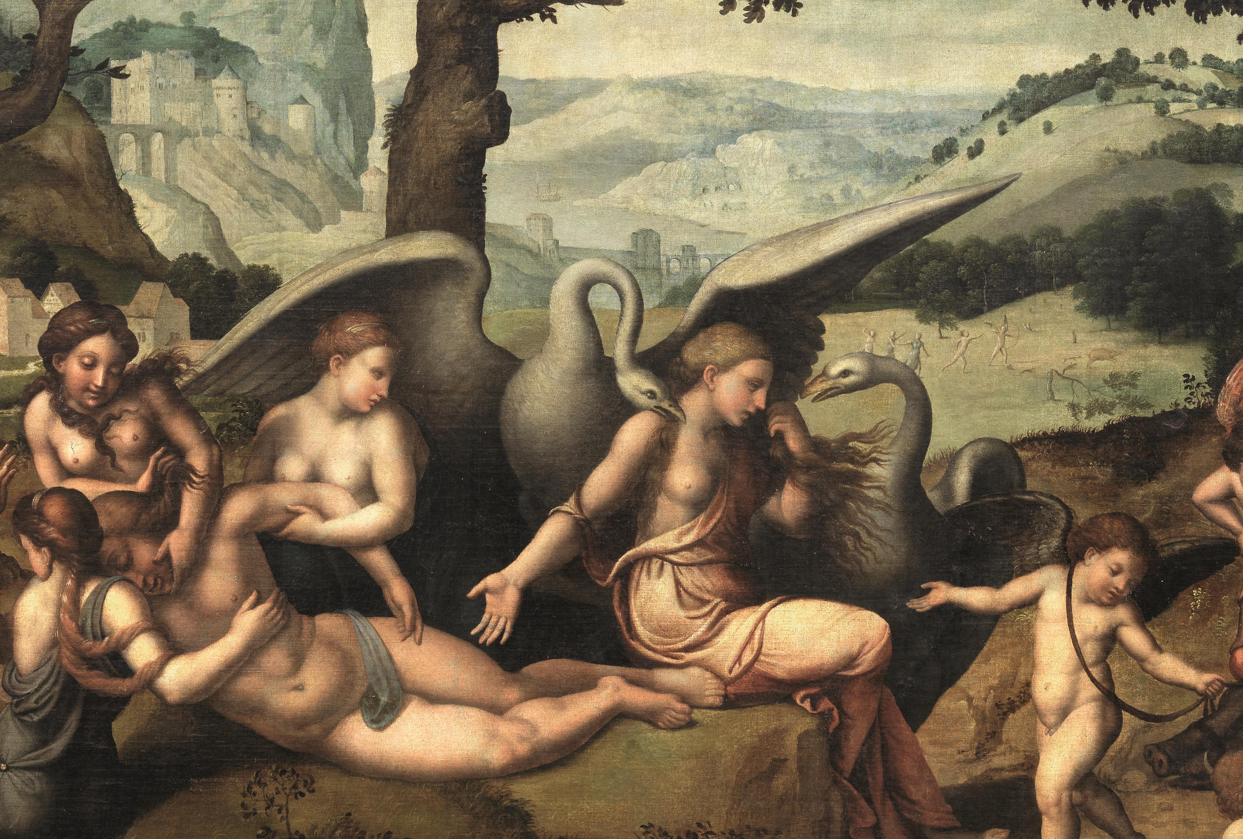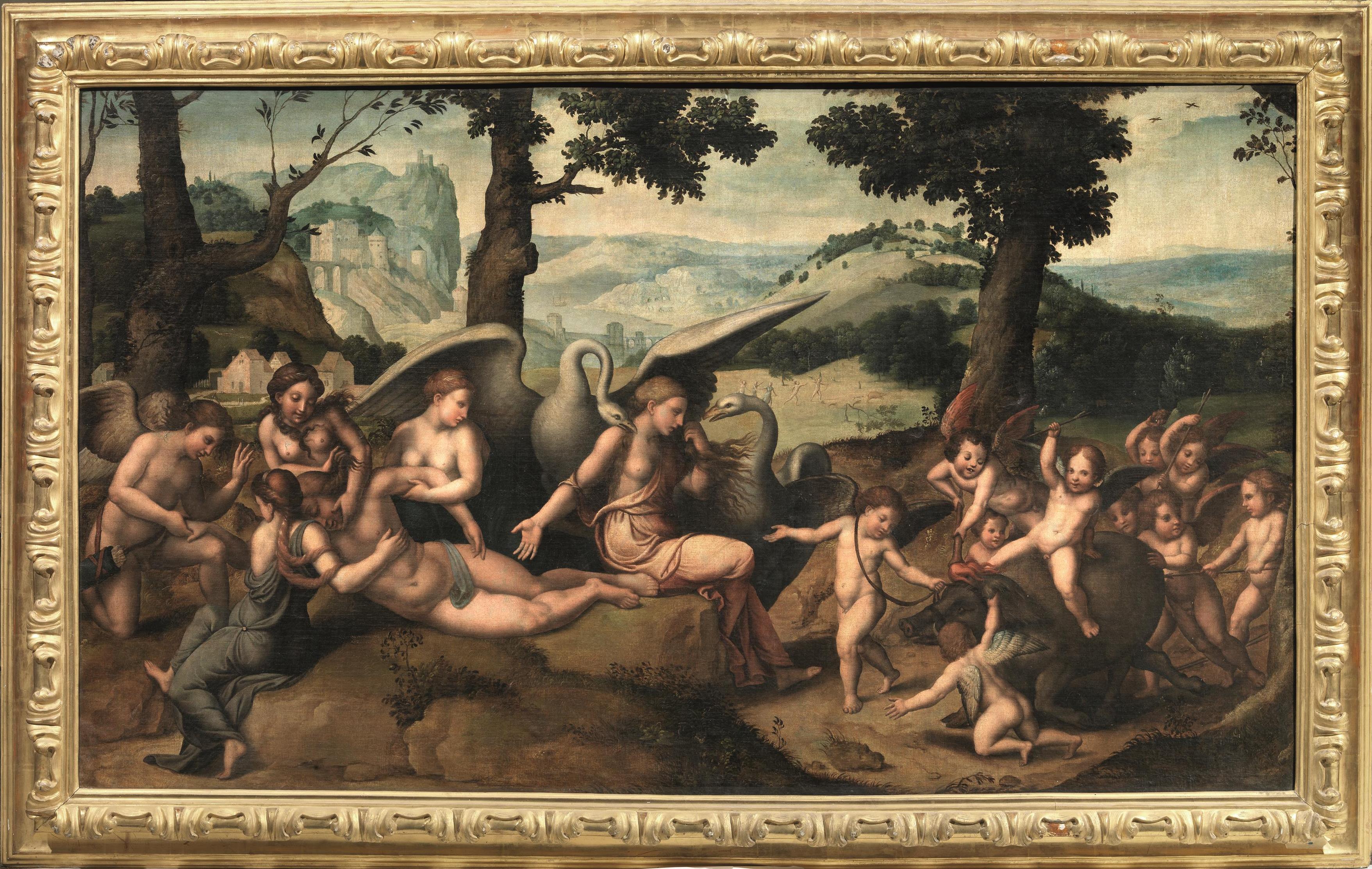 La composizione del dipinto qui presentato deriva da un’invenzione di Giulio Romano documentata da un disegno autografo (Manchester, City Art Gallery) che ne costituisce una prima idea, da un foglio già nella collezione Ellesmere, dove la scena è trasferita in un bosco, e da due disegni, copie da Giulio e meglio corrispondenti alla nostra scena, entrambi al Louvre (nn. 3490 e 3660). Confronti formali e tematici hanno da tempo suggerito di associare la storia di Adone a una serie di composizioni che sviluppano il tema della caccia sfortunata e dell’amore tra mortali e divinità: le storie appunto di Meleagro, Ila e Procri documentate da disegni e incisioni (cfr. S. Massari, Giulio Romano pinxit et delineavit. Opere grafiche autografe, di collaborazione e bottega, Roma 1993, pp. XXIX-XXXII, tavv. 20-21). Sebbene fonti e documenti non ne ricordino versioni dipinte, ne è stata ipotizzata la relazione con la distrutta decorazione della palazzina di caccia dei duchi Gonzaga a Marmirolo, e una possibile datazione verso il 1531 (F. Hartt, Giulio Romano, 1958, I, p. 225).