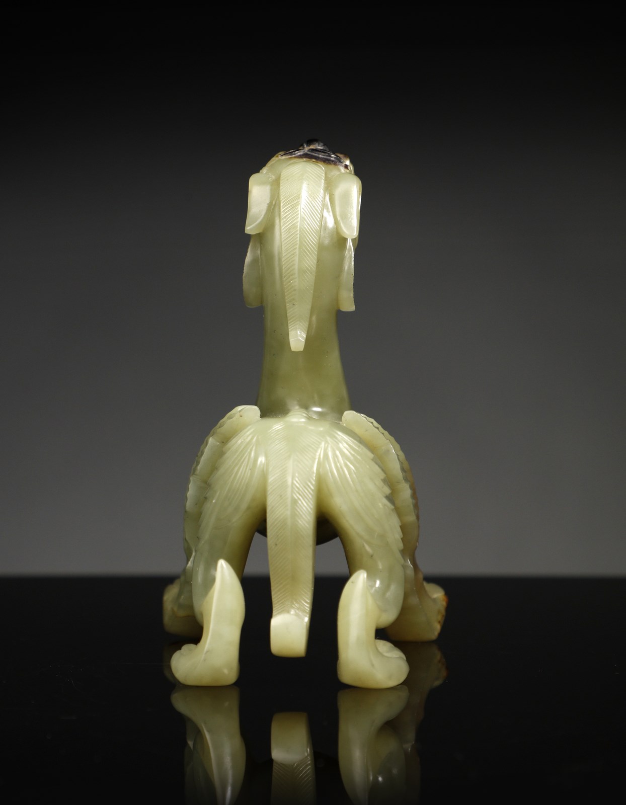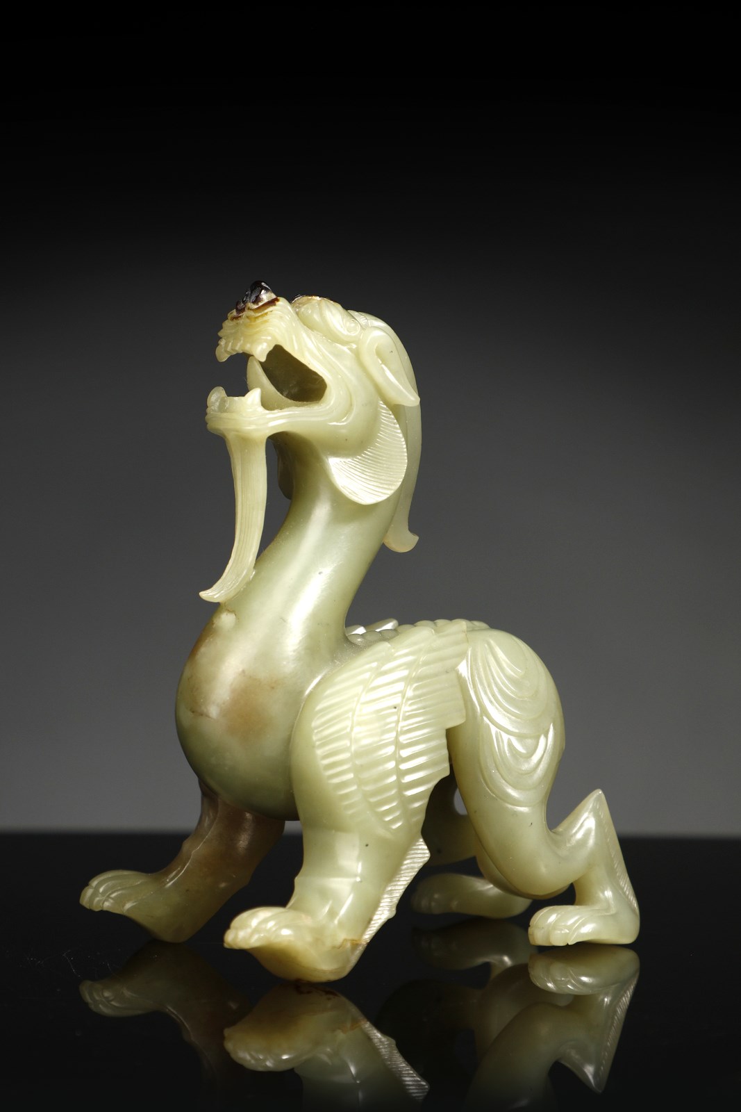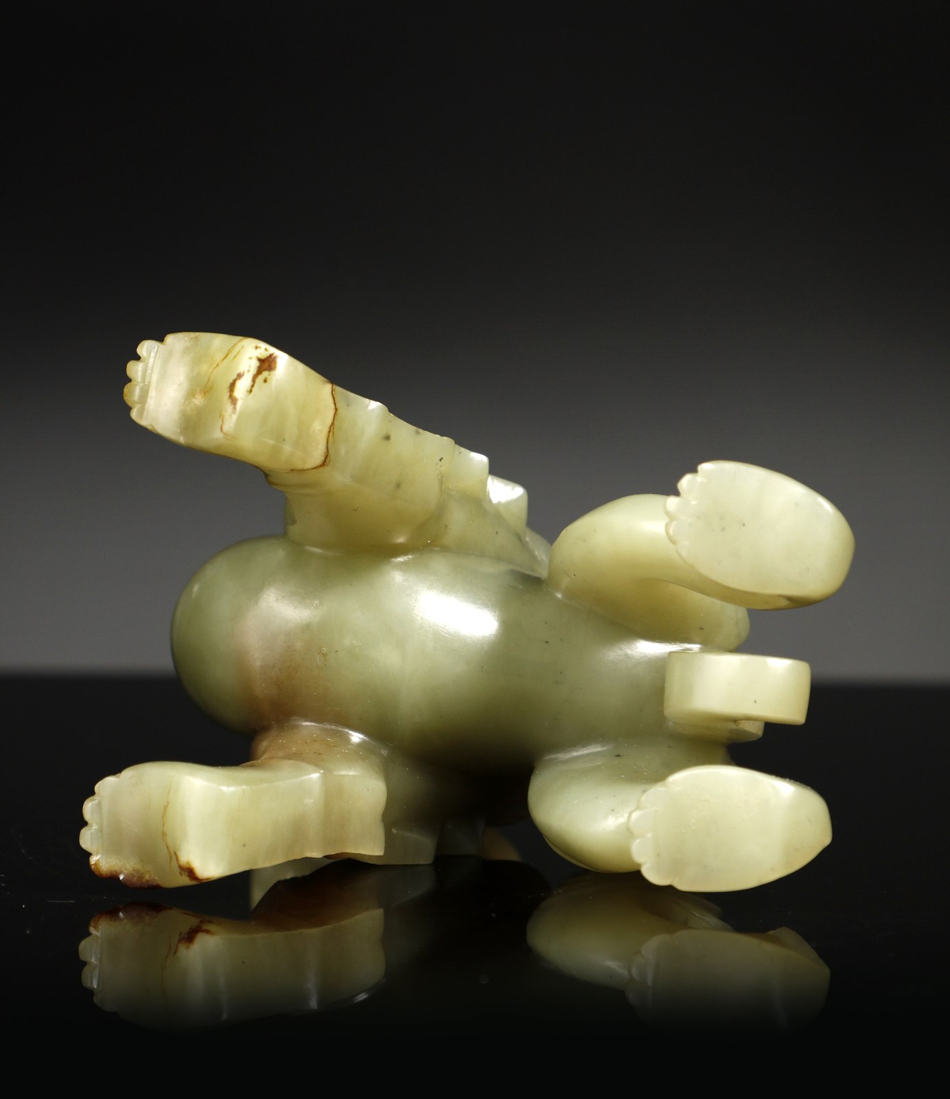 Cina, XX secolo. . Cm 8,00 x 10,50. Intaglio in giada verde pallido raffigurante il Bixie, bestia mitica del Pantheon taoista, rappresentata come un dragone alato dai tratti leonini. Il tema dalla chimera alata, considerato fin dalla antichità di buon auspicio perché annunciatore di future favolose ricchezze, fu replicato nei secoli spesso prendendo ispirazione, come in in questo caso, dai modelli eleganti ed aggressivi realizzati in epoca Han (206 a.C. - 220 a.D.).