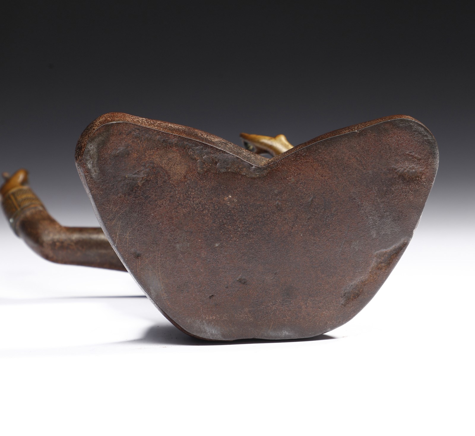 Area Himalayana o Mongolia, XVIII secolo . . Cm 12,00 x 18,50. Pesante fusione in ferro raffigurante una divinità seduta in padmasana, le due braccia sollevate, la mano sinistra nel gesto della ruota della dottrina dharmacakramudra. Da notare che le due mani sono in bronzo innestato sul ferro.