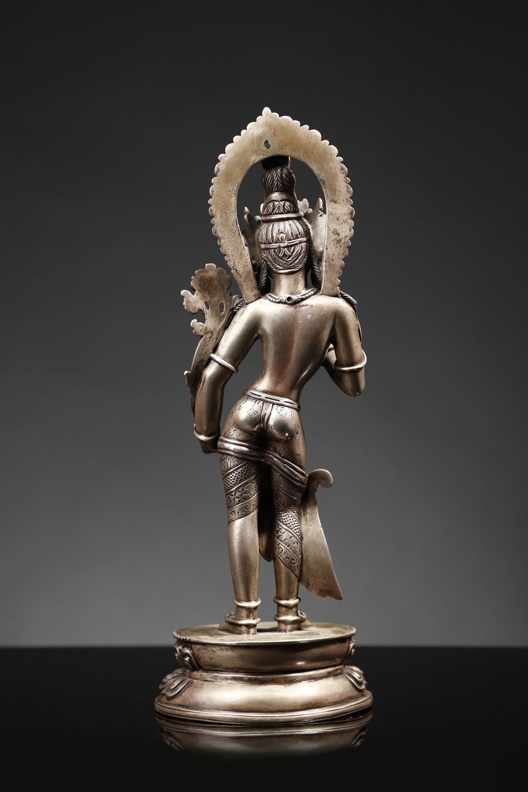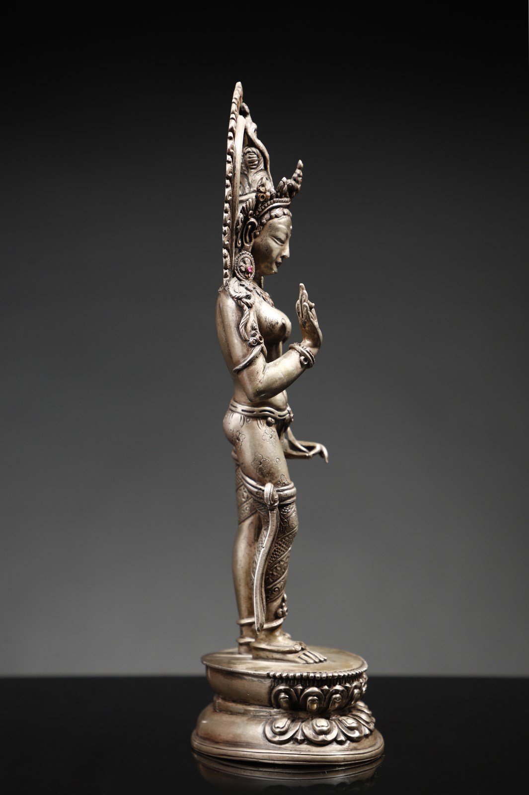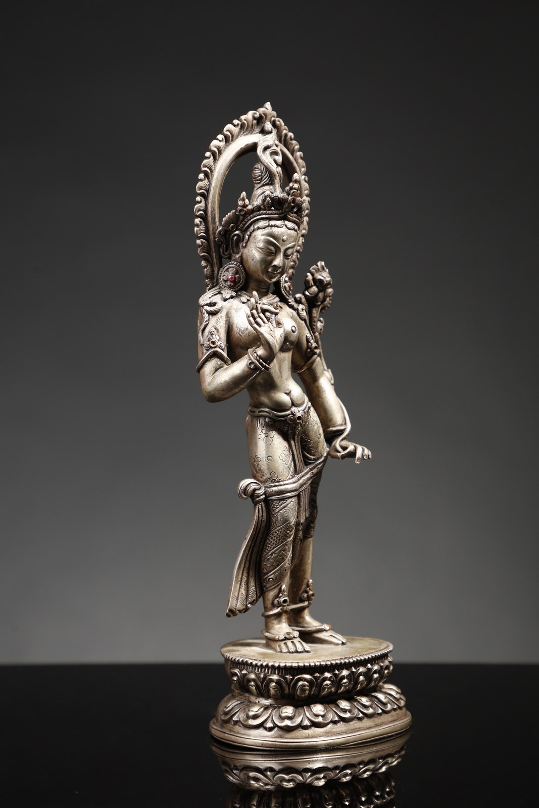 China, dinastia Qing . . Cm 9,00 x 24,50. Scultura in argento raffigurante Tara in piedi sopra un elaborato piedistallo a doppia corolla di loto, con nella mano sinistra il Padma, il tralcio fiorito di loto, simbolo di compassione nonchè suo specifico attributo.
