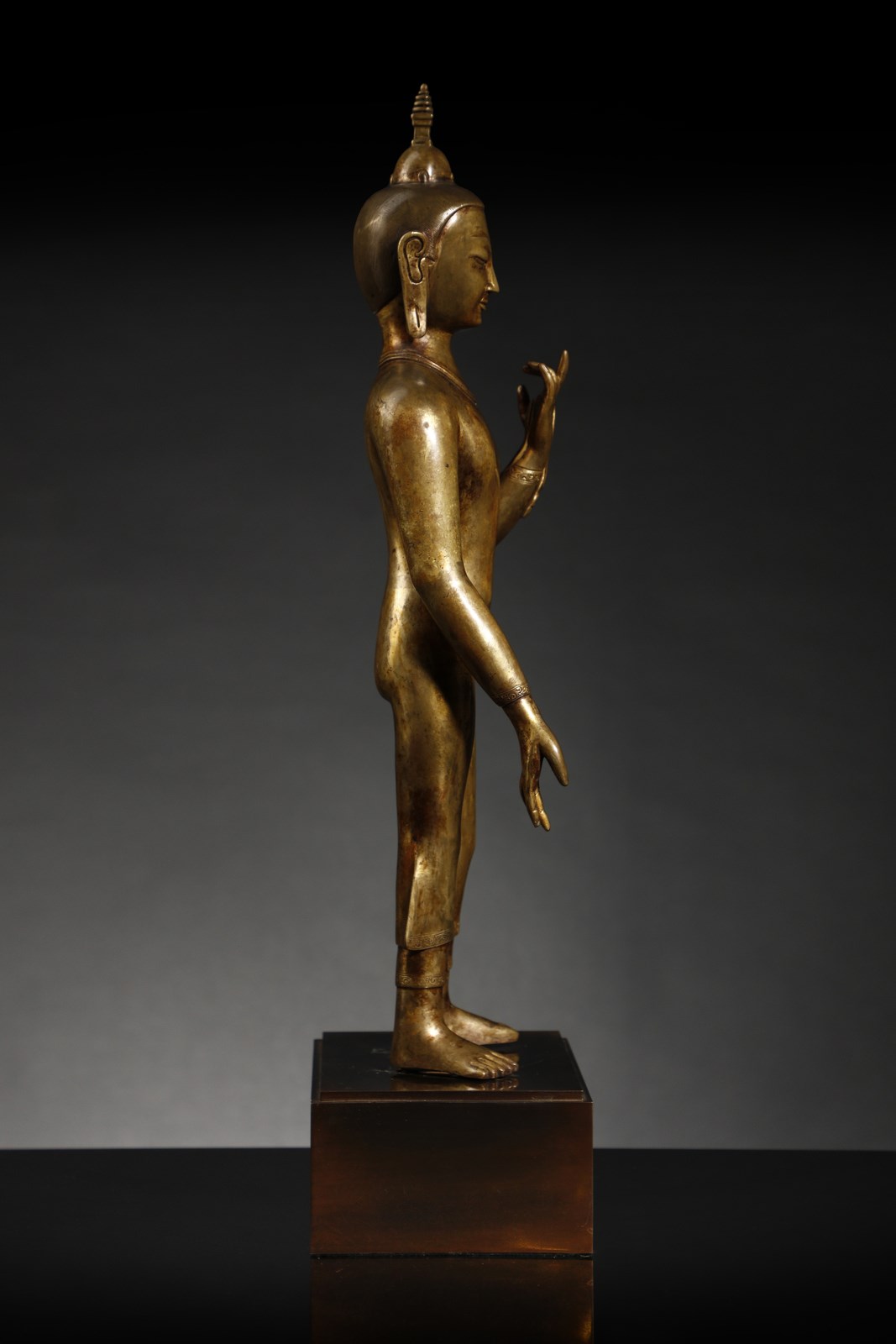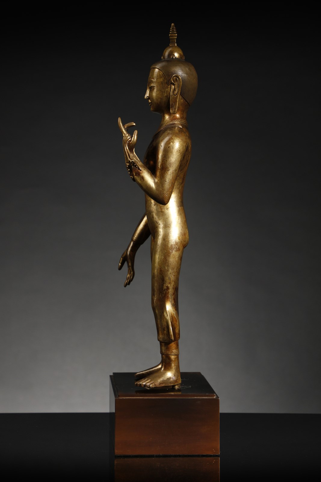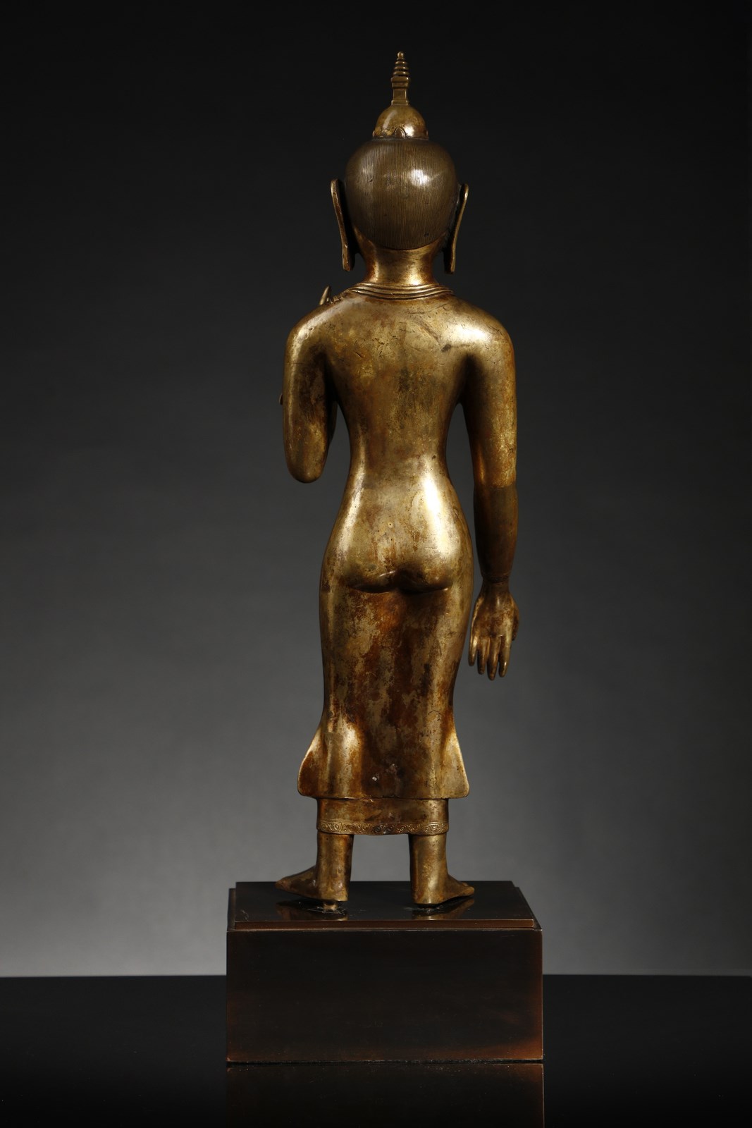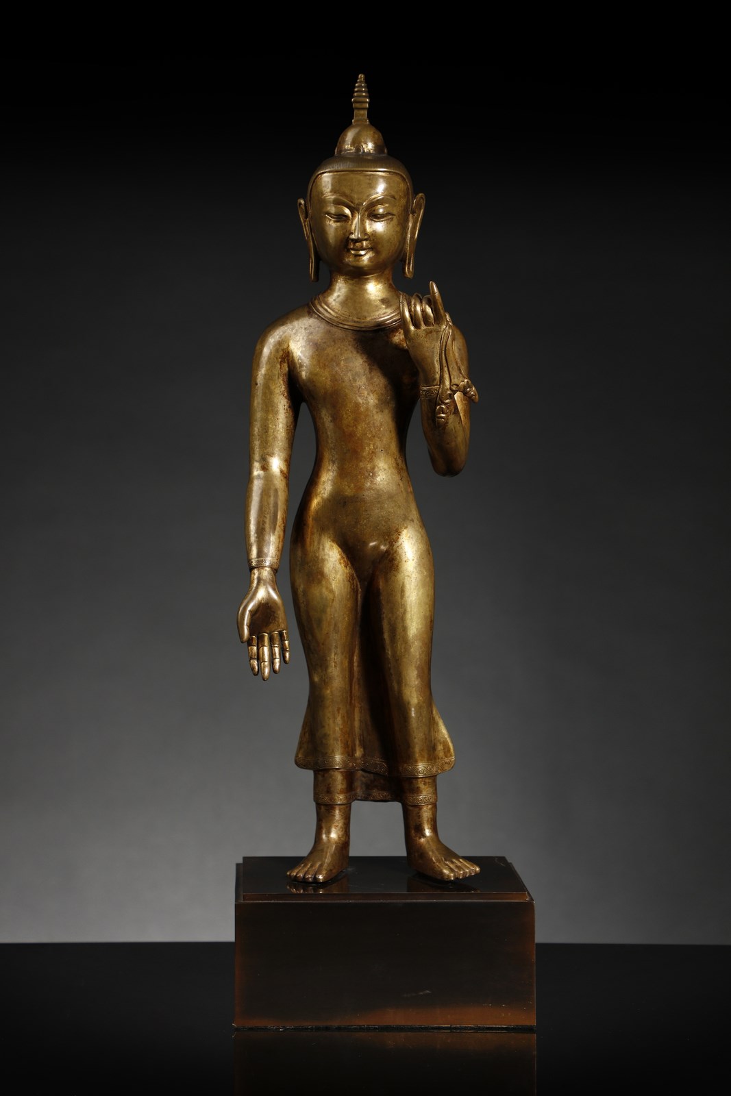 Birmania, sec XIX o precedente. . Cm 53,00. Grande scultura in bronzo raffigurante il Buddha in piedi in varadamudra, con il braccio sinistro alzato all'altezza della spalla e la mano in karanmudra che stringe i lacci del sanghati, il tipico mantello buddhista. La levigatezza della bella fusione a patina naturale evidenzia il movimento morbido e flessuoso delle membra e del corpo su cui si innesta il volto rotondo sormontato dalla vistosa Ushnisha, impreziosita da una insolita struttura di tipo architettonico che la rende simile ad uno stupa, l'edificio sacro in cui sono contenute le reliquie del Buddha. Stilisticamente questa immagine è riconducibile alla statuaria in bronzo di epoca Pagan (849-1297), del XIII secolo sviluppatasi presso l'omonima citta dell'odierno Myanmar.