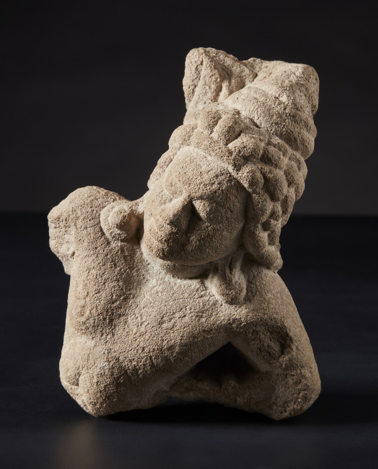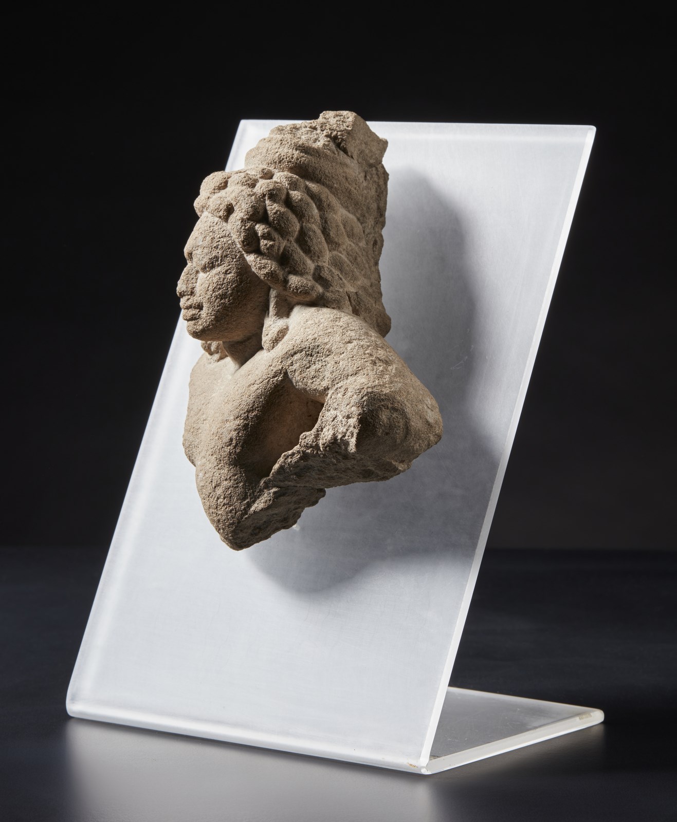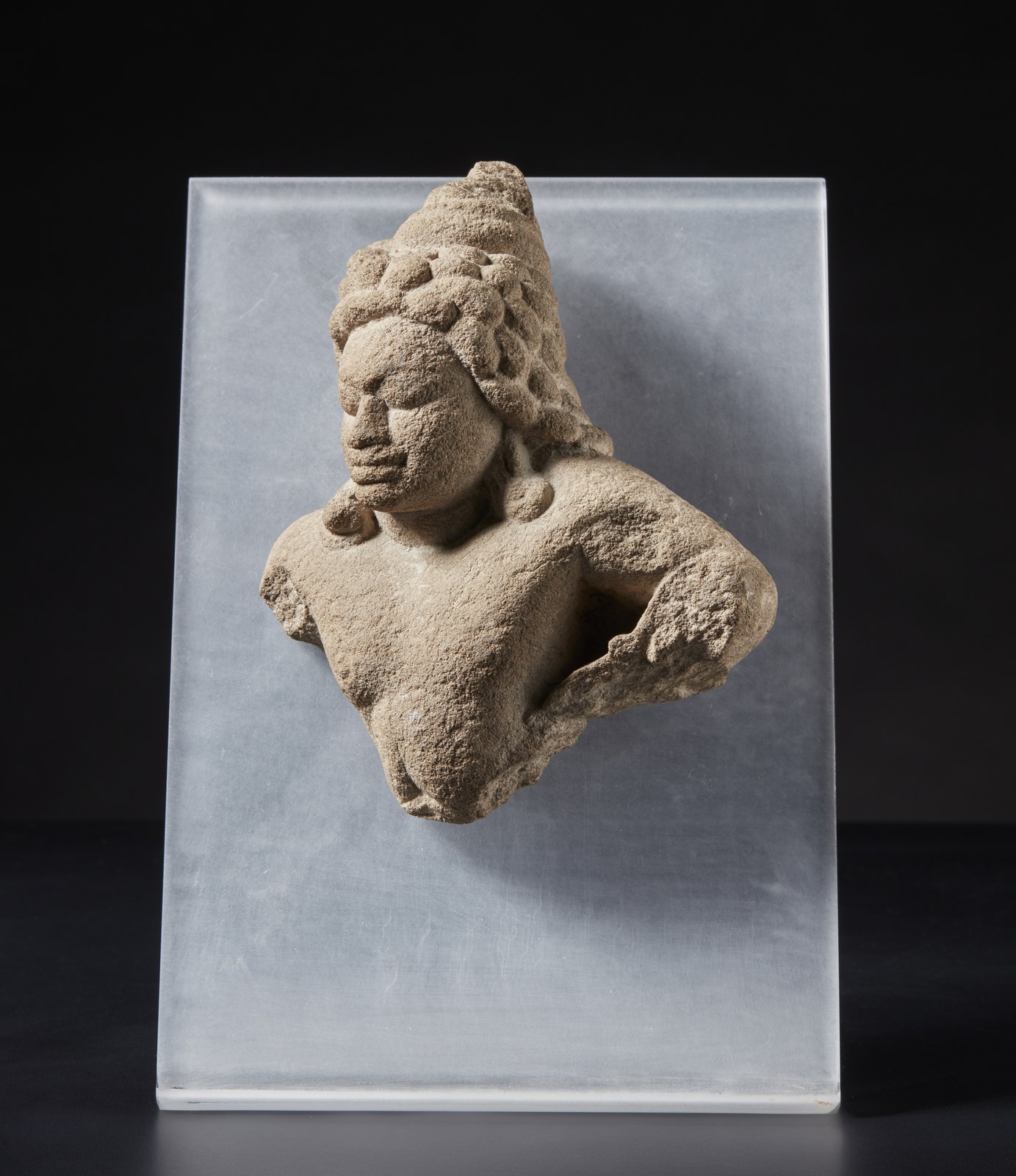 Cambogia, Khmer, pre Angkor VII/VIII secolo . . Cm 12,00 x 16,00. frammento a mezzo busto realizzato ad altorilievo in pietra arenaria probabilmente riconducibile alla figura di un bodhisattva, come si può desumere dalla complessa acconciatura dei capelli e dai preziosi monili che ornano il volto.