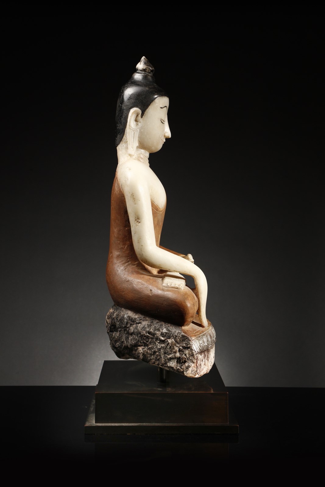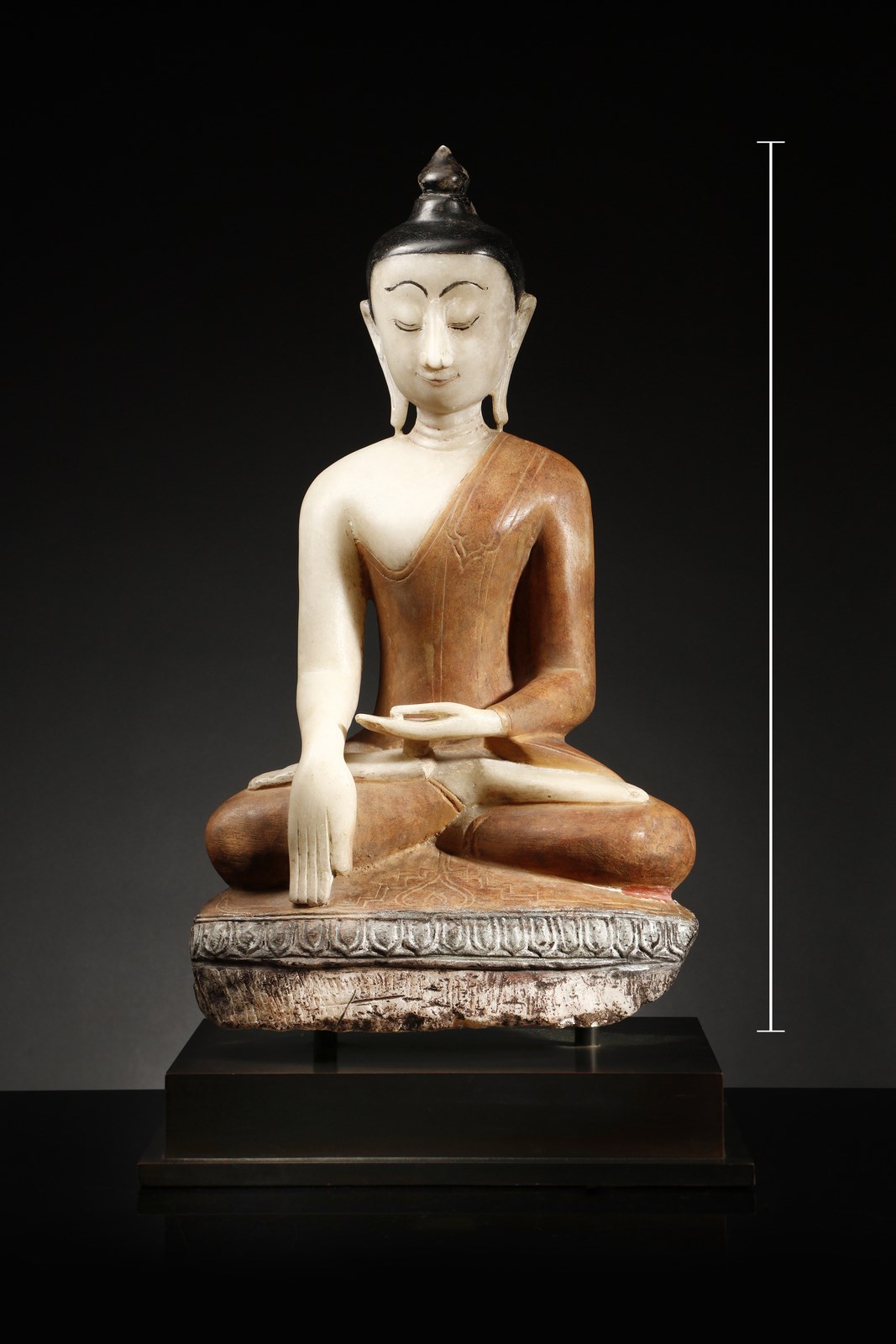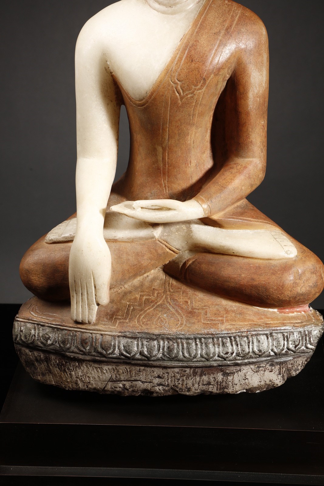 Birmania, inizio XIX secolo . . Cm 34,00 x 59,00. Scultura in marmo bianco raffigurante Buddha Shakyamuni seduto in padmasana sopra una base a fiore di loto singolo. La sua mano destra è in bhumisparsamudra, il gesto con cui chiama la Terra a testimone della sua illuminazione, mentre la sinistra è adagiata in grembo. La figura è abbigliata con una sobria veste monacale dipinta di marrone, mentre la capigliatura nero corvino contrasta con i tratti del viso sereni e resi floridi dall'aggiunta della policromia.