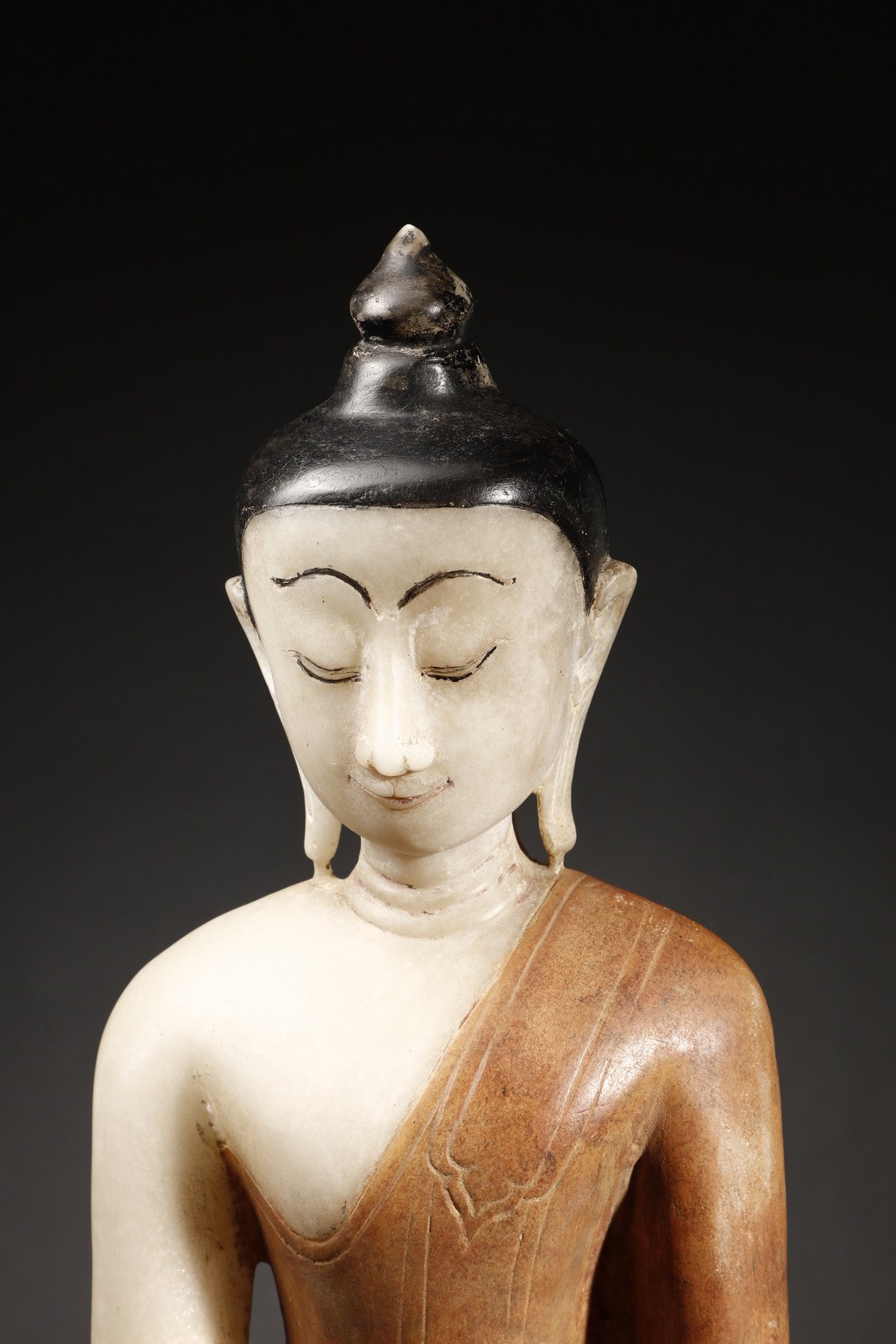 Figure del Budda in marmo policromo sono diffuse in Birmania dal periodo Ava a cui questa scultura si richiama, ma sfoderando forme più snelle e sobrie.