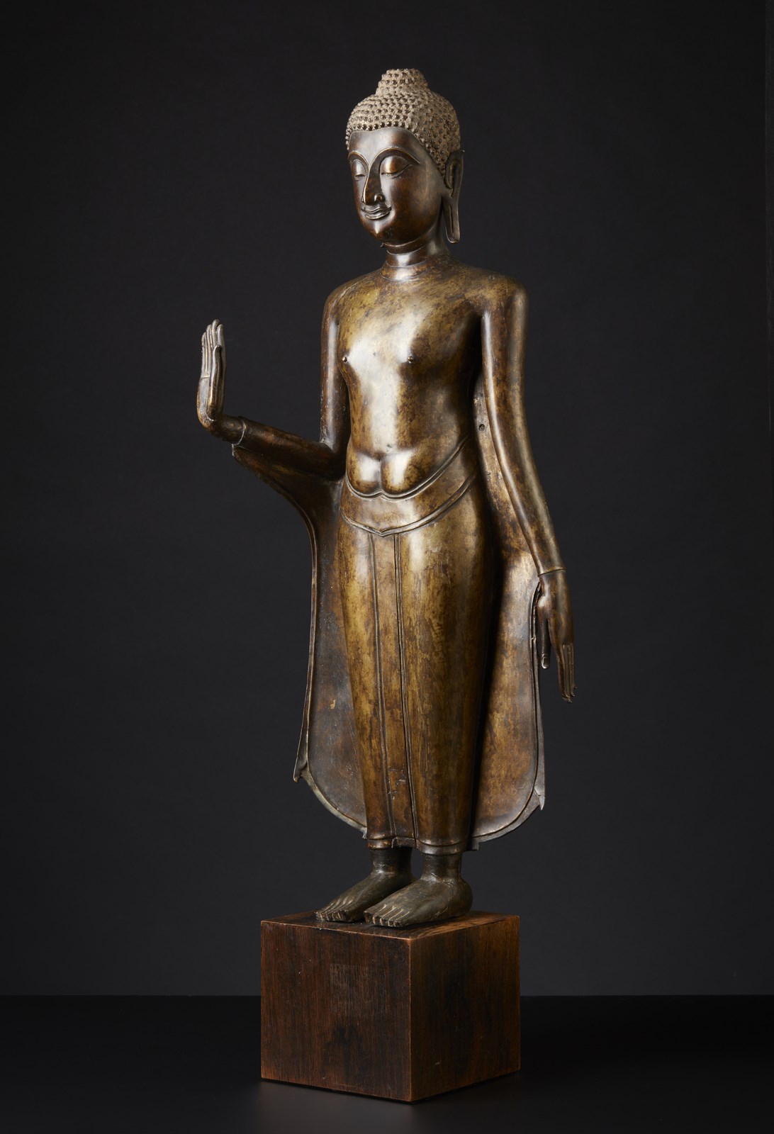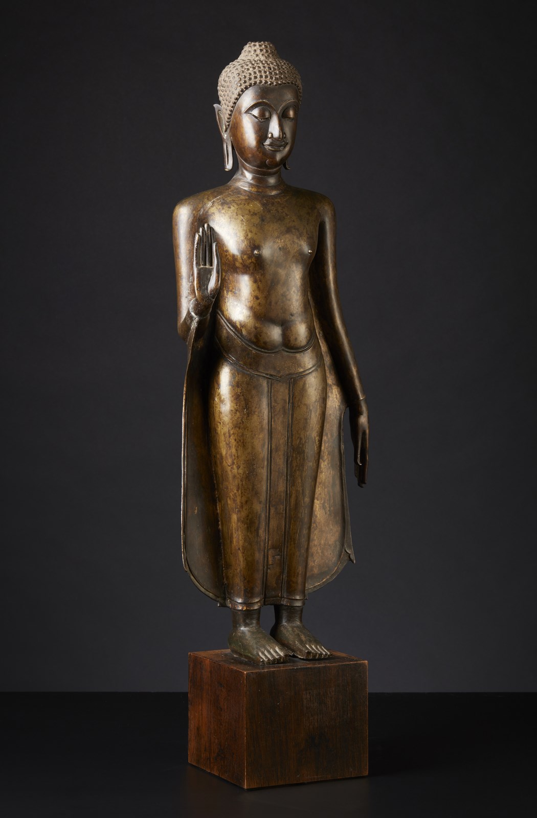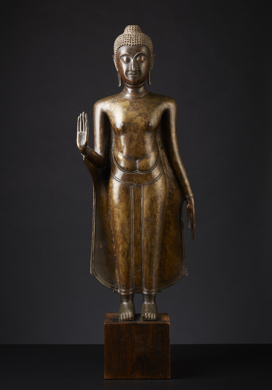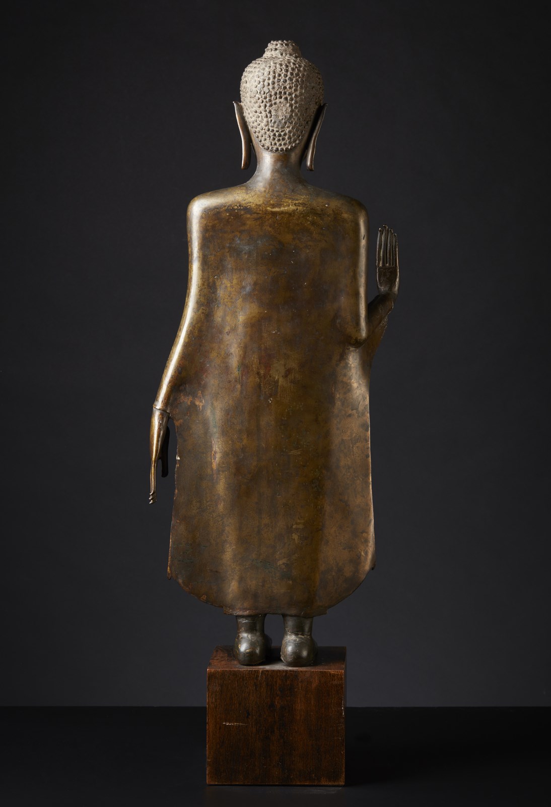 . . Cm 25,00 x 64,50. Fusione in bronzo di grandi dimensioni a patina bruna raffigurante il Buddha in piedi, con la mano destra alzata in gesto di pacificazione ed il braccio sinistro disteso lungo il fianco. Questa particolare postura della mano, conosciuta dai fedeli come abhaya mudra, o gesto dell' “allontanamento della paura”, fa parte della iconografia classica della statuaria buddhista e costituisce una versione popolare in Tailandia. Qui le immagini del Buddha stante, con una mano in abhaya mudra, formano il gruppo dei cosiddetti Pang Proht sat Buddha, espressione che indica il gesto di colui che “respinge l'animale inferocito”. In effetti, le cronache buddiste narrano dell'episodio in cui il principe Gautama calma e sottomette l' elefante che lo aveva attaccato.
