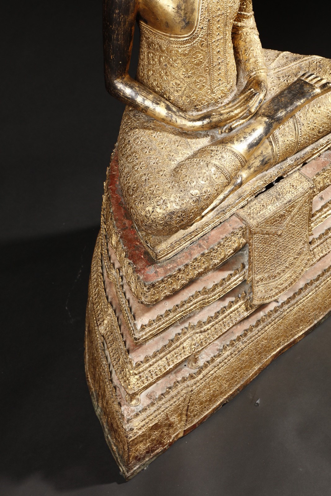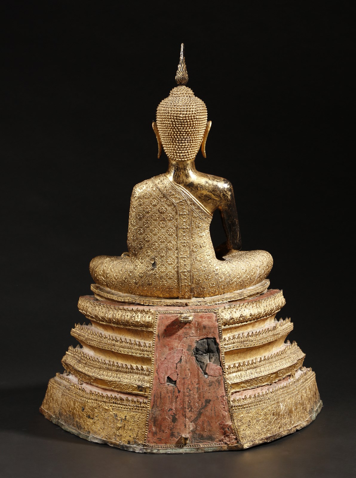 Thailandia, Bangkok, periodo Rattanakosin, tardo XVIII- inizio XIX secolo . . Cm 86,00 x 112,00 x 40,00. Scultura in bronzo laccato e dorato raffigurante il Buddha storico seduto in padmasana su una base rettangolare a più livelli. Le sue mani sono adagiate sulle ginocchia nel gesto della meditazione dhyanamudra. Lo stile Rattanakosin ingentilisce ed arricchisce la tradizionale iconografia buddista trasformando la veste monacale che lascia scoperta una spalla in un ricco mantello, impreziosendo inoltre la base e la capigliatura. La doratura, sopra lacca rossa e nera, conferisce un ulteriore elemento regale a tutta la composizione.