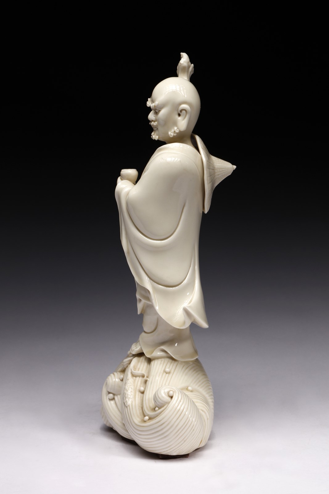 Cina, dinastia Qing, XIX secolo . . Cm 27,50. Scultura in porcellana bianco di Cina raffigurante uno degli otto Immortali, Li Tieguai, in piedi su una nuvola. Marchio impresso sul retro.