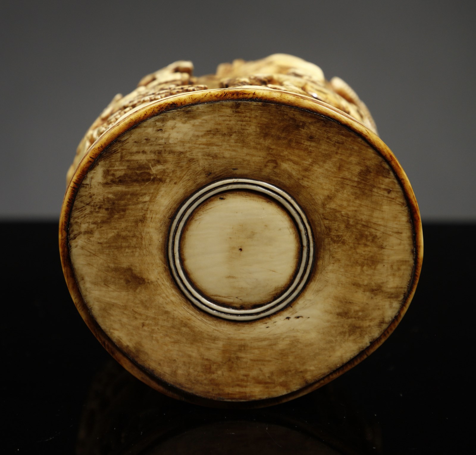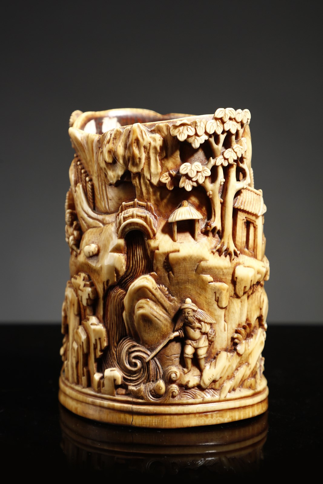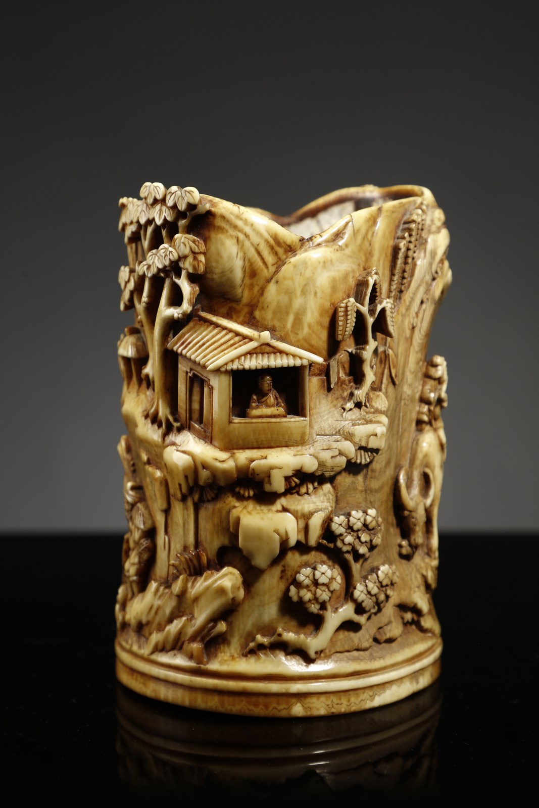 Cina, dinastia Qing, XIX secolo. . Cm 10,00 x 14,00. Contenitore cilindrico per pennelli da calligrafo in avorio intagliato a rilievo con scena animata in paesaggio montano con edifici sparsi.