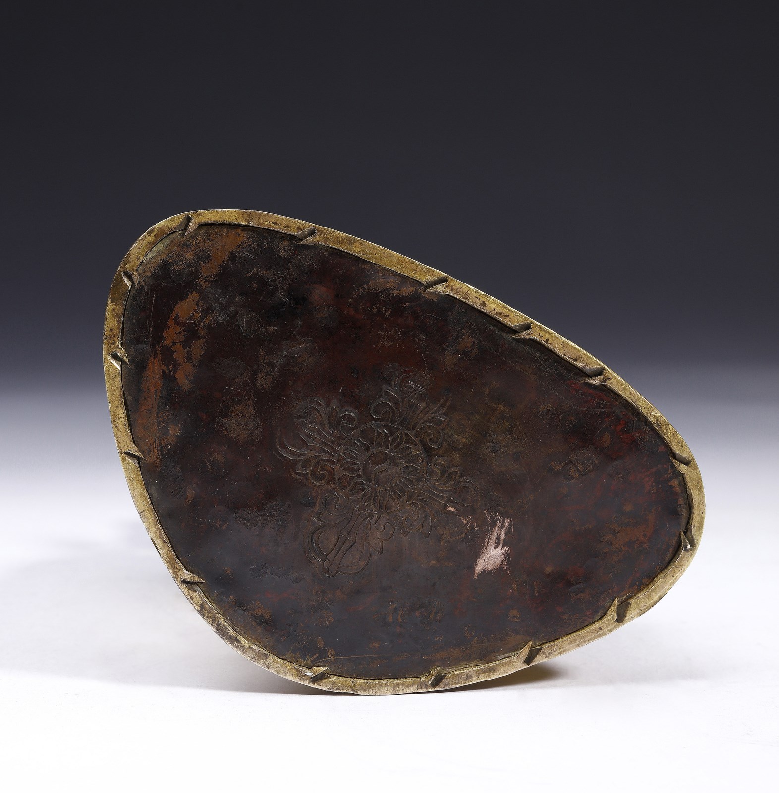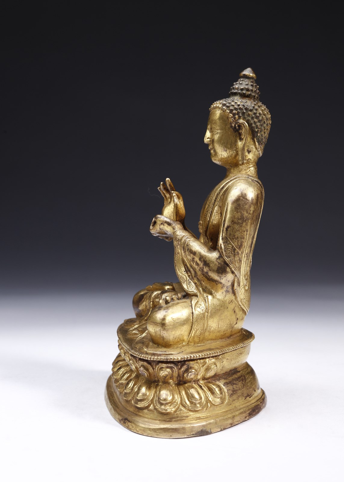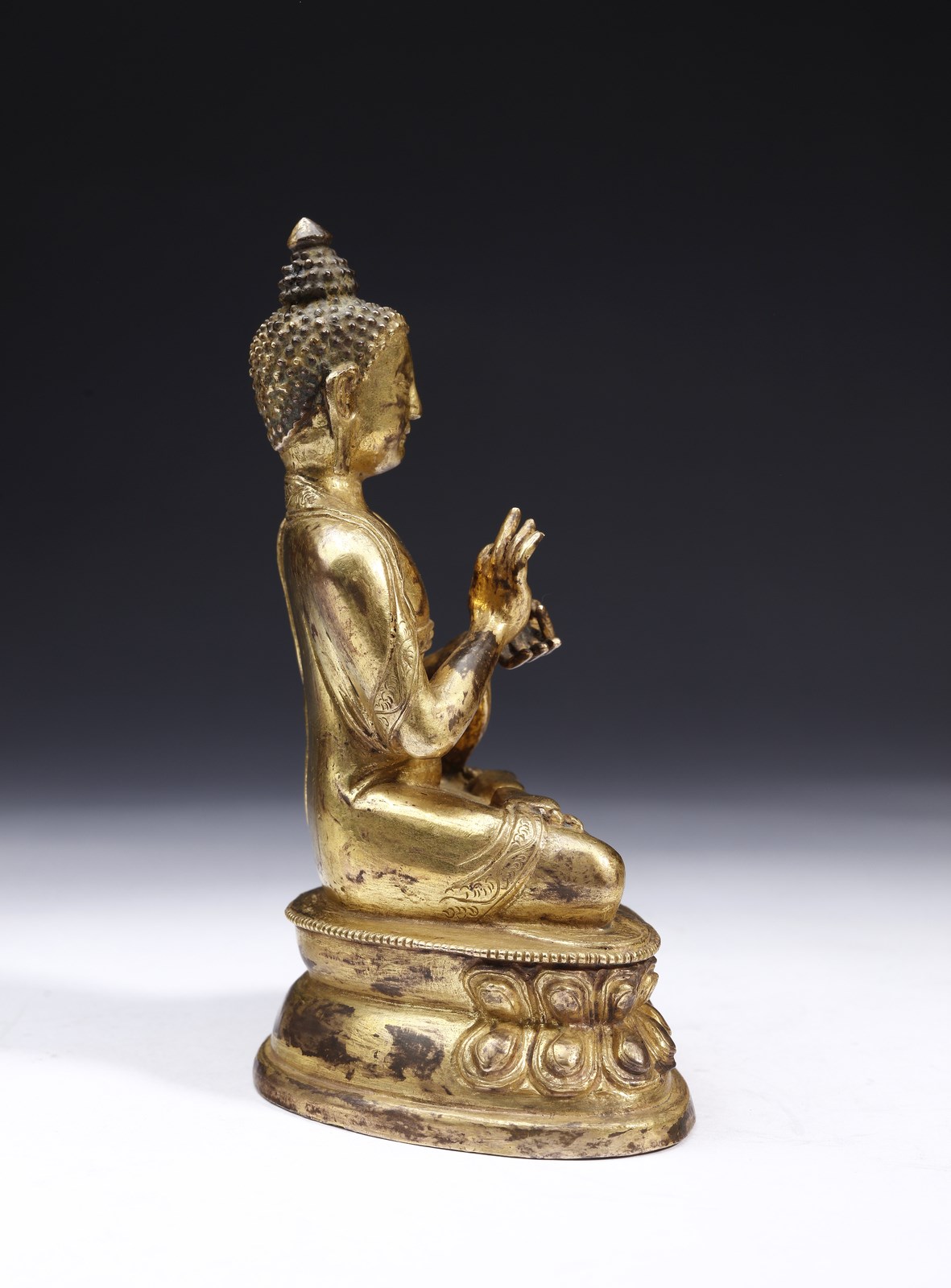 Cina, dinastia Qing, XIX secolo. . Cm 15,50. Fusione in bronzo raffigurante il Buddha assiso in dharmachacra su piedistallo a doppia corolla di petali di loto. La bella fusione, con parti lavorate a cesello che evidenziano il decoro della ricca veste, mantiene gran parte della originale doratura a mercurio.