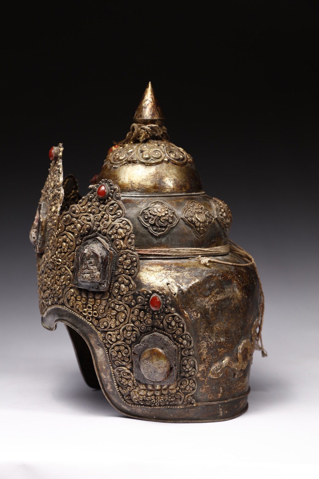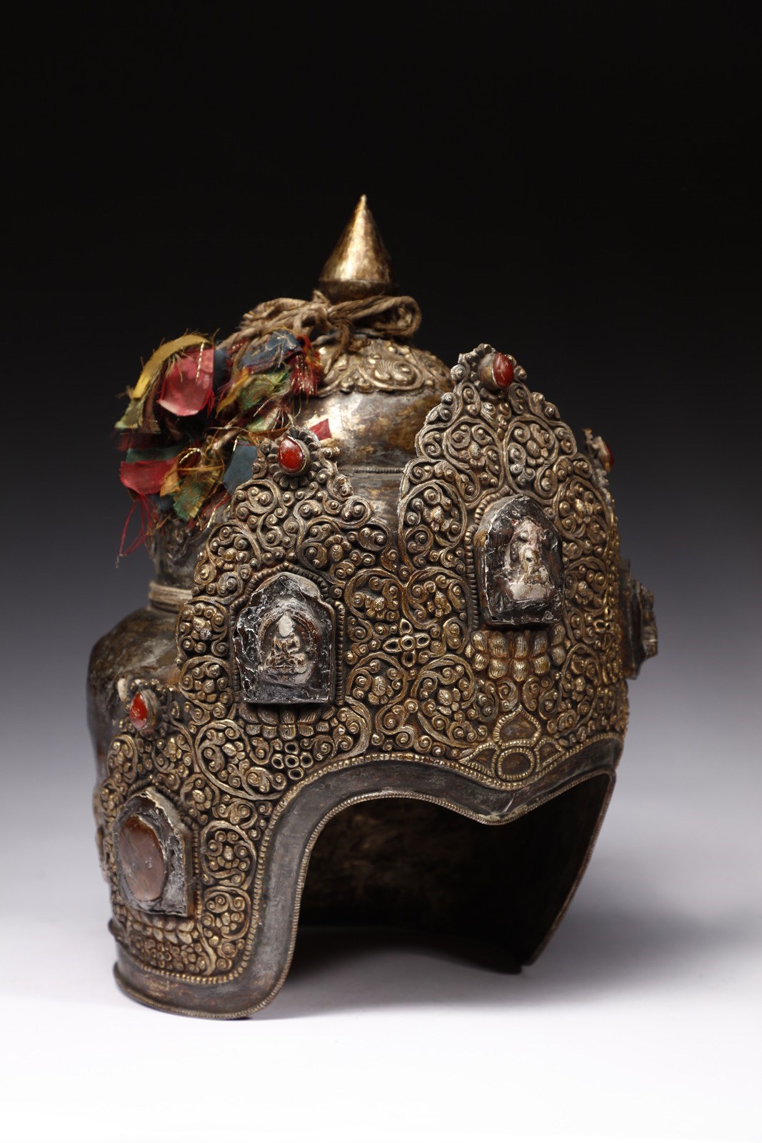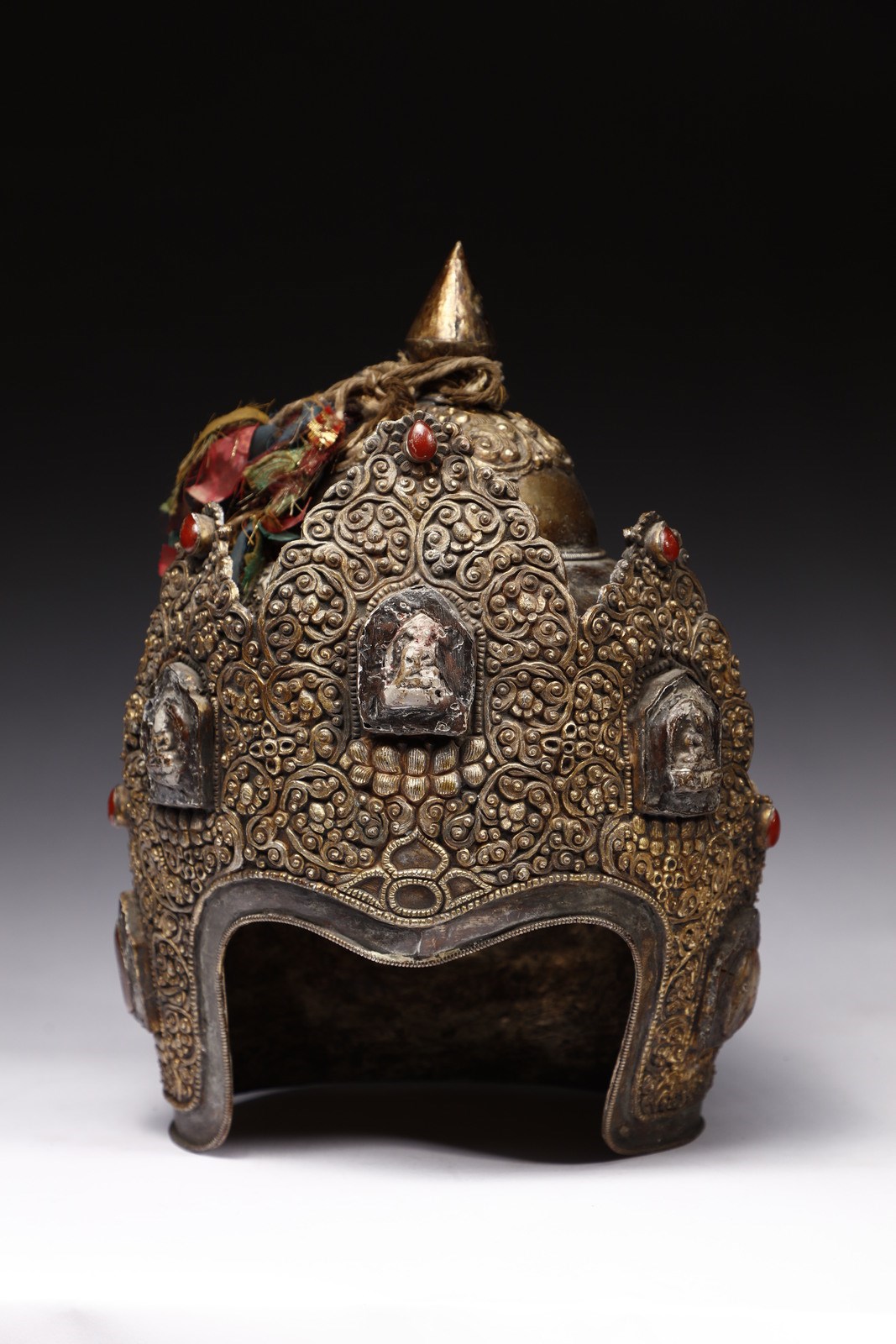 Nepal, Valle di Kathmandu, etnia Newari, XX secolo . . Cm 25,00 x 34,00. Corona devozionale dell'ordine monastico Vajracharya in metallo parzialmente dorato composta da casco con cinque punte cesellate con volute floreali sul fronte. Ogni punta termina con un castone con corallo tagliato a goccia e contiene la raffigurazione di un Buddha Trascendente: Amitabha, Vairocana, Amoghasiddi, Ratnasambhava e Akshobya.