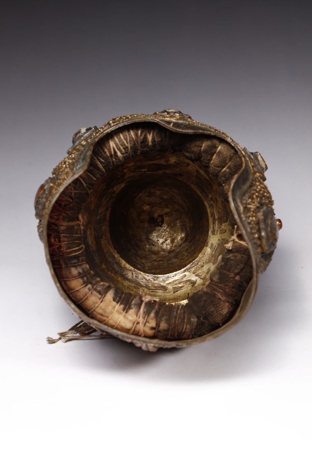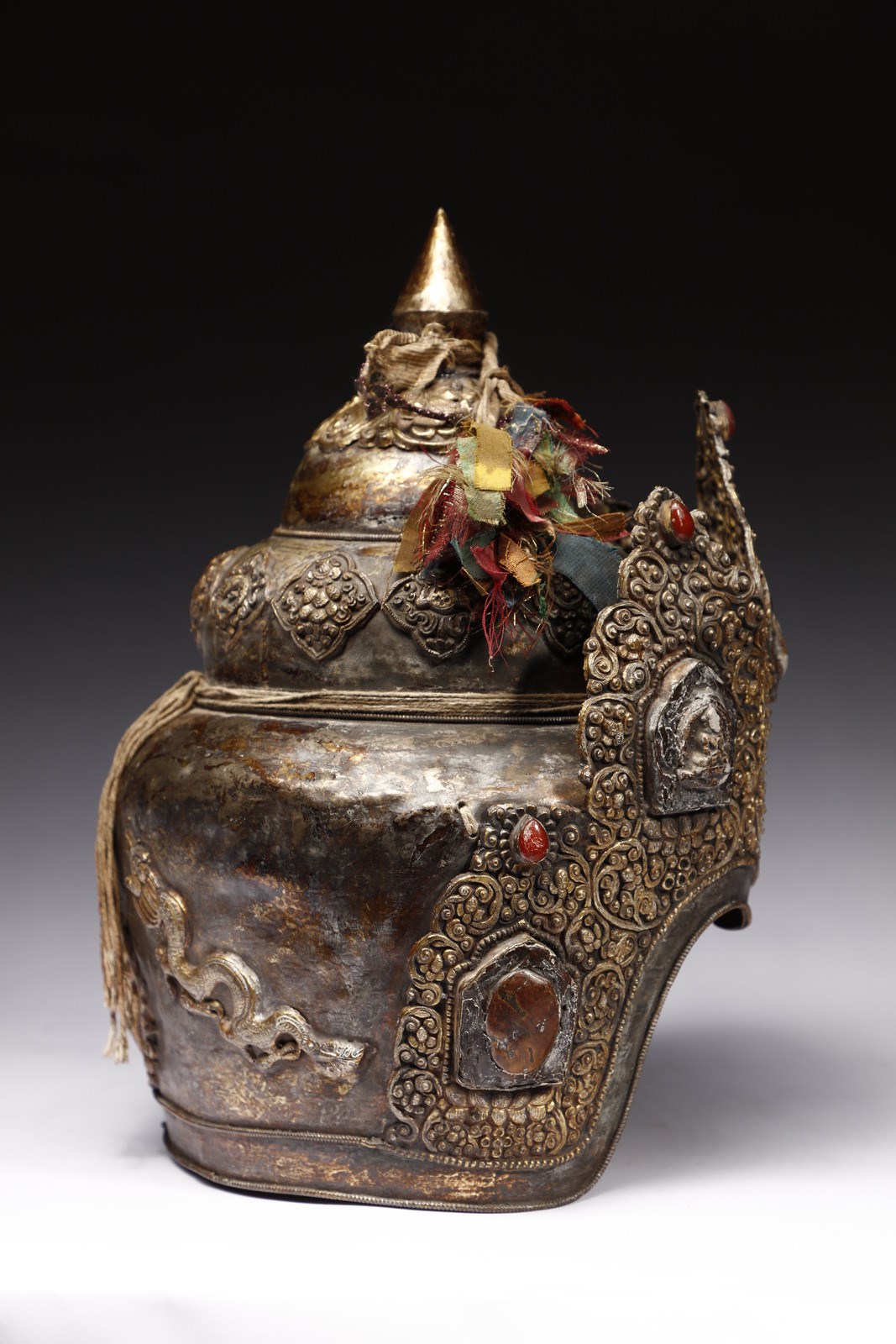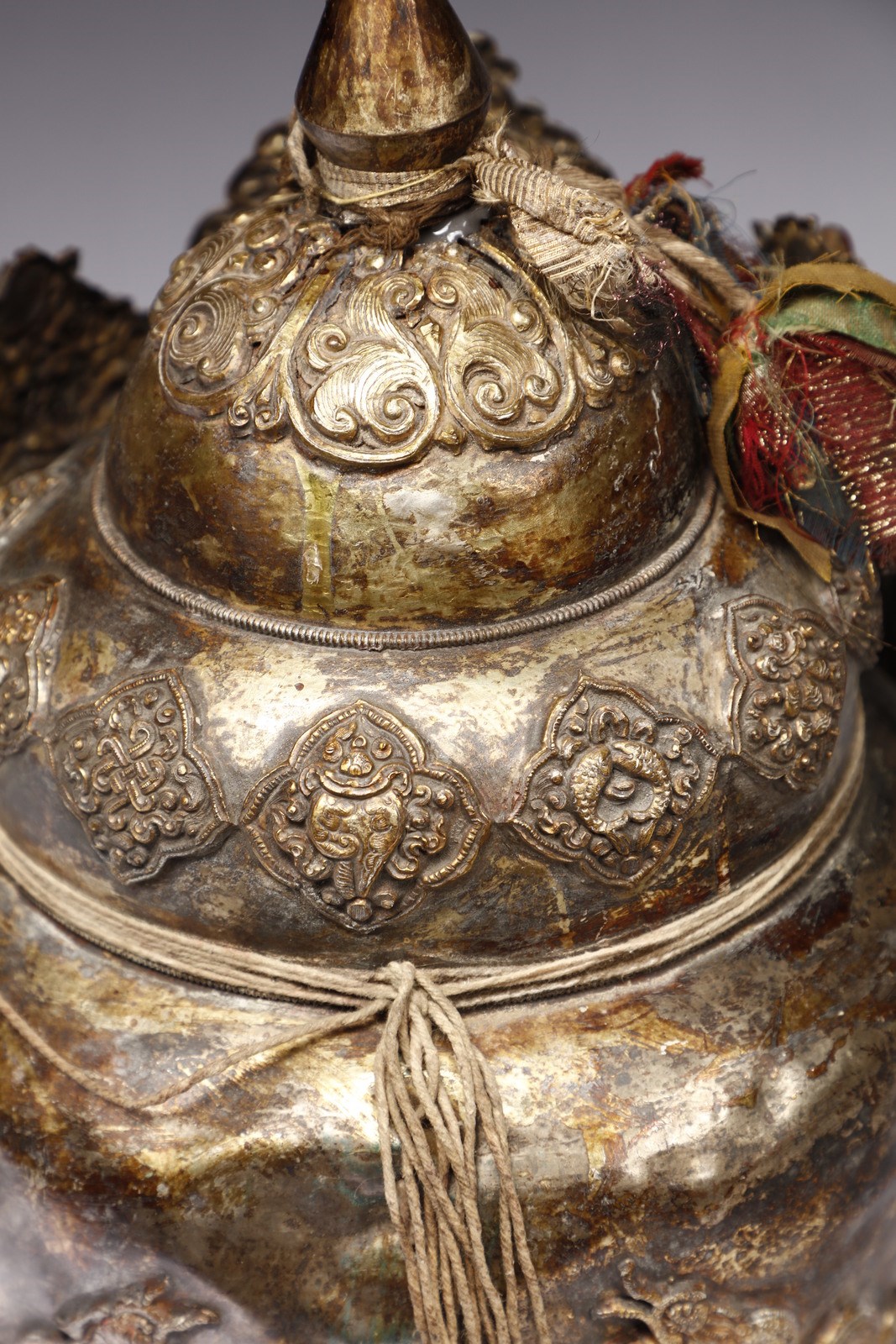 Nepal, Valle di Kathmandu, etnia Newari, XX secolo . . Cm 25,00 x 34,00. Corona devozionale dell'ordine monastico Vajracharya in metallo parzialmente dorato composta da casco con cinque punte cesellate con volute floreali sul fronte. Ogni punta termina con un castone con corallo tagliato a goccia e contiene la raffigurazione di un Buddha Trascendente: Amitabha, Vairocana, Amoghasiddi, Ratnasambhava e Akshobya.