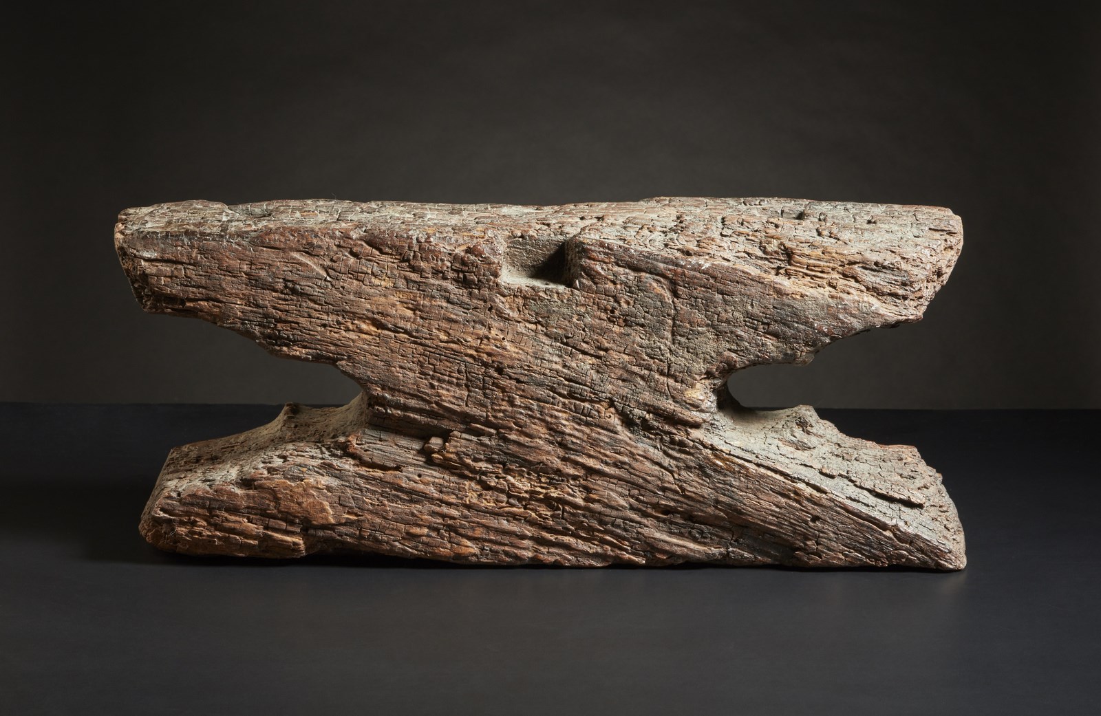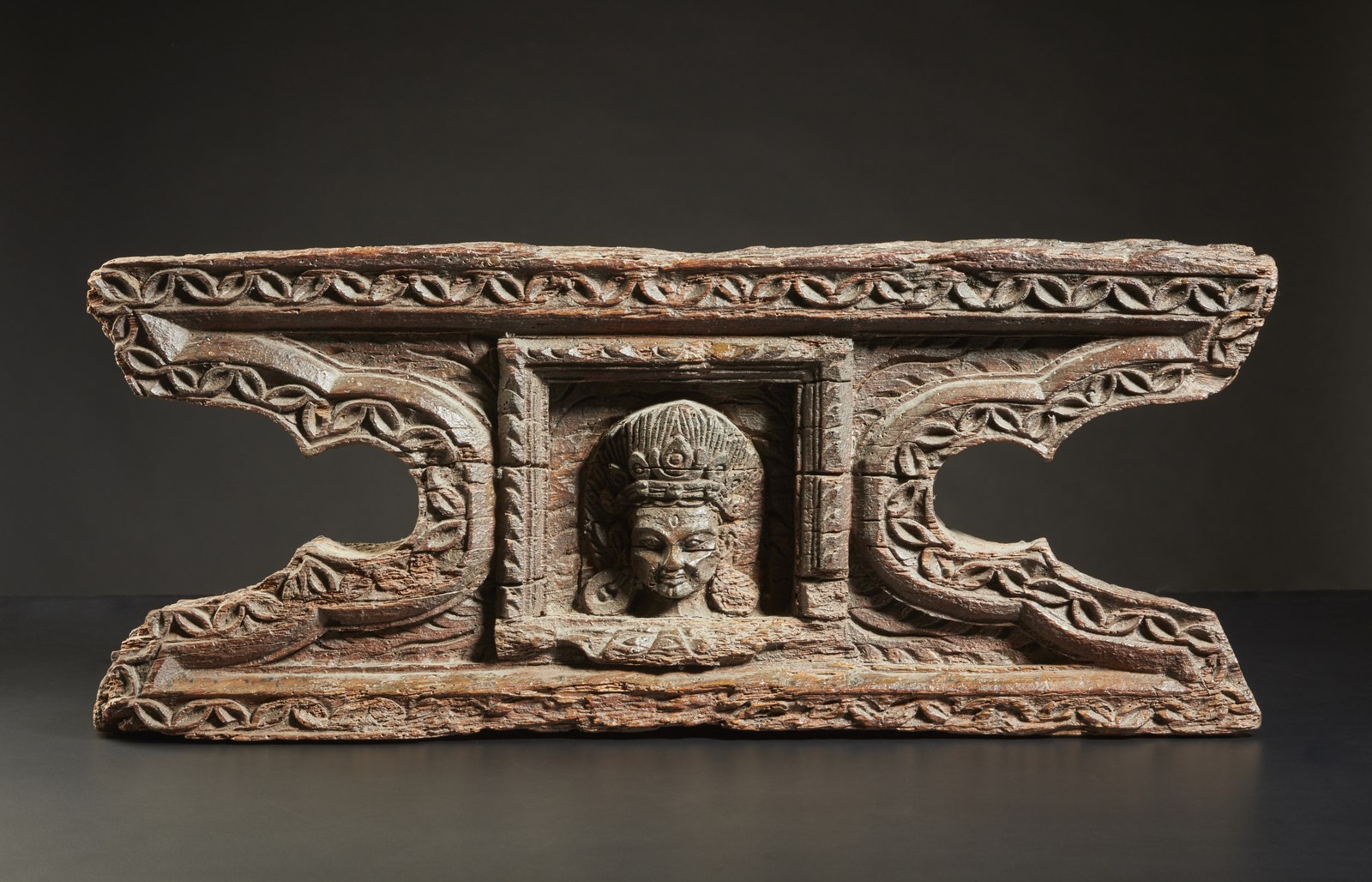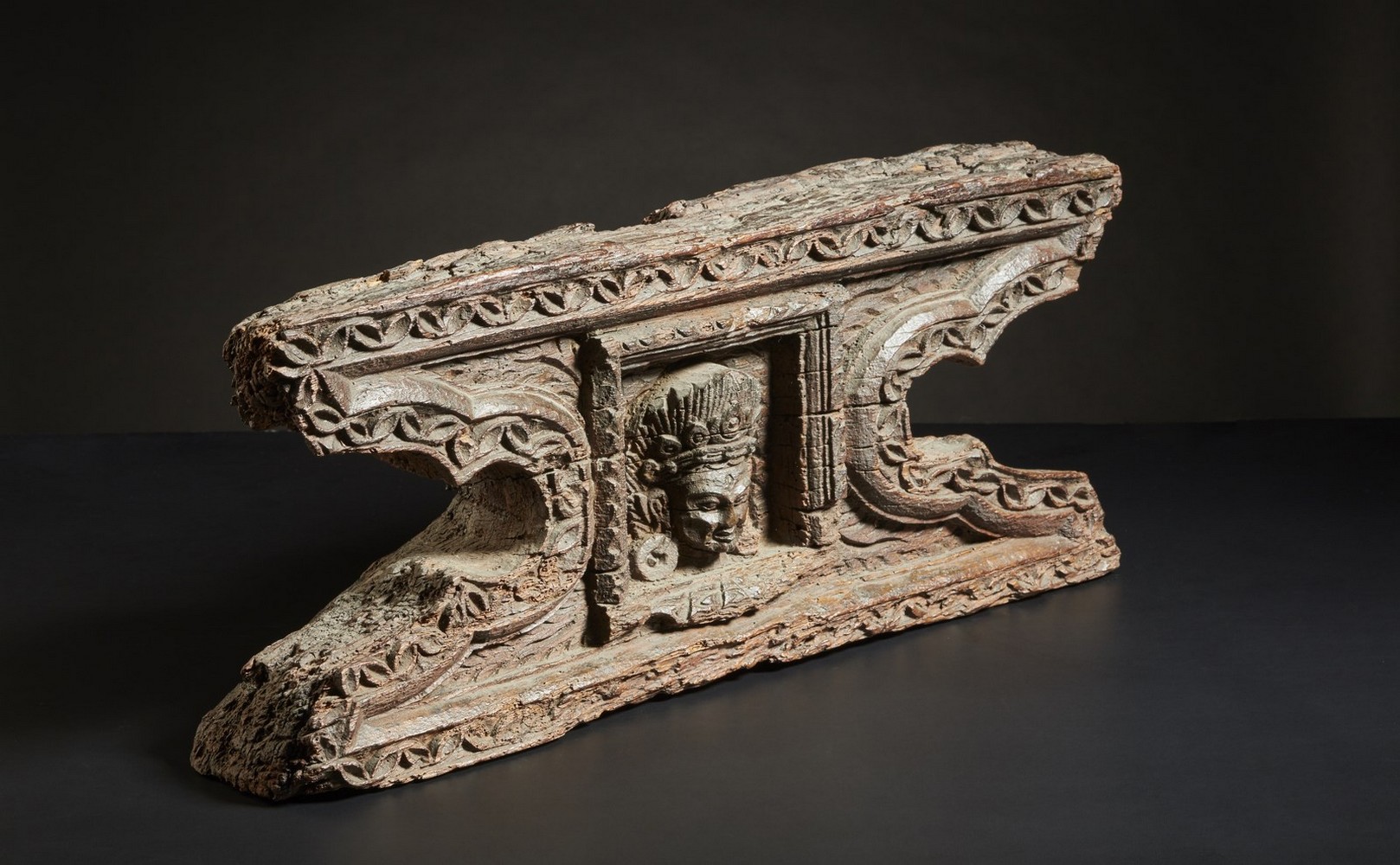 Nepal, XVII-XVIII secolo. . Cm 52,50 x 21,50 x 10,00. Elemento architettonico in legno facente parte probabilmente di un complesso decorativo templare più ampio con centralmente ritratta la testa di Mahakala.