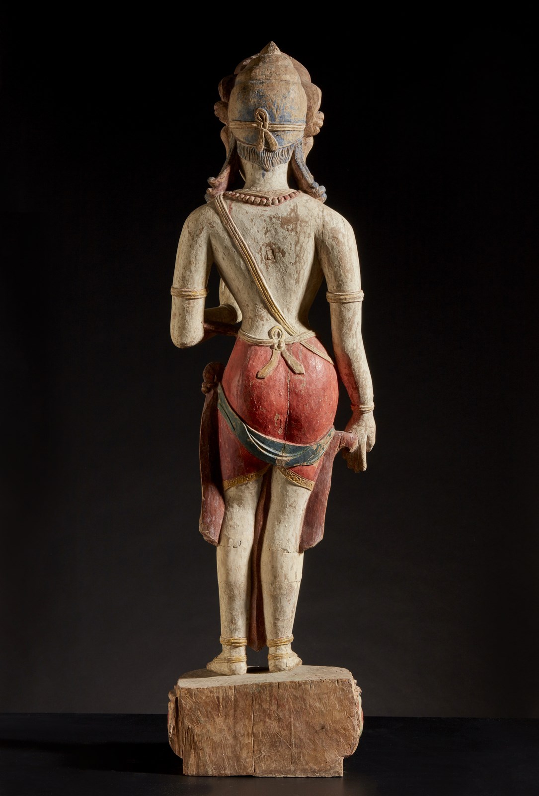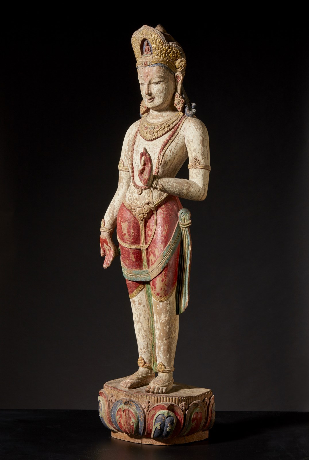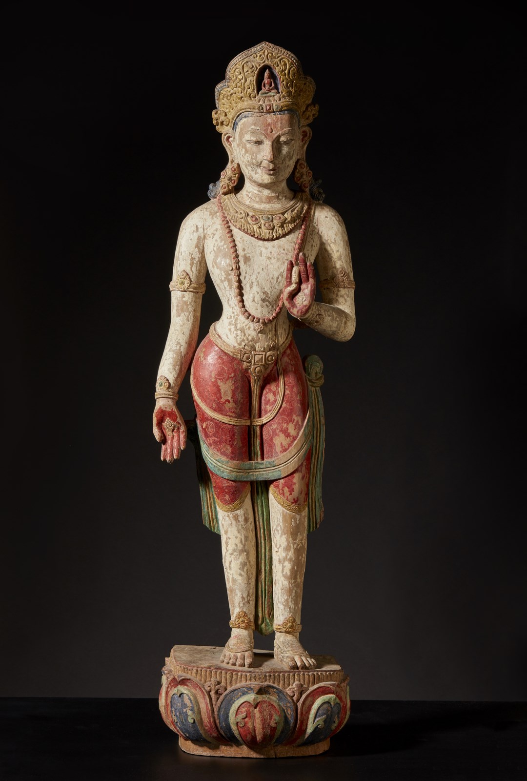 . . Cm 33,00 x 116,00. Rara e importante scultura lignea raffigurante il Bodhisattva della compassione Avalokitesvara, che in questa particolare rappresentazione stante prende il nome di Padmapani.