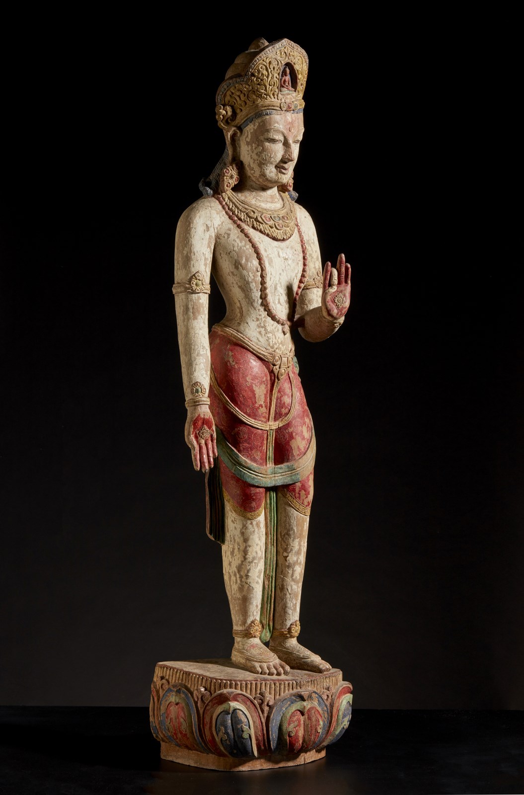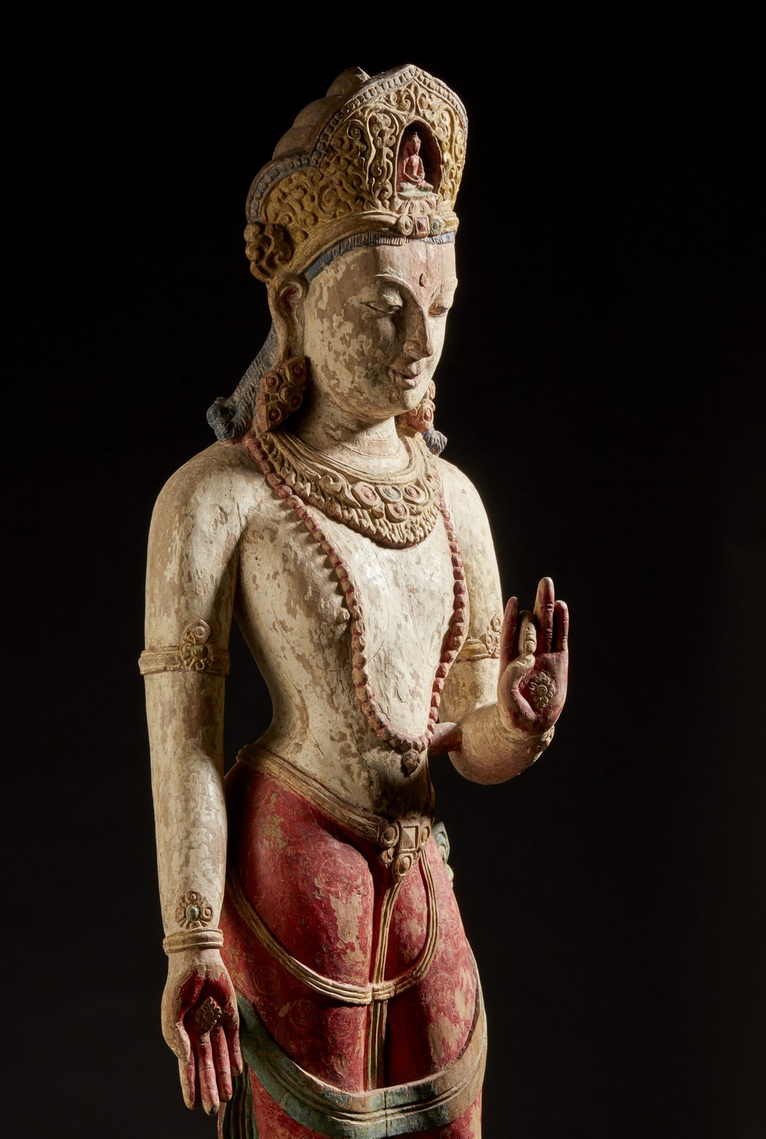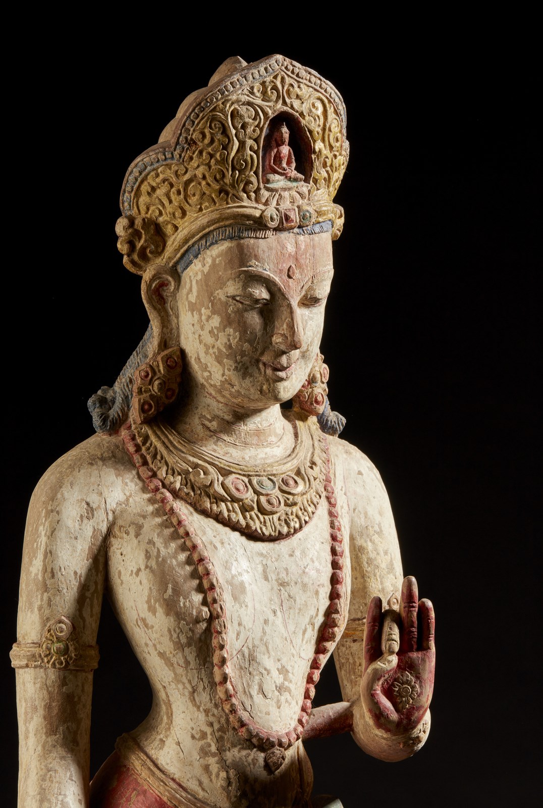 . . Cm 33,00 x 116,00. Rara e importante scultura lignea raffigurante il Bodhisattva della compassione Avalokitesvara, che in questa particolare rappresentazione stante prende il nome di Padmapani.