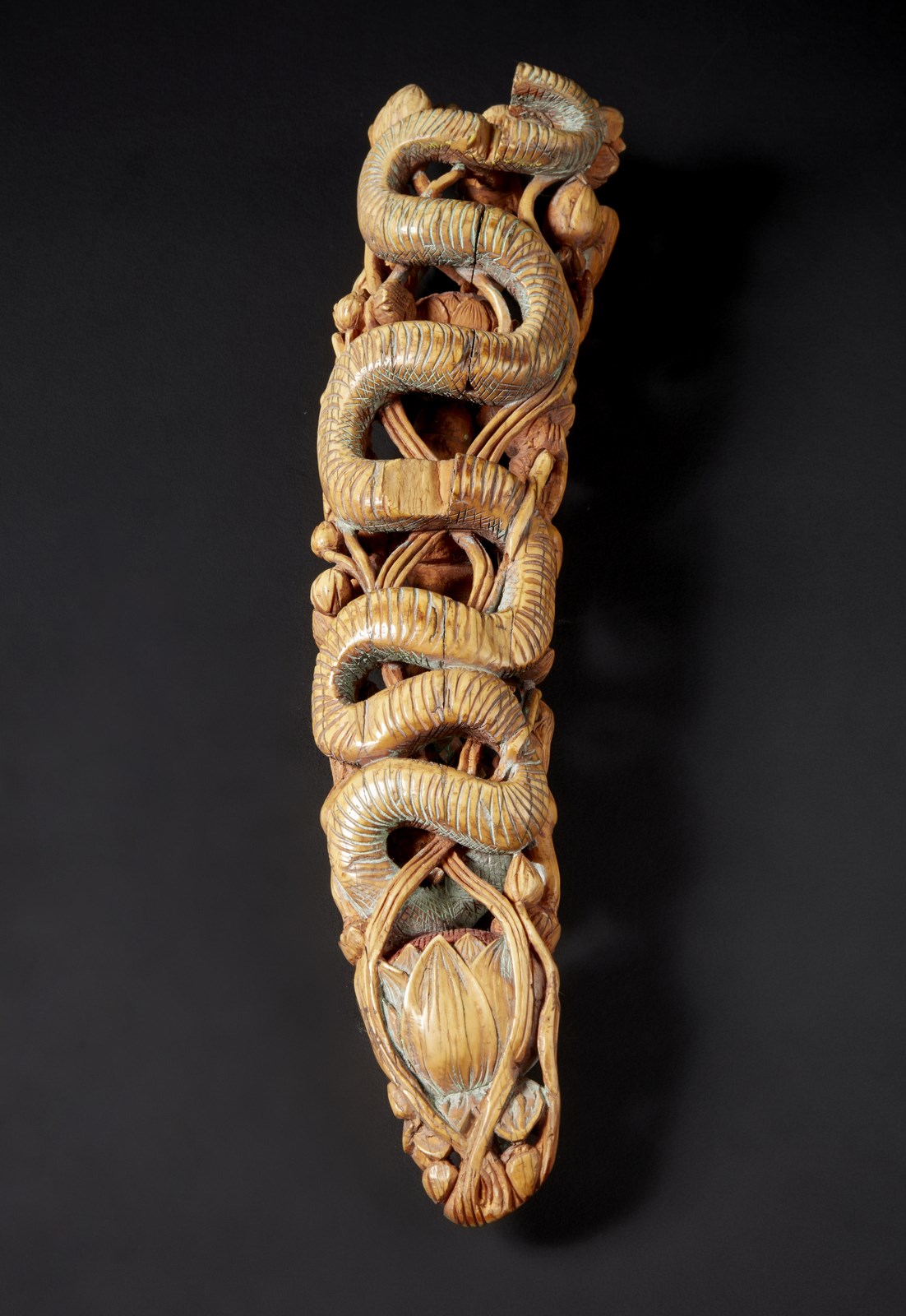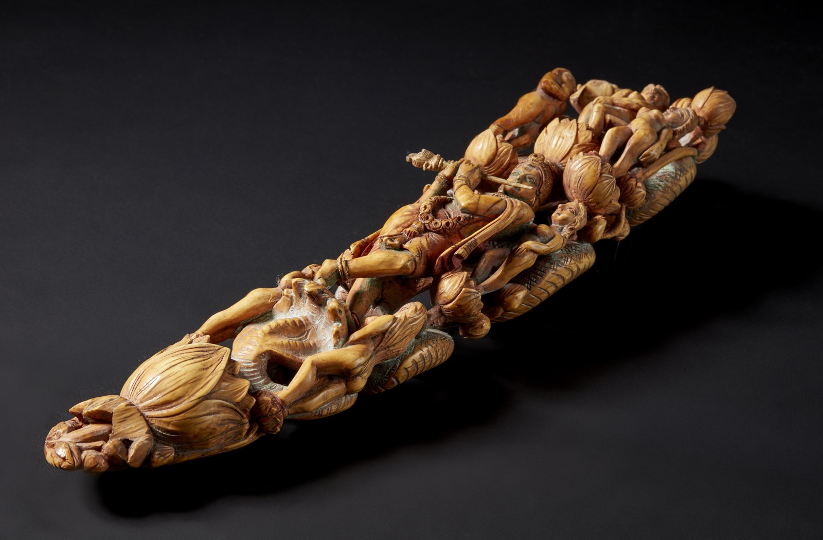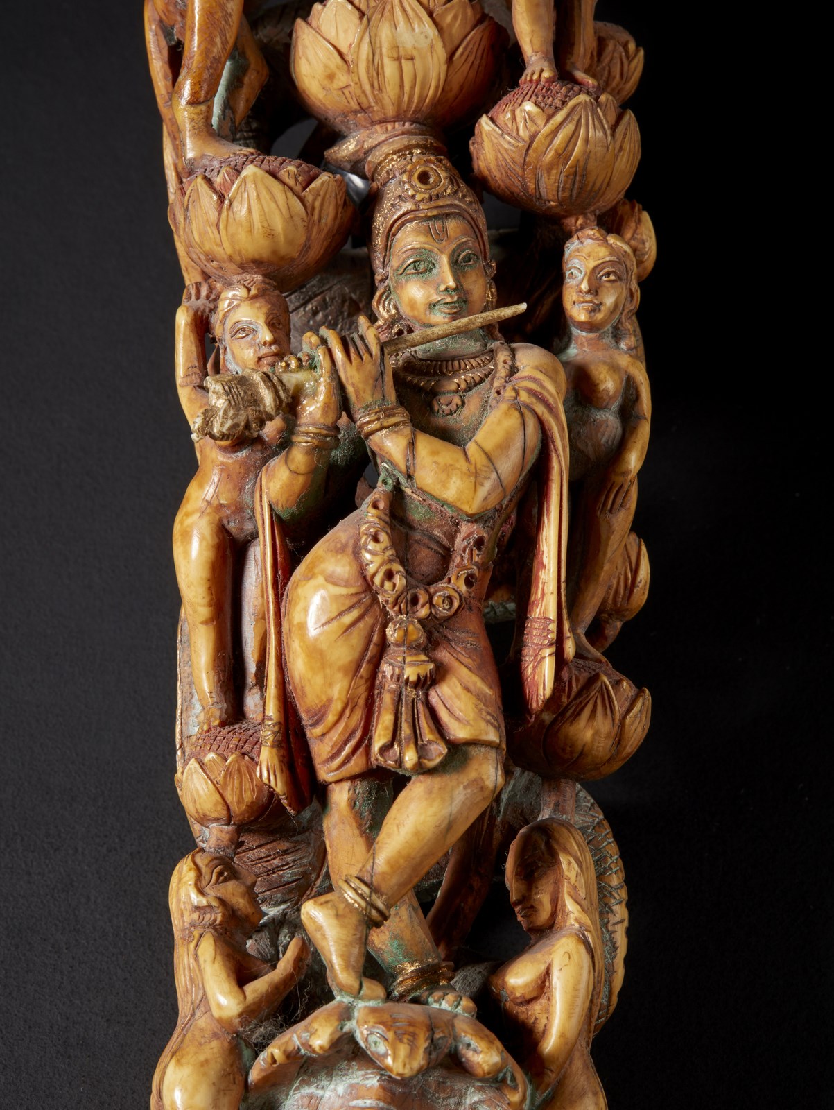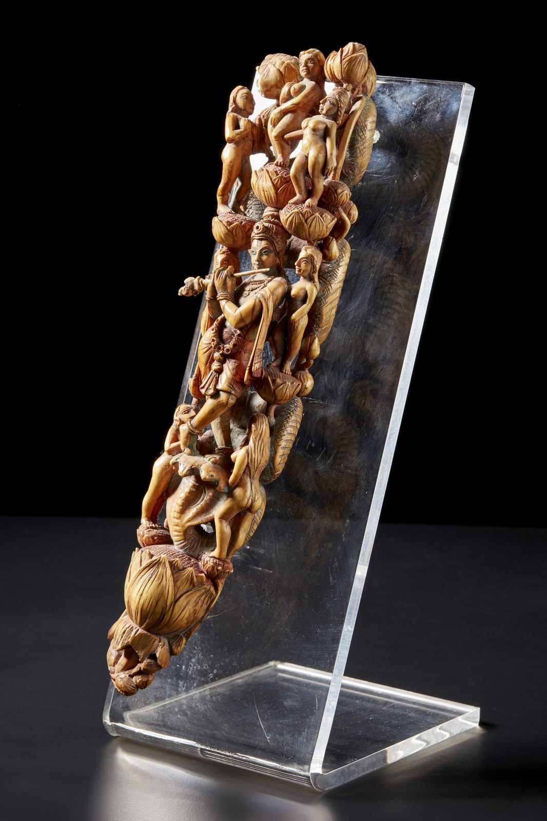 India, Goa, XVIII-XIX secolo. . Cm 7,00 x 30,50. Punta di zanna di elefante finemente intagliata a traforo, ritraente centralmente Krishna nell’atto di suonare un flauto che, in questa particolare manifestazione, prende il nome di Venugopala. La figura principale é inoltre attorniata da sette pastorelle svestite, ognuna delle quali poggia su un fiore di loto. Presenti su tutta l’opera tracce policrome.