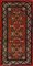 inizio XX secolo . . Cm 60,00 x 119,00. Tappeto rettangolare in lana, decorato con tre medaglioni floreali su sfondo color corallo e bordura con motivo a zig zag campito con fiori con colori alternati.