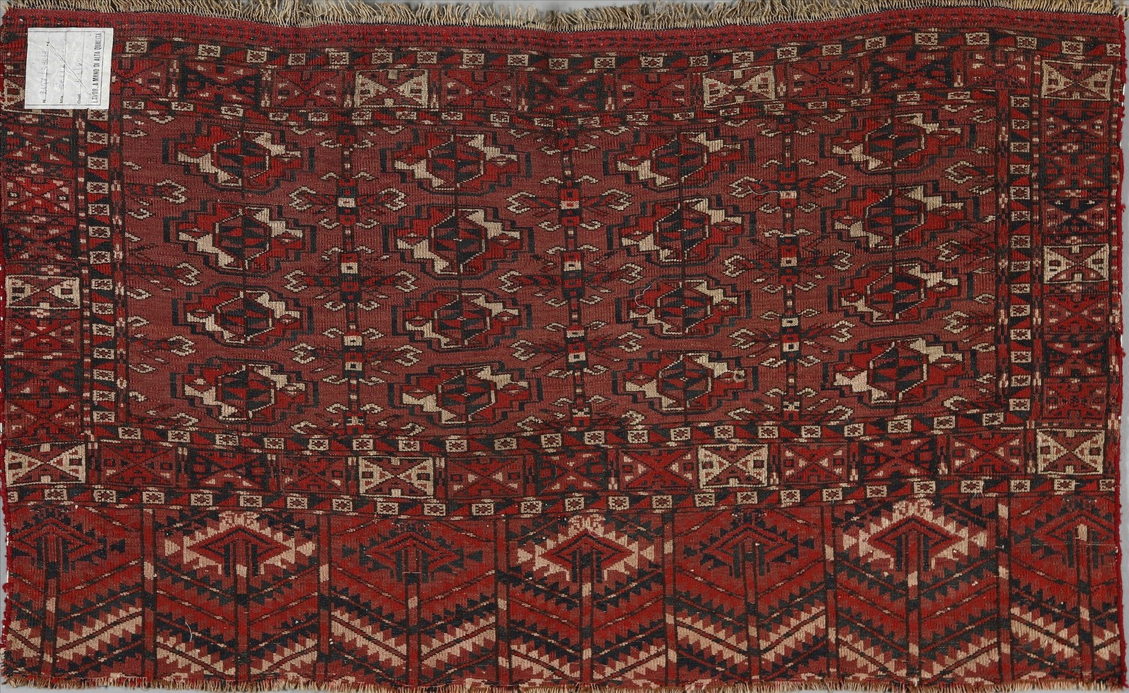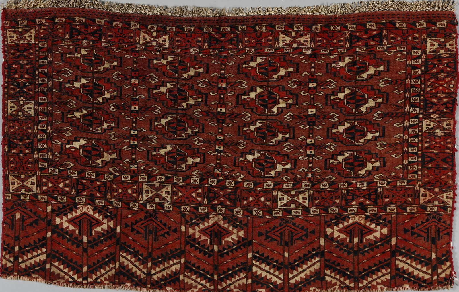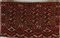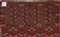 Turkmenistan, inizio XX secolo. . Cm 63,00 x 104,00. Piccolo tappeto a fondo rosso decorato a elementi geometrici neri e crema.