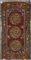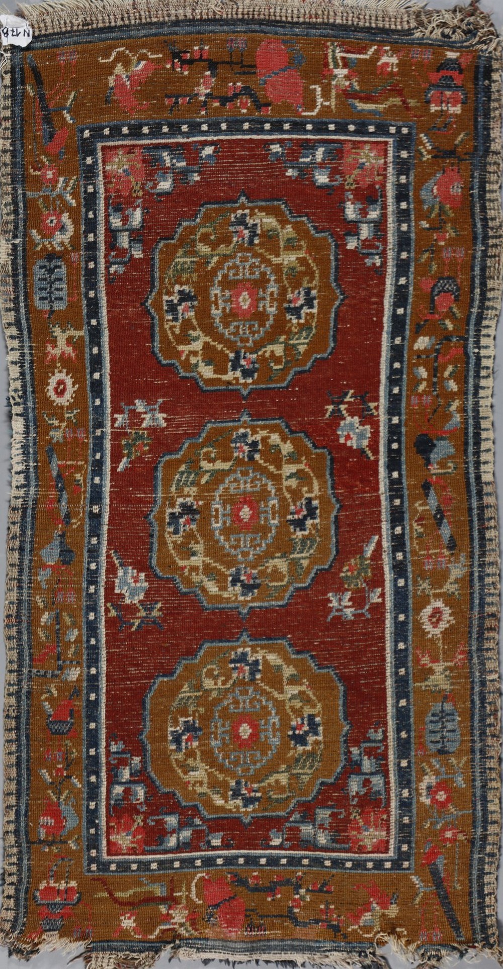 Tibet, XIX secolo. . . Tappeto a fondo rosso con cornice e tre riserve centrali color ocra, presente su tutta la superficie decori a motivi floreali stilizzati.