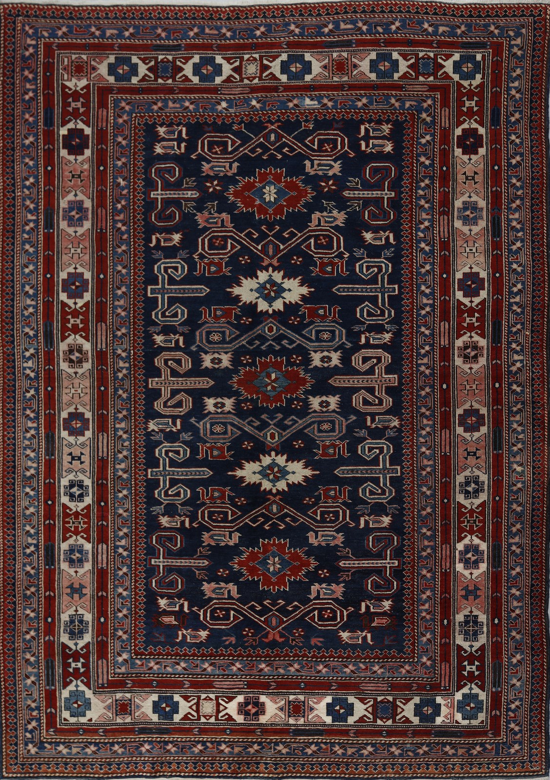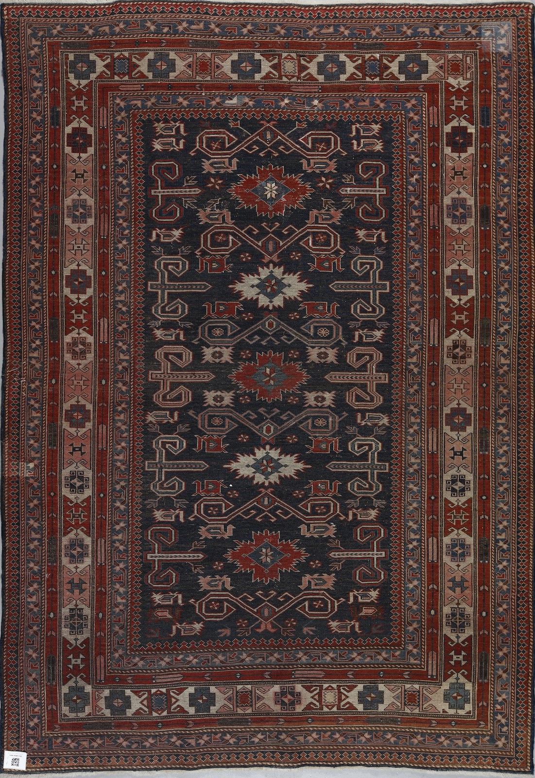 Caucaso, anni '30-'40. . Cm 137,00 x 193,00. Tappeto in lana con bordure concentriche floreali, campitura centrale decorata con stelle rosse e beige alternate e separate dal classico motivo Wurma, a corna di ariete.