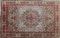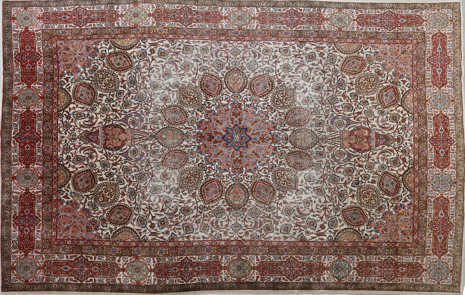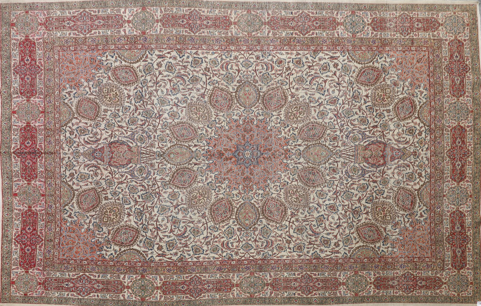 . . Cm 290,00 x 380,00. Grande tappeto in lana dall'affollato decoro fitomorfo arrangiato in cartucce ovoidali, allungate nella bordura, oppure libero sullo sfondo beige.