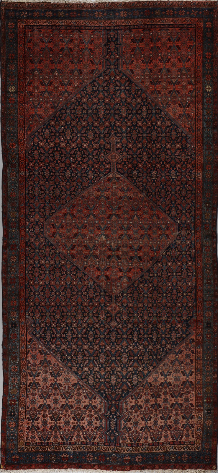 Persia, 1950 ca. . . Cm 163,00 x 365,00. Tappeto in lana decorato con medaglione romboidale centrale entro cartuccia geometrica su sfondo blu con cantonali rossi. Bordura su sfondo scuro. Tutto il tappeto è decorato con una moltitudine di fiori caleidoscopici e stilizzati.