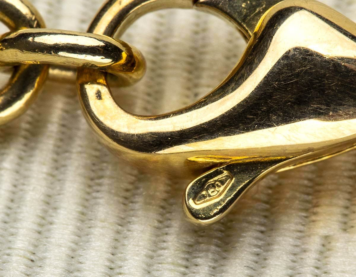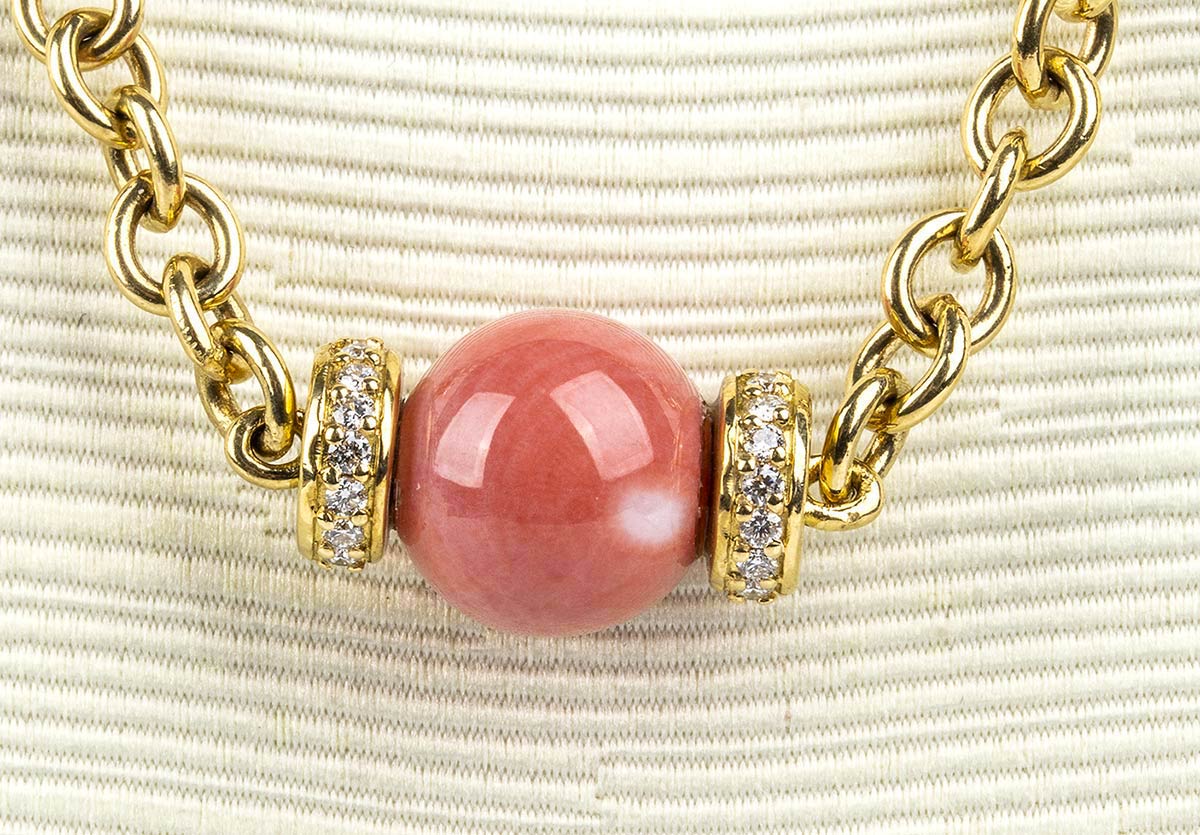 catena a maglia forzatina in oro giallo 18k, interrotta da sfere di corallo Cerasuolo (corallium elatius), dettagli in diamanti taglio brillante 2,07 ct circa, G, VS. Diametro corallo 12-12,5 mm. Peso 82,3 gr. Punzonata "750", "307 NA" e "ROVIAN". Stato di conservazione: ***** eccellente.