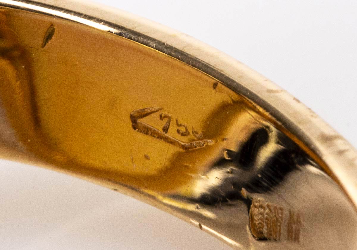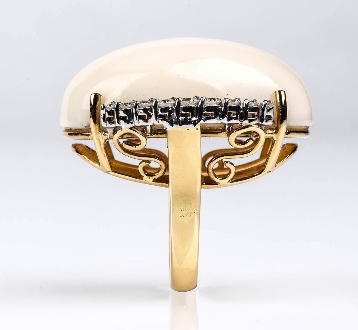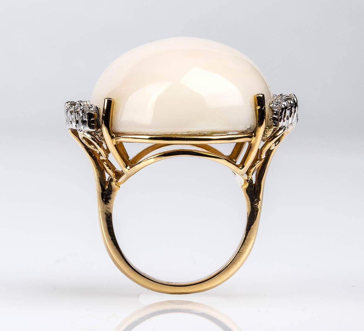 oro giallo 18k, incastonato con cabochon di corallo pelle d'angelo (corallium secundum) affiancato da diamanti taglio brillante 0,85 ct circa, G, VVS-VS. Punzonato "750". Dimensioni fronte 35 x 30 mm. Peso 31 g. Misura IT 15,5 - Misura US 7,5. Stato di conservazione: ***** eccellente.