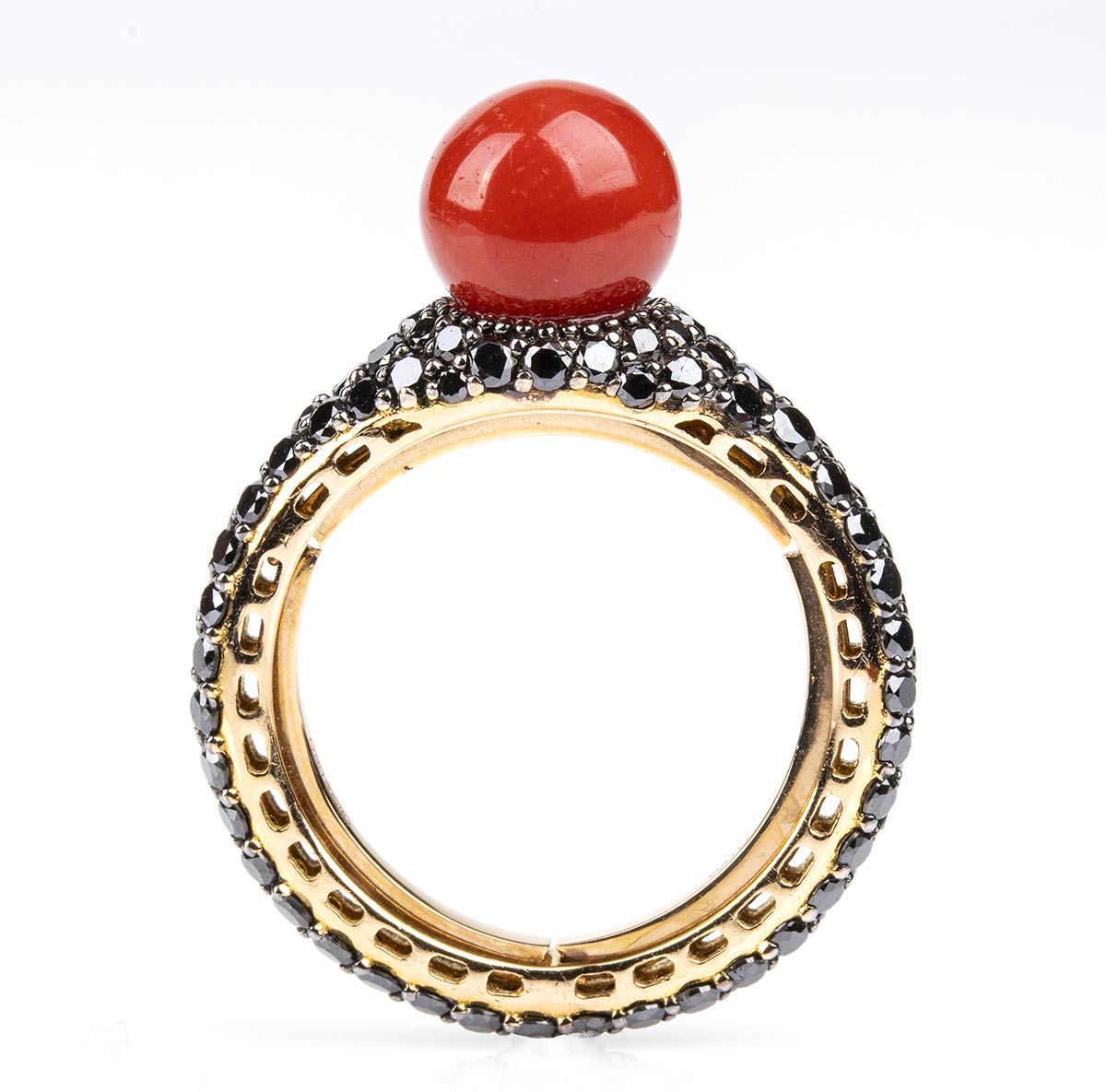 oro rosa 18k, con sfera di corallo Mediterraneo (corallium rubrum) affiancata da pavé di diamanti neri 1,96 ct circa. Punzonato "750", "4077" e "patented". Peso 6,5 g. Misura IT 16 - Misura US 7,5. Stato di conservazione: ***** eccellente.