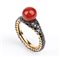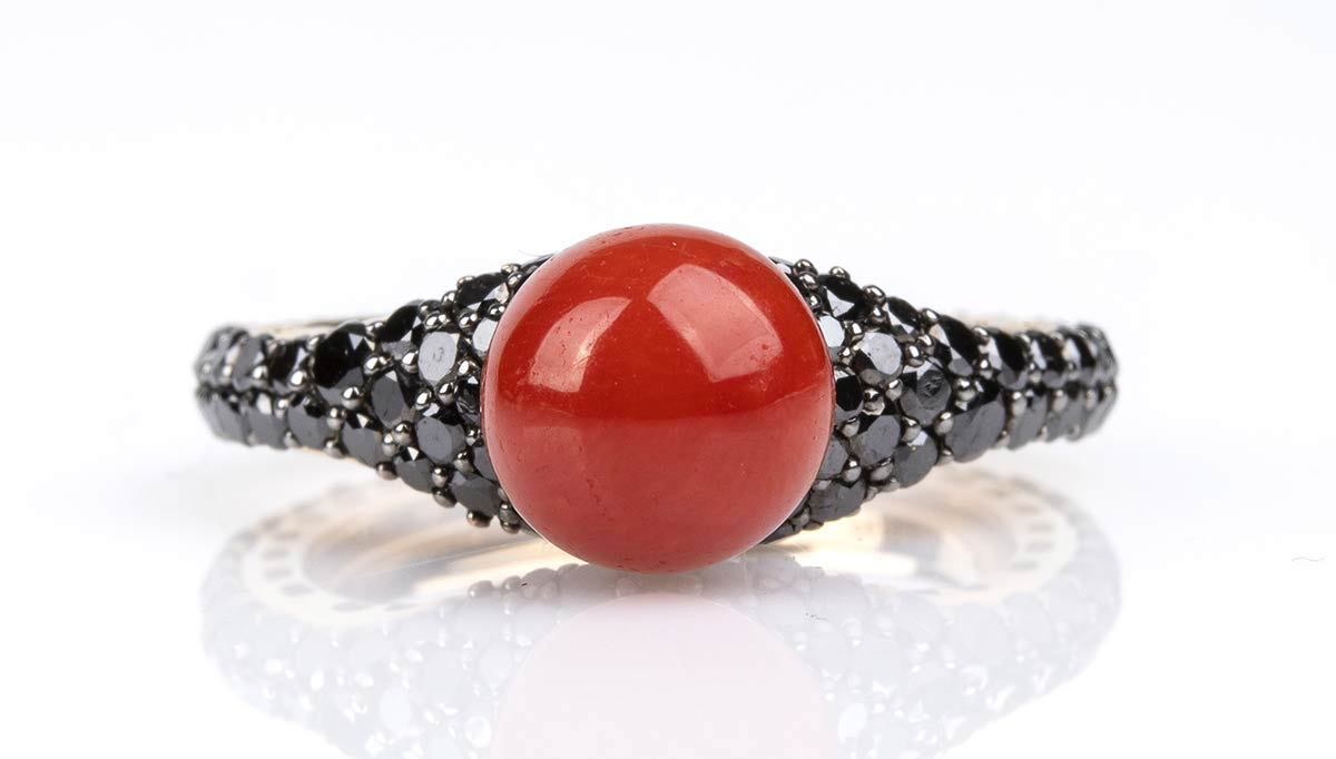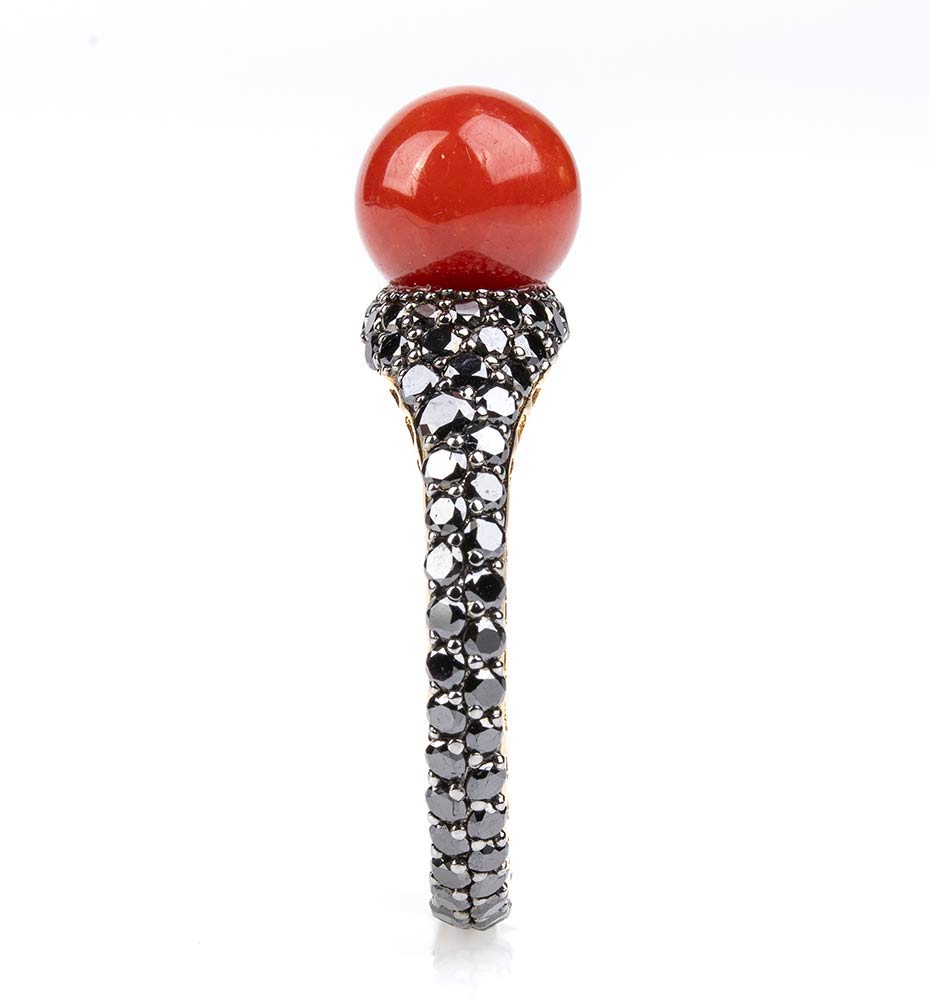 Anello in oro, corallo e diamanti neri