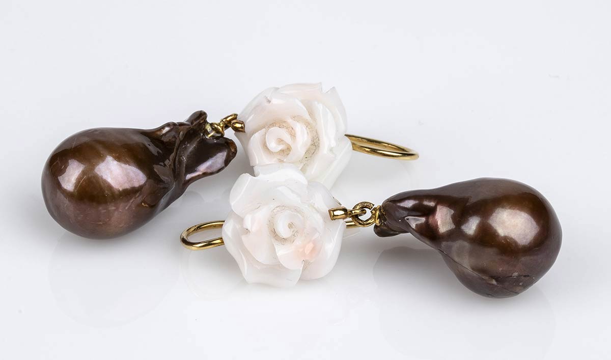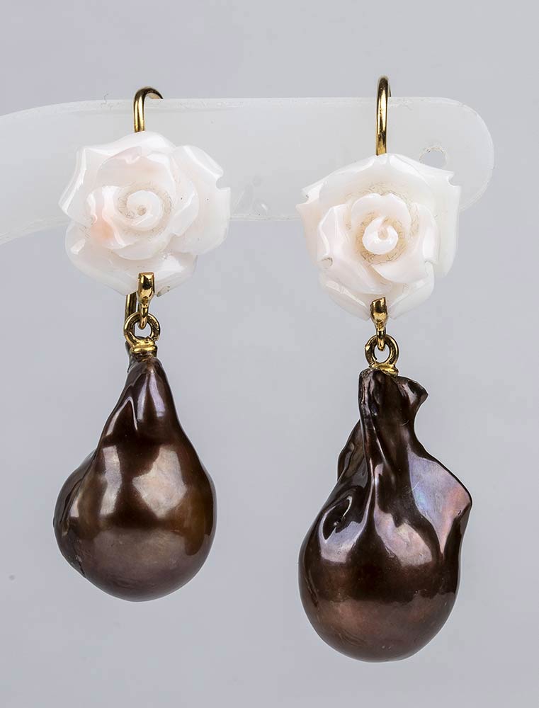 oro giallo 18k, ciascuno con corallo bianco (corallium konojoi) scolpito raffigurante una rosa a cui é sospesa una perla coltivata d'acqua dolce. Punzonati "750". Lunghezza 40 mm, diametro perle 13,5-14 mm. Peso 15,1 gr. Stato di conservazione: ***** eccellente.