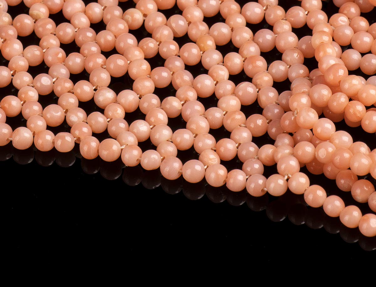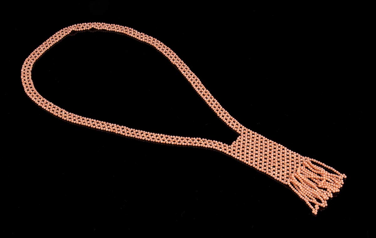 (corallium secundum). lunghezza senza pendente 66 cm, lunghezza pendente e frangia 13 cm, peso 47 gr circa. Stato di conservazione: ***** eccellente.