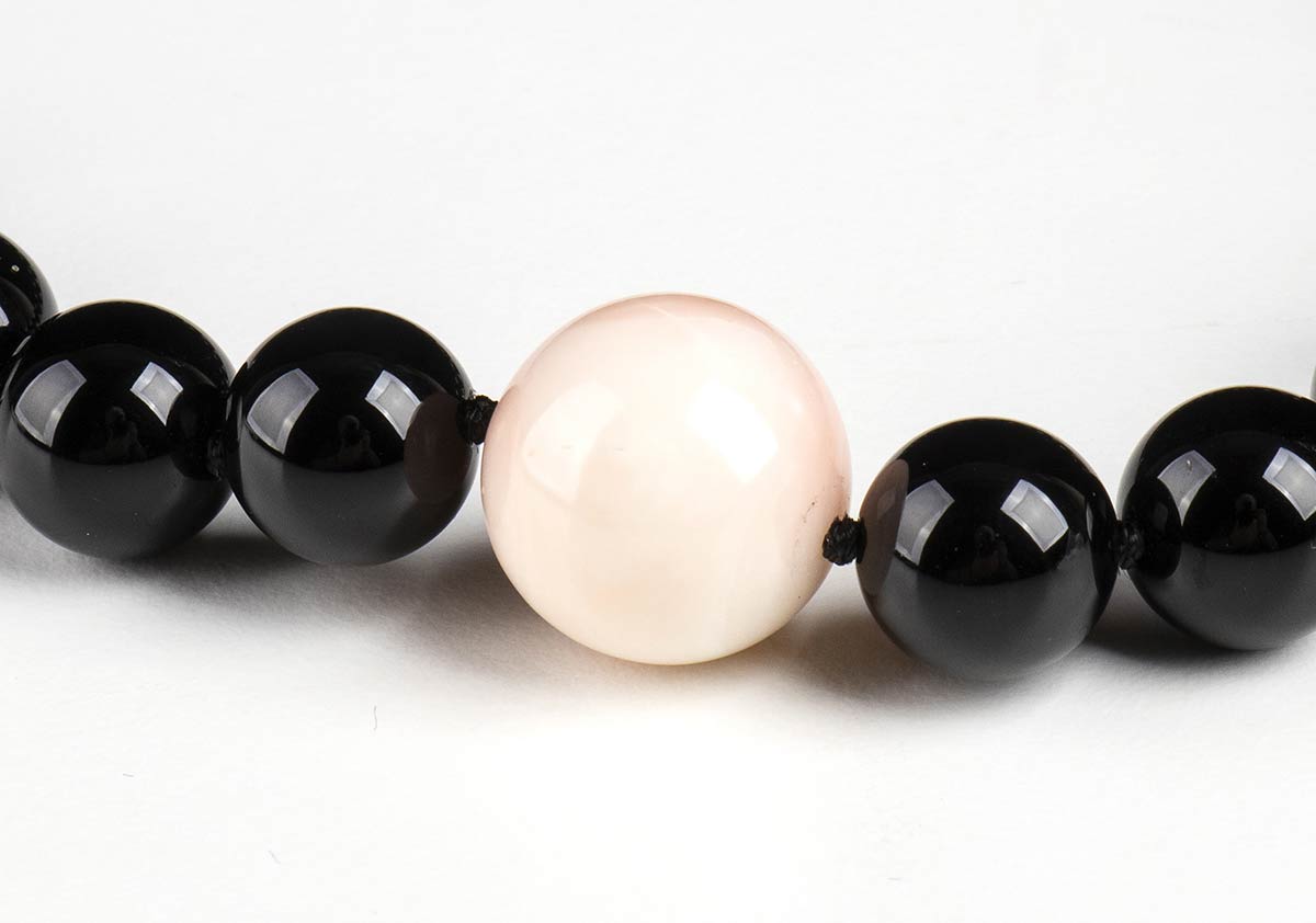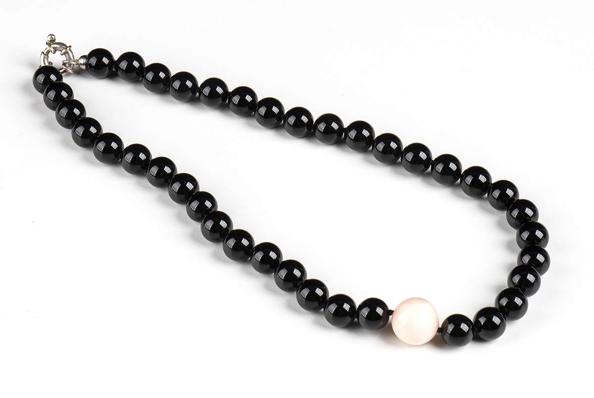diametro sfere di onice 10-10,5 mm, sfera di corallo rosa (corallium secundum) diametro 14,5-15. Lunghezza 48 cm, peso 62 gr circa. Stato di conservazione: ***** eccellente.