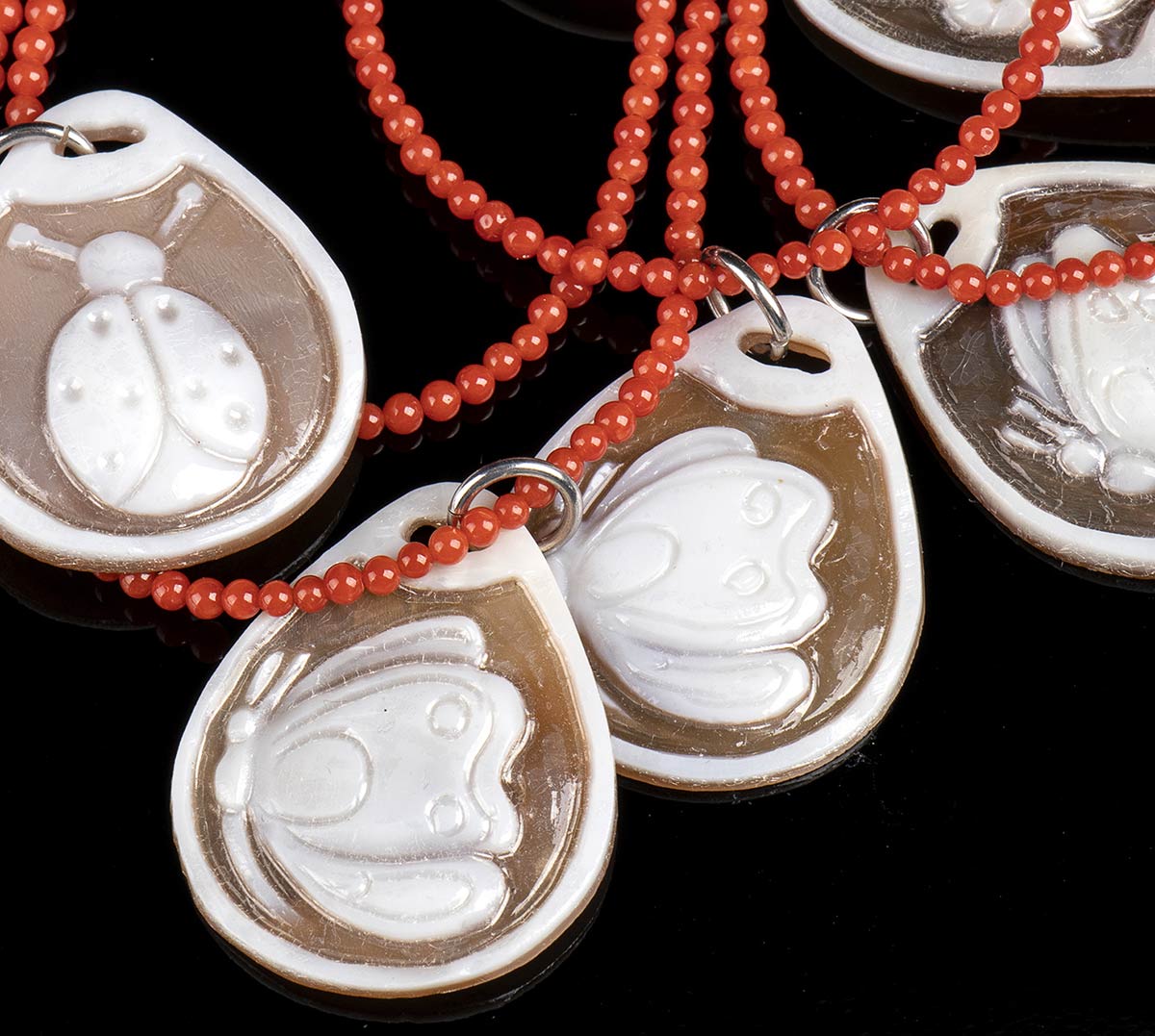 7 bracciali e 7 girocolli in corallo Mediterraneo e cammeo su conchiglia marina