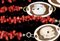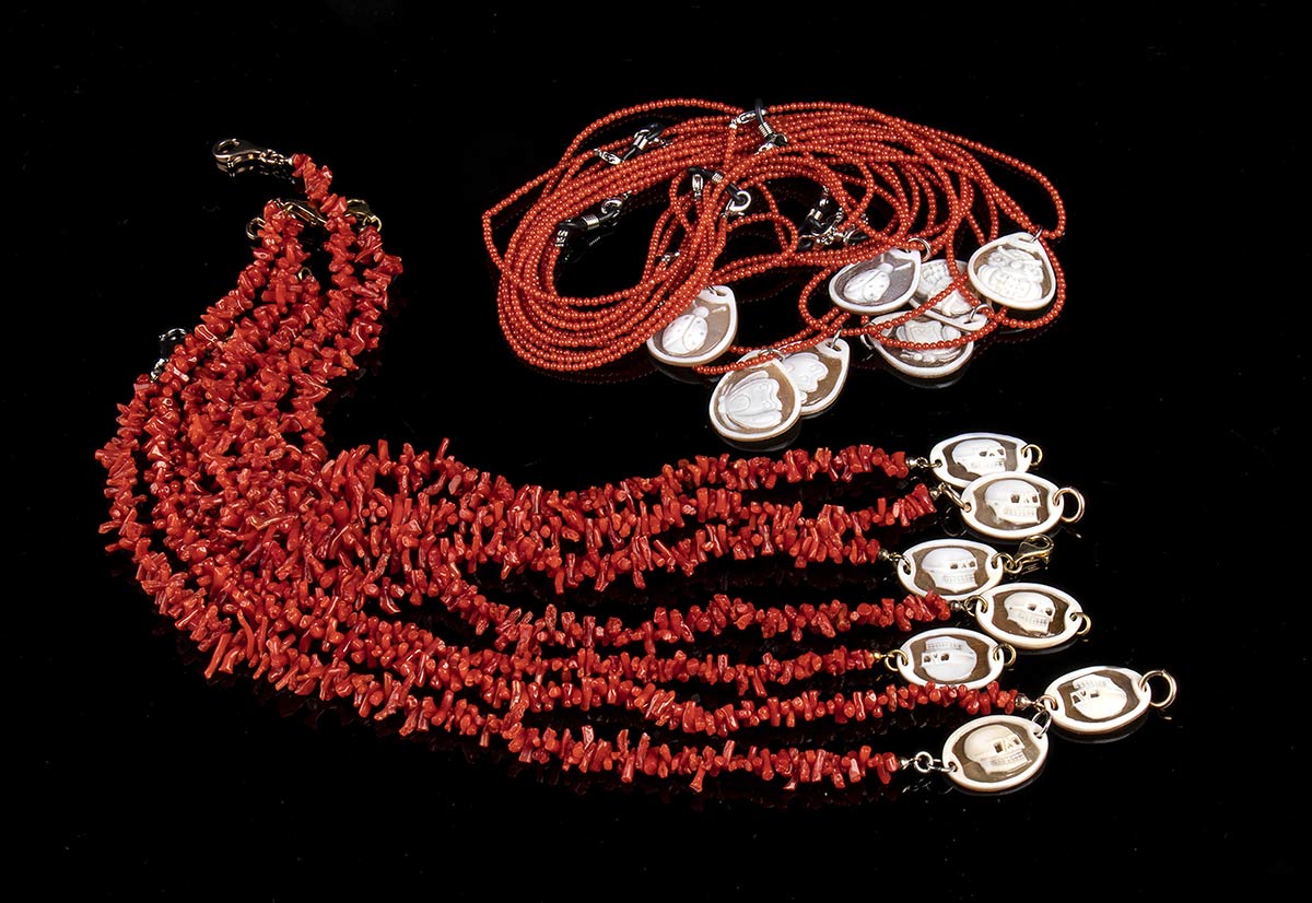 7 bracciali con ramettti di corallo Mediterraneo (corallium rubrum) e conchiglia marina (famiglia cassidae), Dimensioni cammei 24 x 19 mm, lunghezze da 30 a 39 cm; 7 girocolli con sfere di corallo Mediterraneo (corallium rubrum) e conchiglia marina (famiglia cassidae), diametro corallo 2,5 mm, diametro conchiglia 25 mm, lunghezza 60 cm. Peso totale 158 gr circa. Stato di conservazione: ***** eccellente.