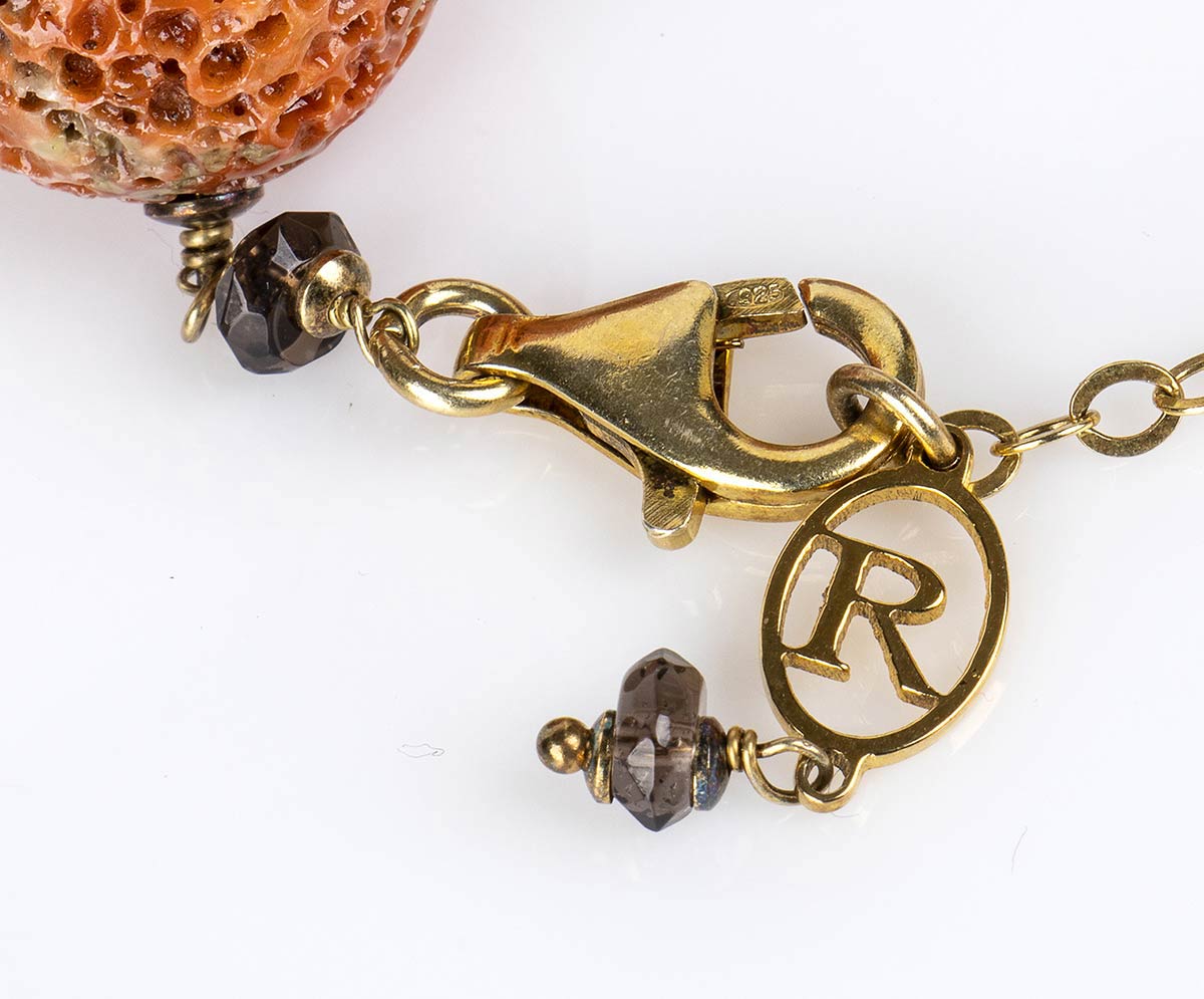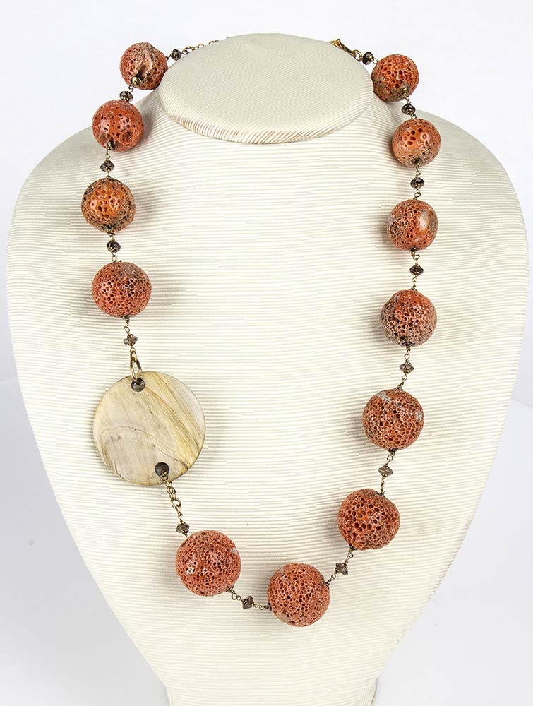 Girocollo con sfere di corallo cerasuolo, corno e quarzo fumé