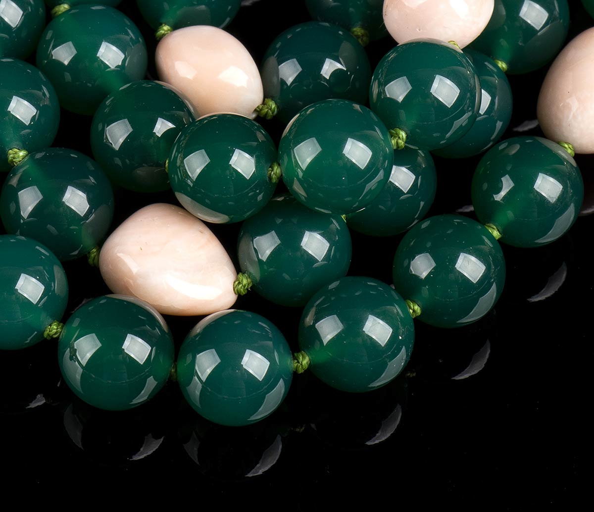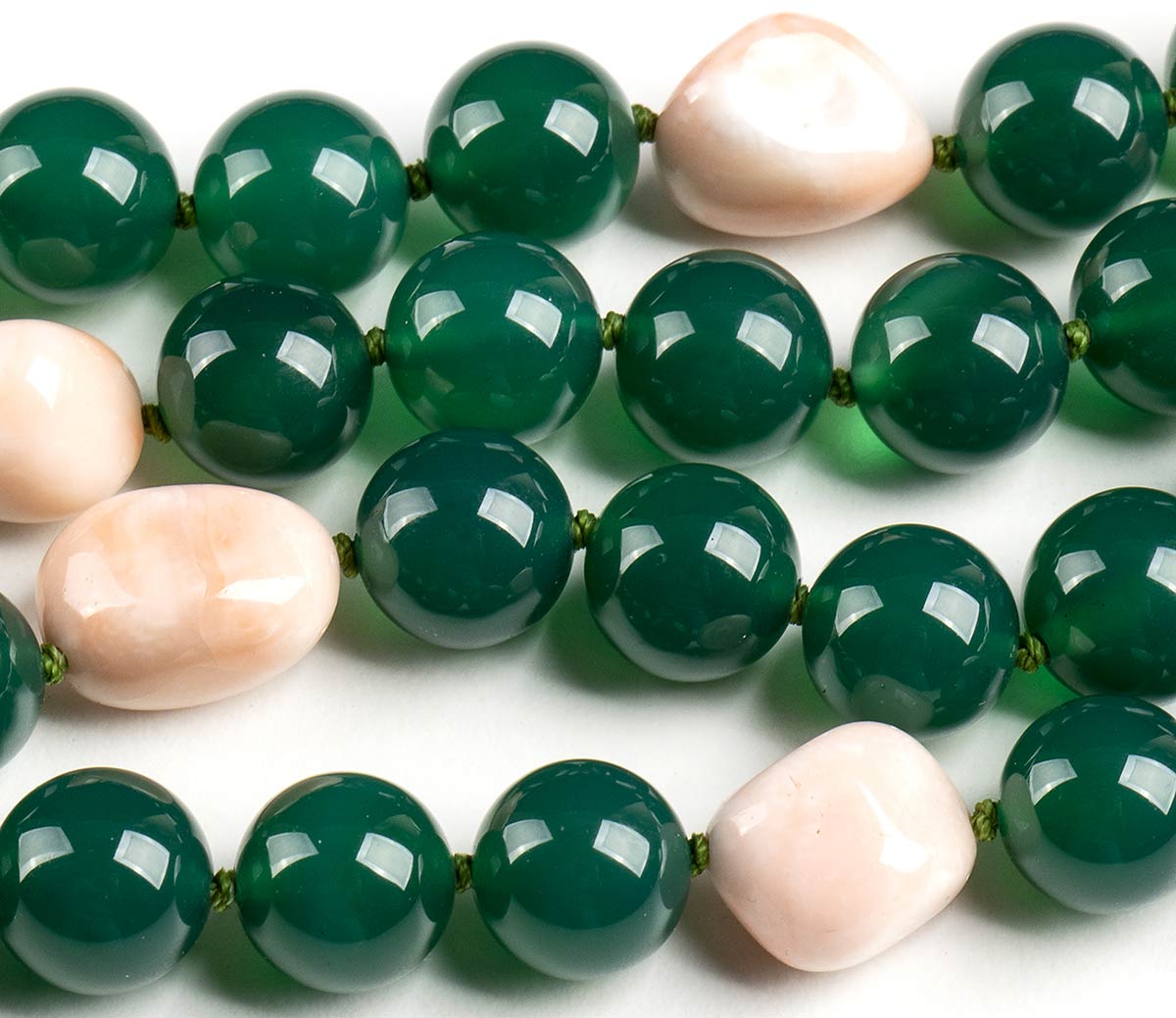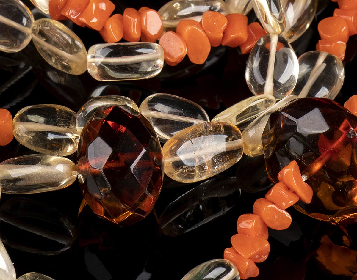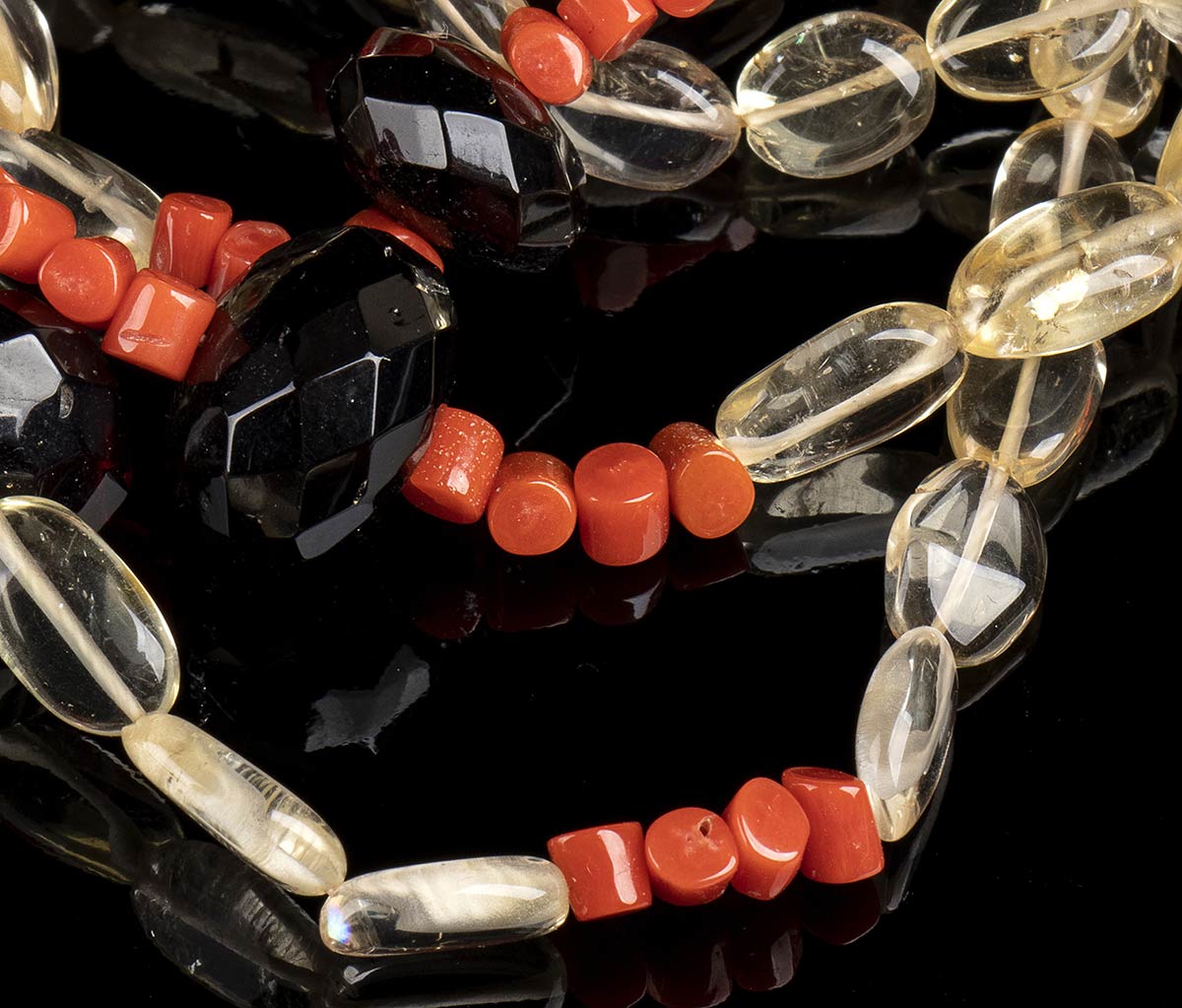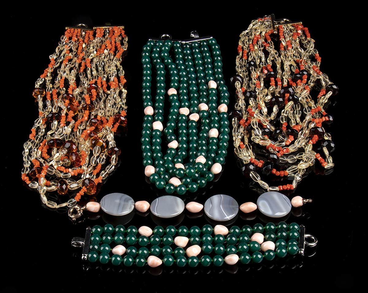 (corallium rubrum and corallium secundum). Collana e bracciale in sfere di crisoprasio e ciottoli di corallo rosa, diametro sfere crisoprasio 10-10,5 mm, lunghezza bracciale 20 cm, lunghezza girocollo 44 cm; 2 girocolli in ciottoli di quarzo citrino, corallo Mediterraneo ed ambra, lunghezze 47 cm e 48 cm; bracciale in ciottoli di corallo rosa ed agate, lunghezza 22 cm. Montaggio in argento 925/1000. Peso totale 768 gr circa. Stato di conservazione: ***** eccellente.