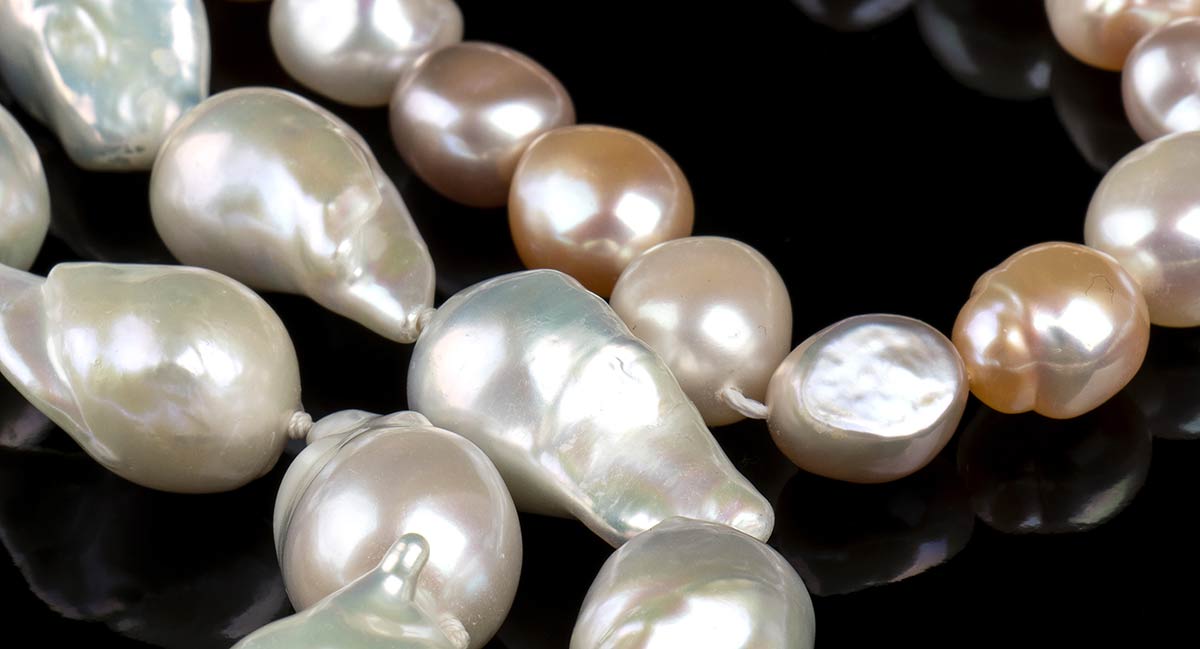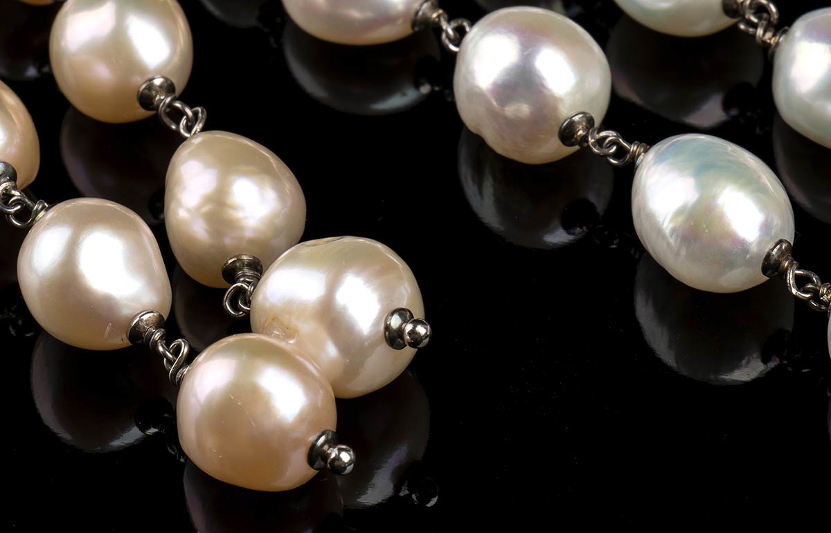 1 collana con perle sferiche, diametro 11-11,5 mm, lunghezza 146 cm circa; 2 collane con perle scaramazze, diametro medio 13 mm, lunghezza 45 cm circa; 1 collana con perle di fiume irregolari, diametro 11 mm, lunghezza 41 cm; 2 bracciali con perle di fiume; 2 paia di orecchini con perle di fiume. Montaggio in argento. Peso totale 516 gr circa. Stato di conservazione: ***** eccellente.