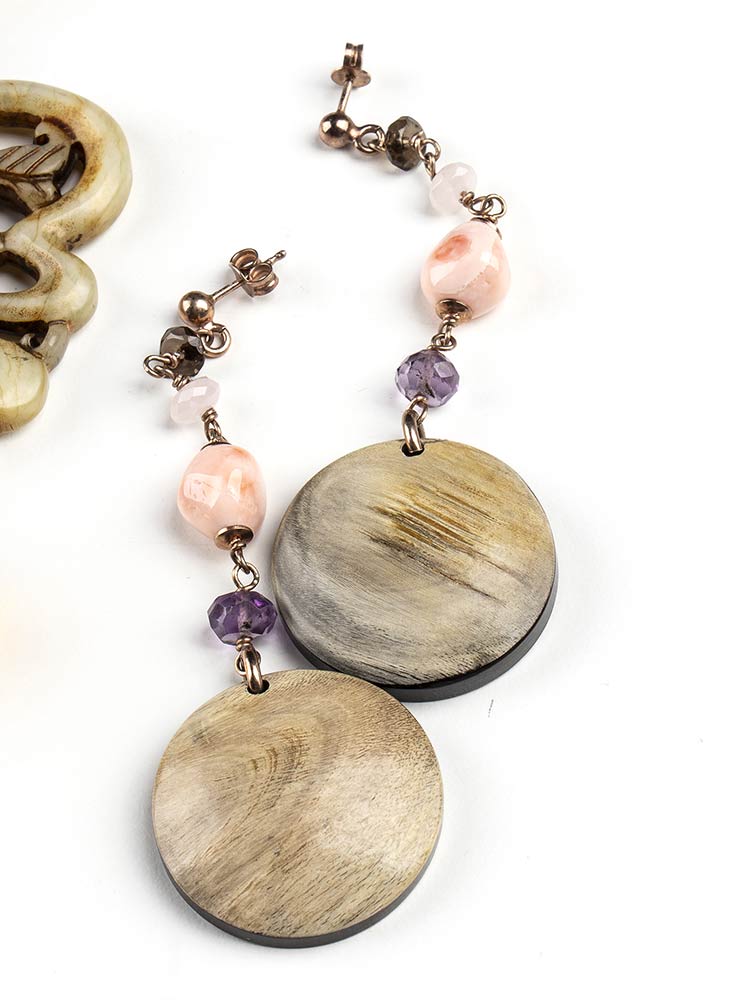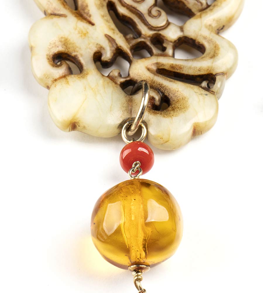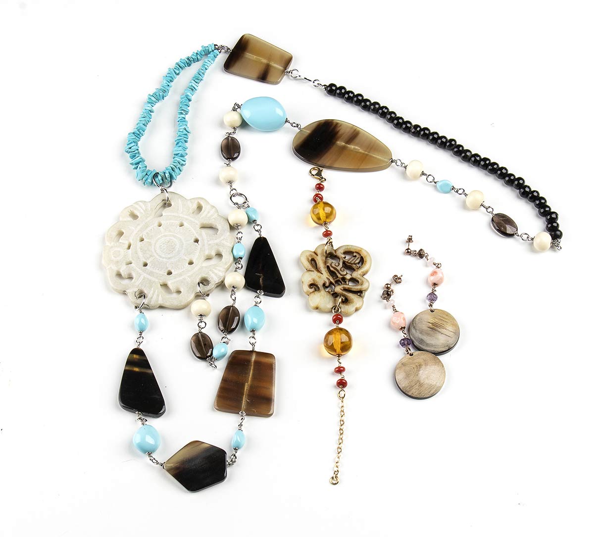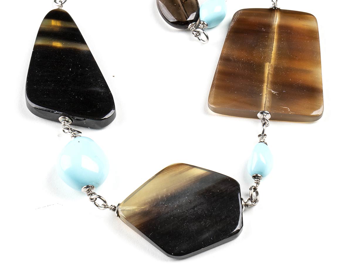 in giada, turchese, pasta di turchese, quarzo fumè, giaietto, ambra chiarificata, osso, corno. Montaggio in argento 925. Peso totale 211 gr. Stato di conservazione: ***** eccellente.