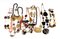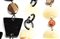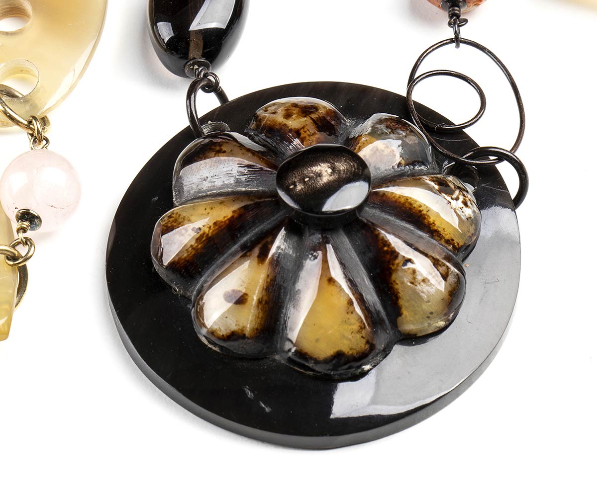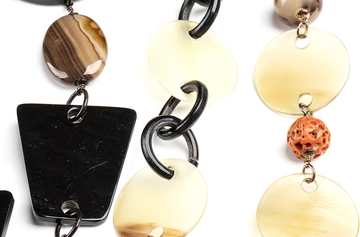 in bachelite, onice, agata, osso, ametista, giaietto, cristallo di rocca, quarzo fumè, corniola, corallo mediterraneo (corallium rubrum), corallo rosa (corallium secundum), corallo mushi. Peso totale 665 gr. Stato di conservazione: ***** eccellente.