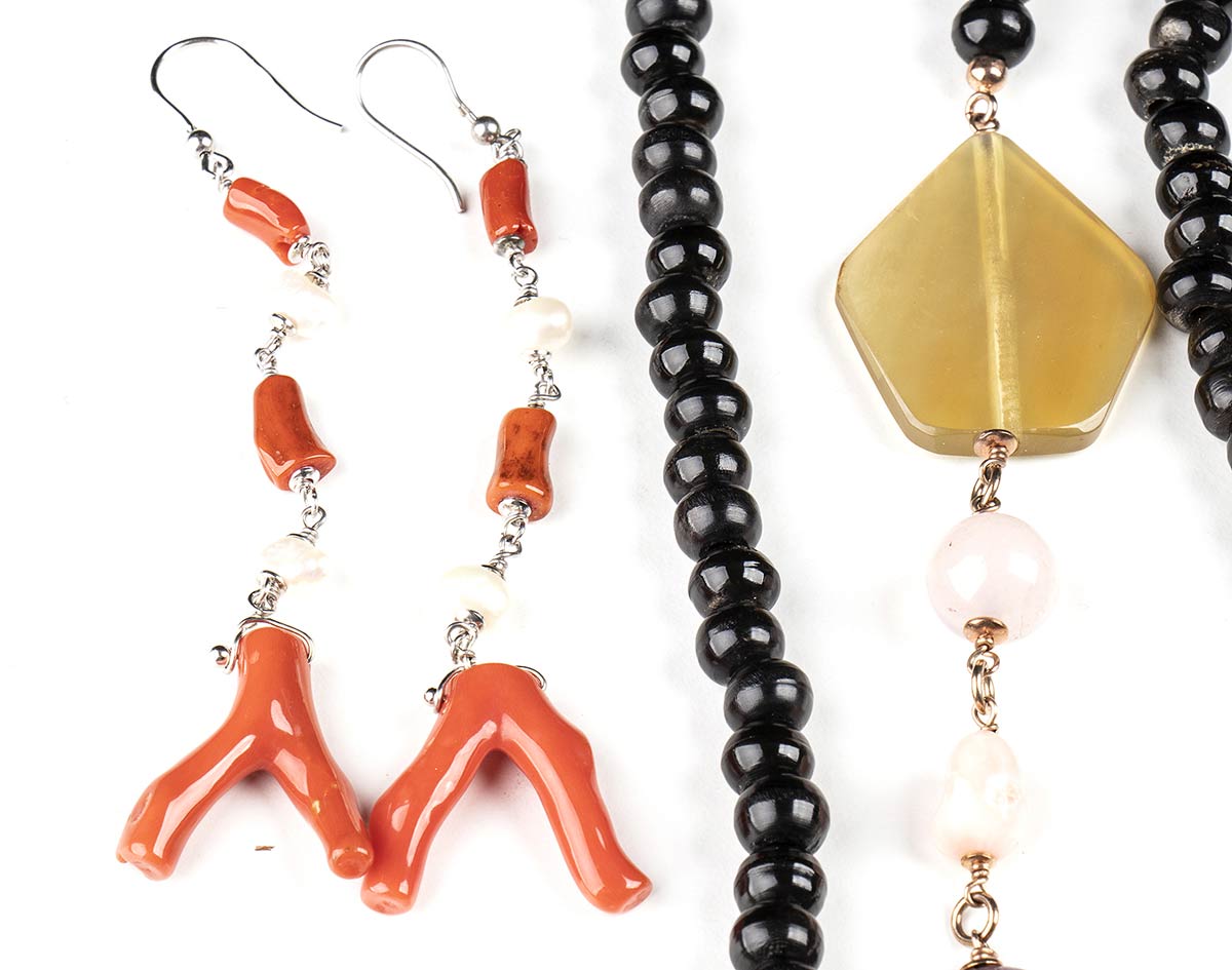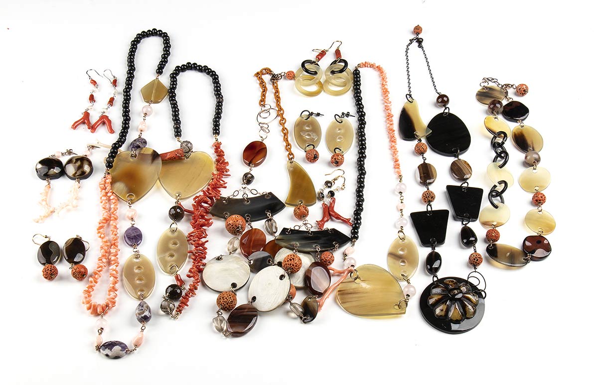 6 collane e 6 paia di orecchini in pietre dure e corallo