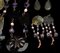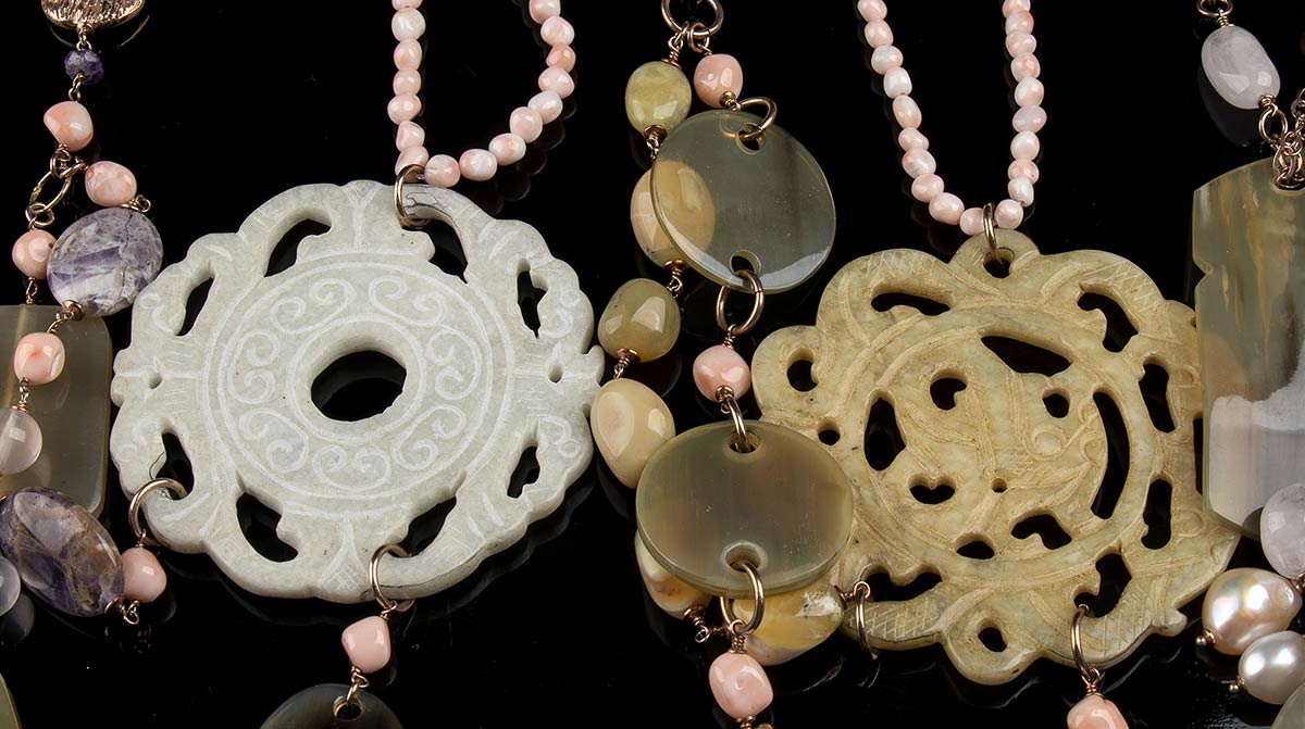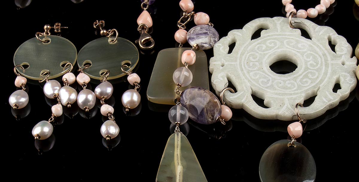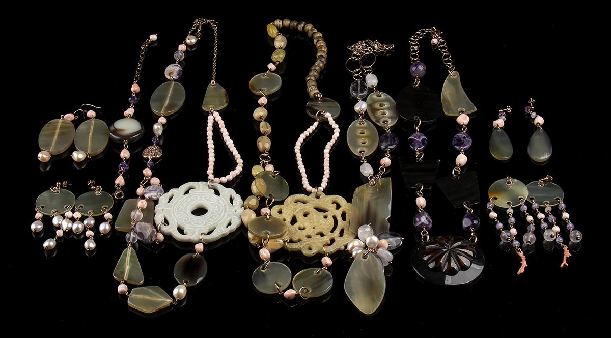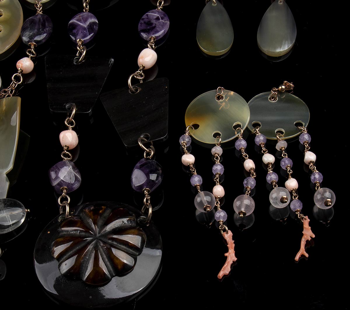 in onice, ametista, bachelite, corno, perle di fiume, cristallo di rocca, diaspro, giada, corallo rosa (corallium secundum). Montaggio in argento 925/1000, dorato. Peso 552 gr. Stato di conservazione: ***** eccellente.