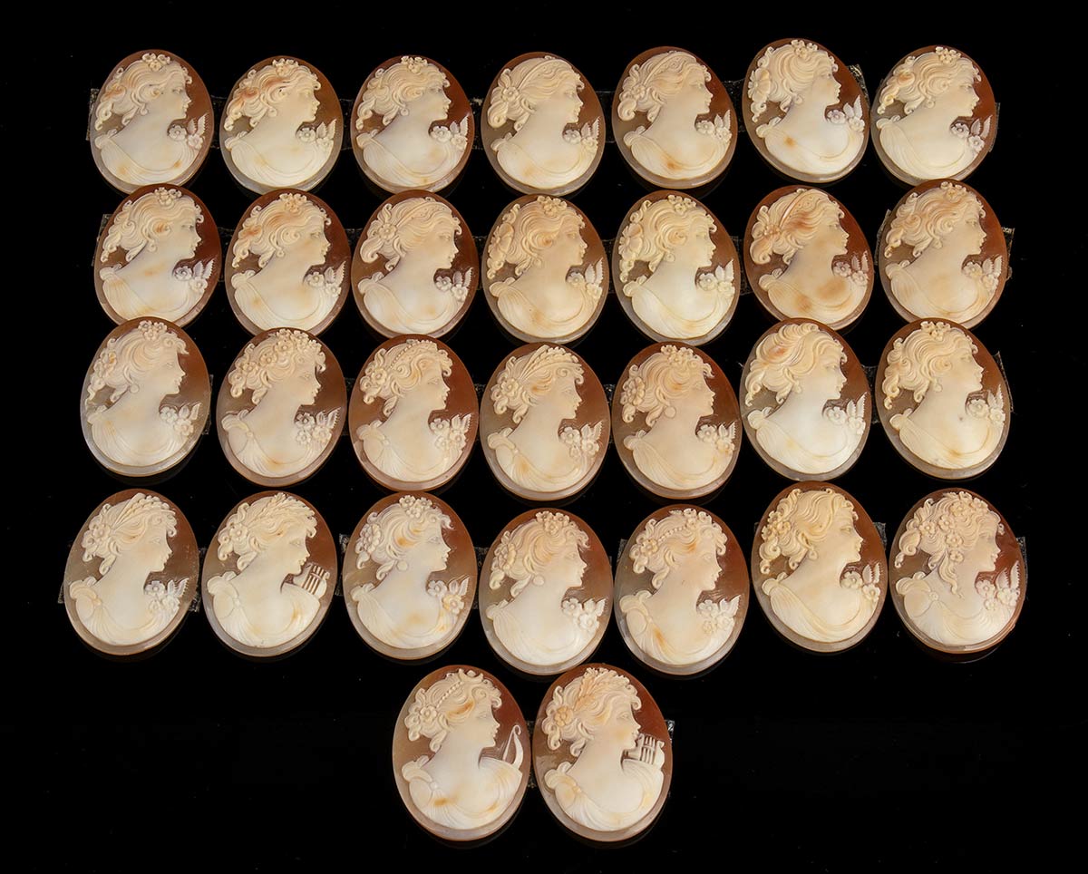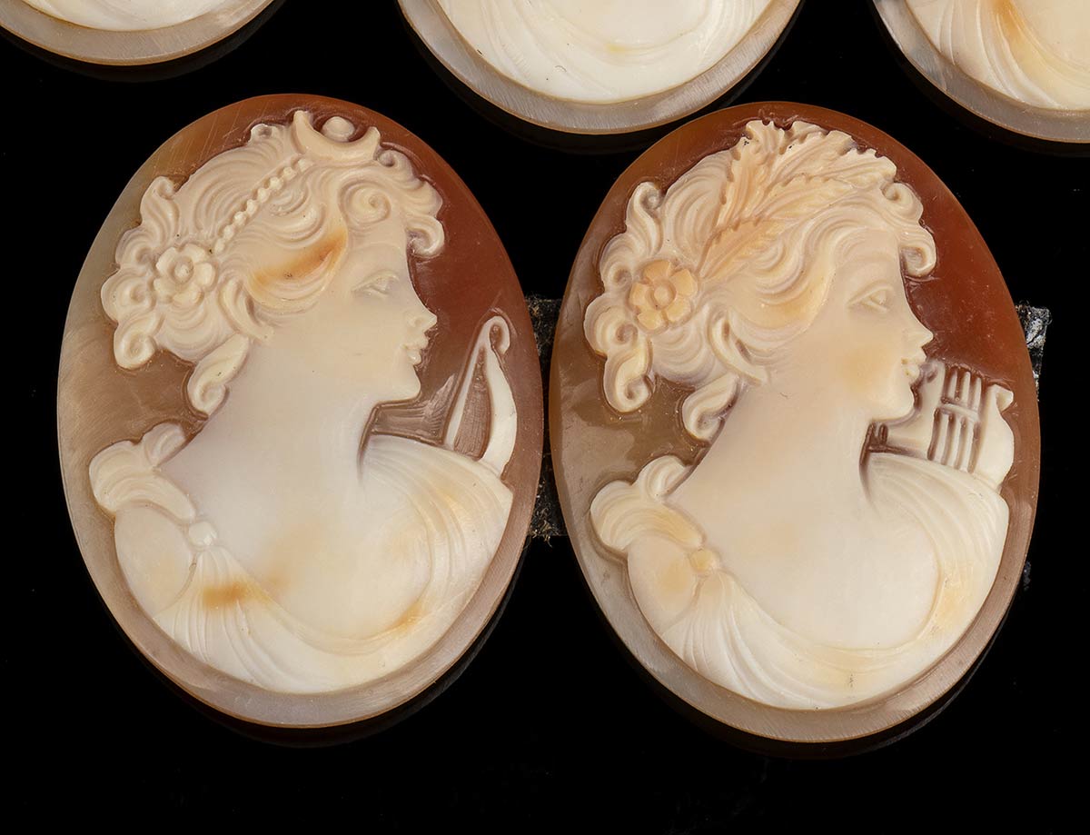conchiglia sardonica (cassis Madagascarensis), raffiguranti profilo di donna volta a destra, dimensioni 40 x 30 mm. Peso totale 157,4 gr circa. Stato di conservazione: ***** eccellente.
