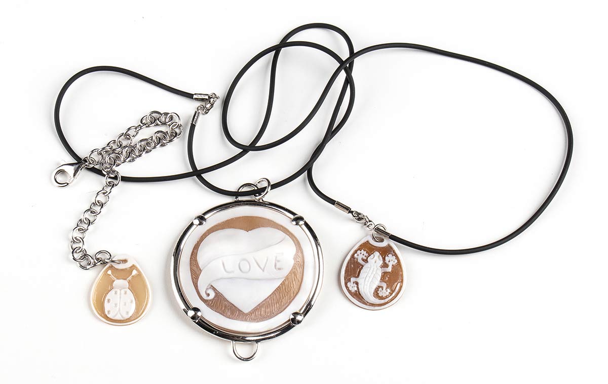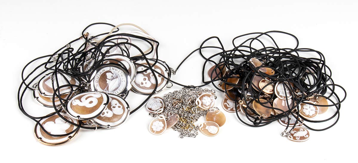 10 bracciali e 25 girocolli con cammeo su conchiglia marina
