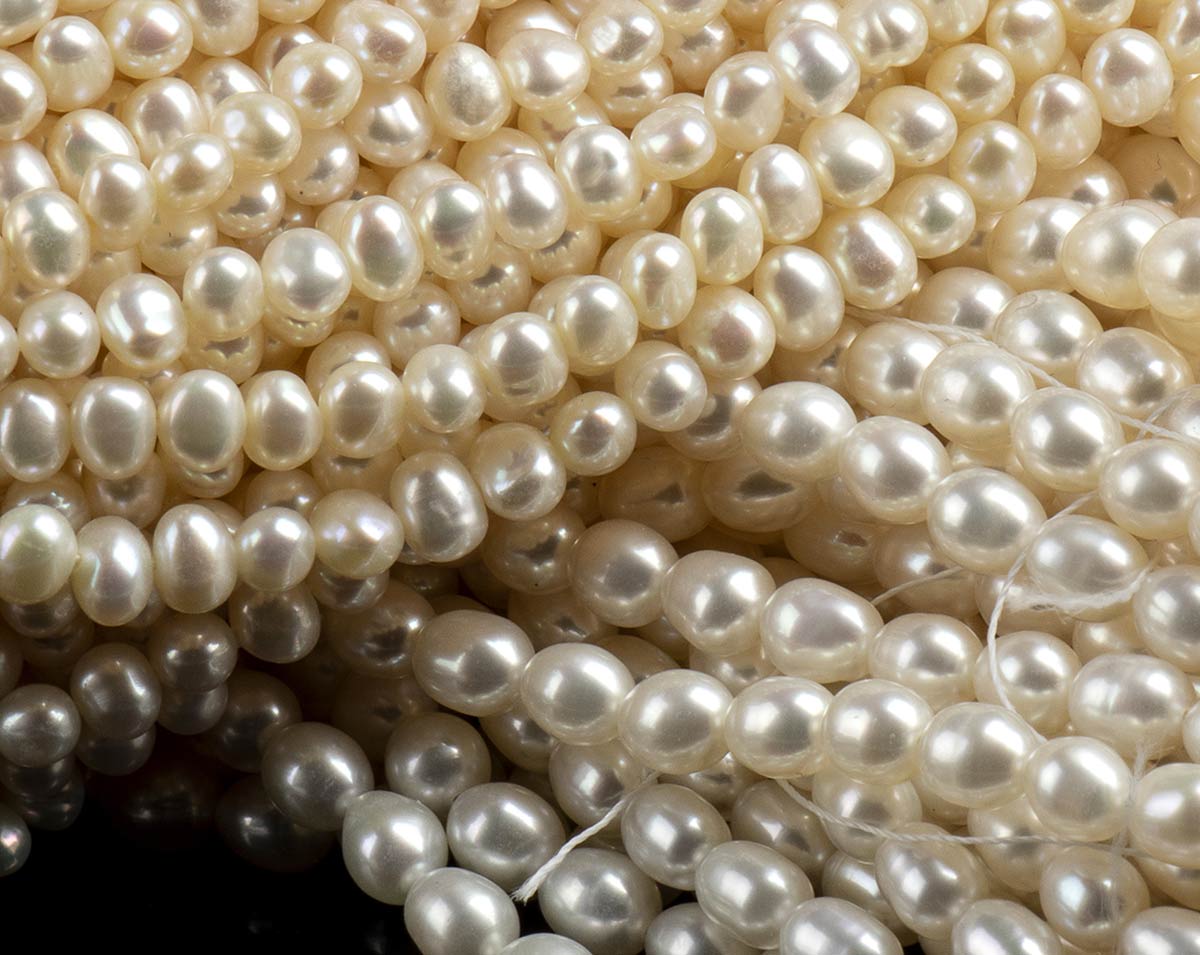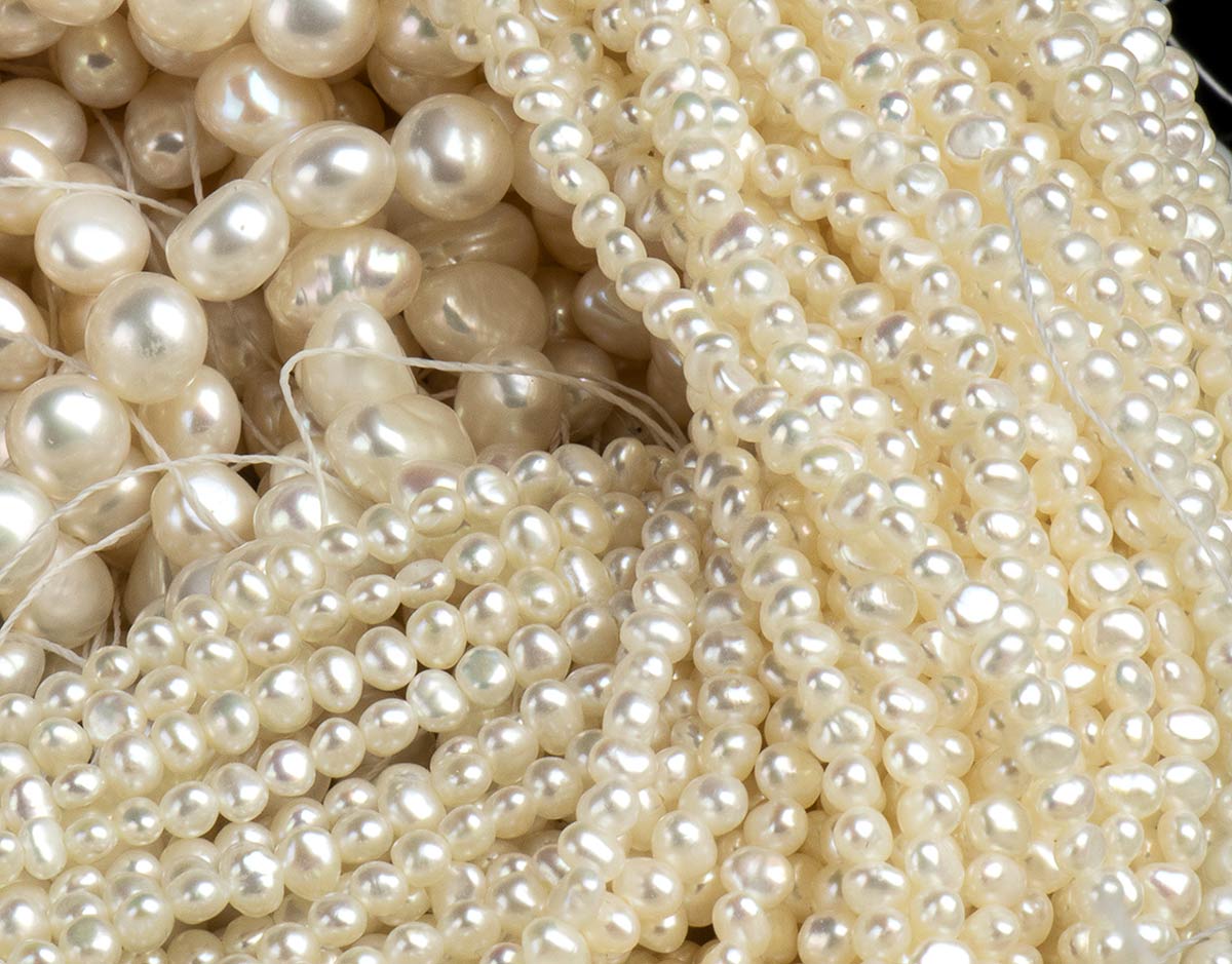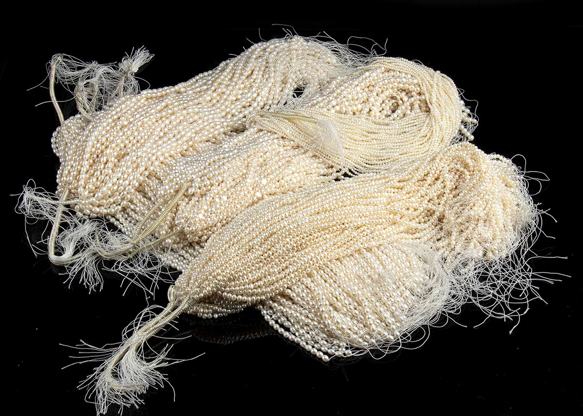 188 fili di perle di fiume ovali, diametro 4,5-5 mm, lunghezza 41 cm, peso totale 2720 gr circa; 48 fili di perle di fiume cipster diametro 2-2,5 mm, lunghezza 41 cm, peso totale 204 gr circa; 48 fili di perle di fiume cipster, diametro 4,5-5 mm, lunghezza 41 cm, peso totale 155 gr circa; 46 fili di perle di fiume cipster, diametro 5,5-6 mm, lunghezza 41 cm, peso totale 859 gr circa; 102 fili di perle di fiume cipster, diametro 5-5,5 mm. Lunghezza 41 cm. Peso totale 1200 gr circa. Peso complessivo 5138 gr circa. Stato di conservazione: ***** eccellente.